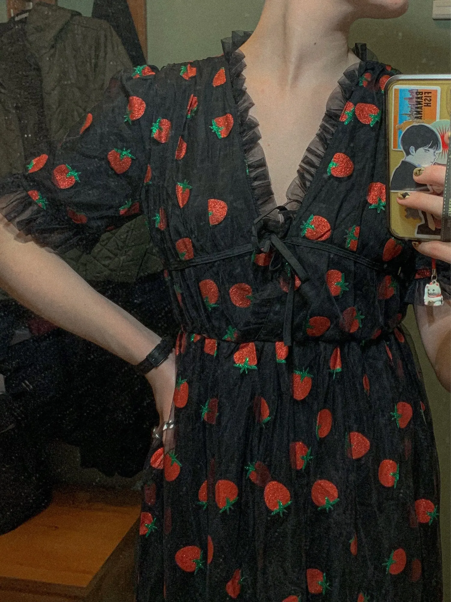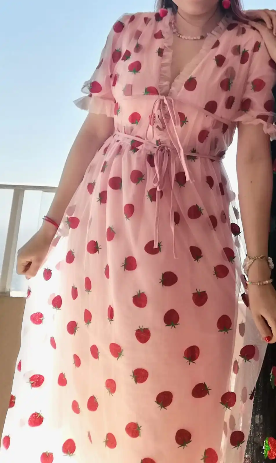FREE SHIPPING Strawberry Mid Length Party Dress Whit Belt OUT0938