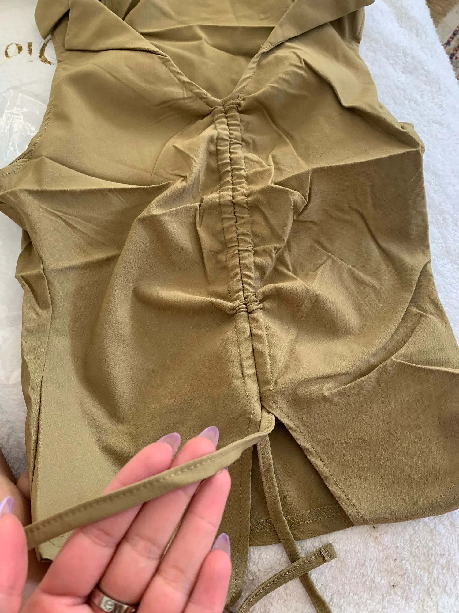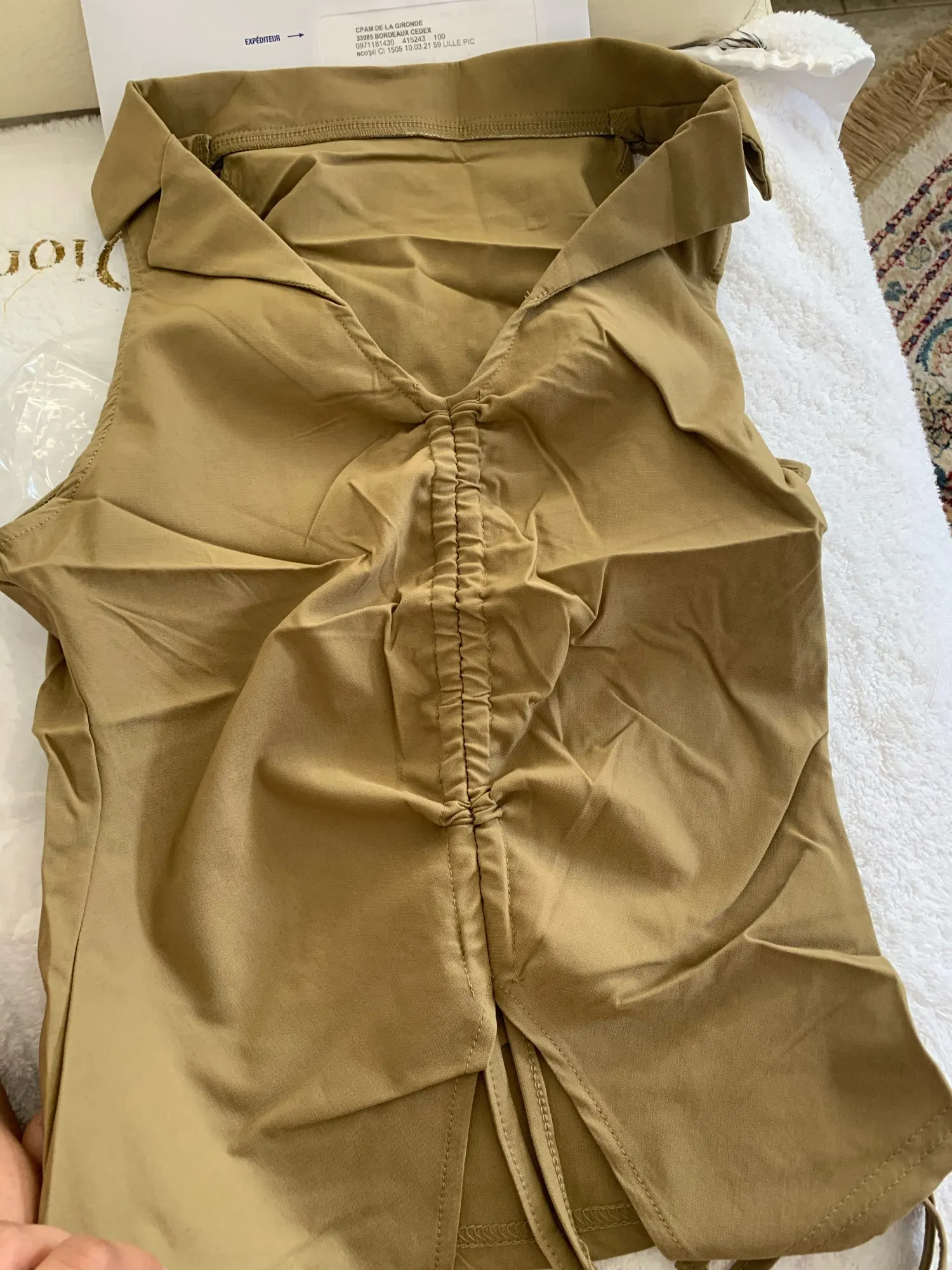 I got the green one in a small, for reference I’m 153cm 49kg and a 32B bra size. It’s a little difficult to get on and off and the material has no stretch so just be wary of that, it might be because I have kind of wide shoulders haha. Once it’s on though it’s perfect, decent quality for the price too :)