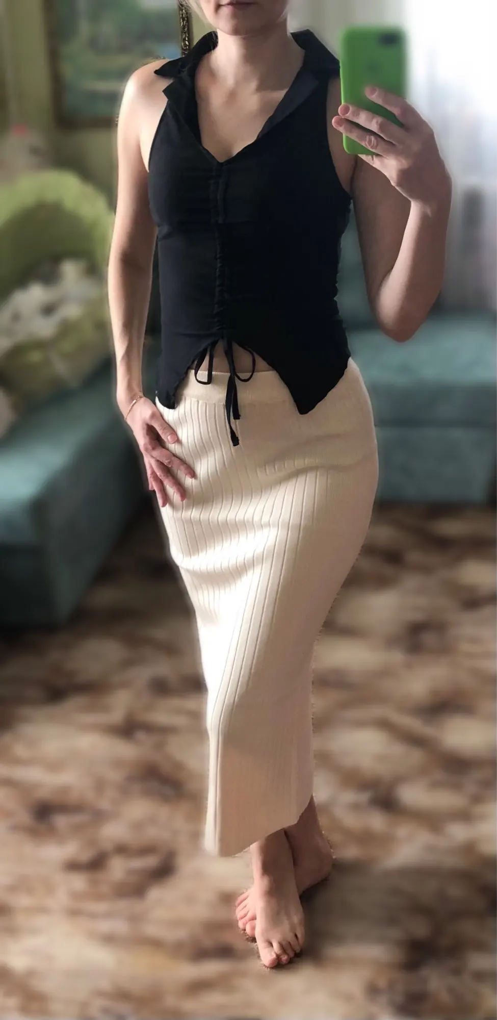 this shirt is very cute and flattering. Soft and fits really well. It’s not that stretchy. My bust is 36 inches and waist is 28 inches and it was a bit tight. I got a L :))