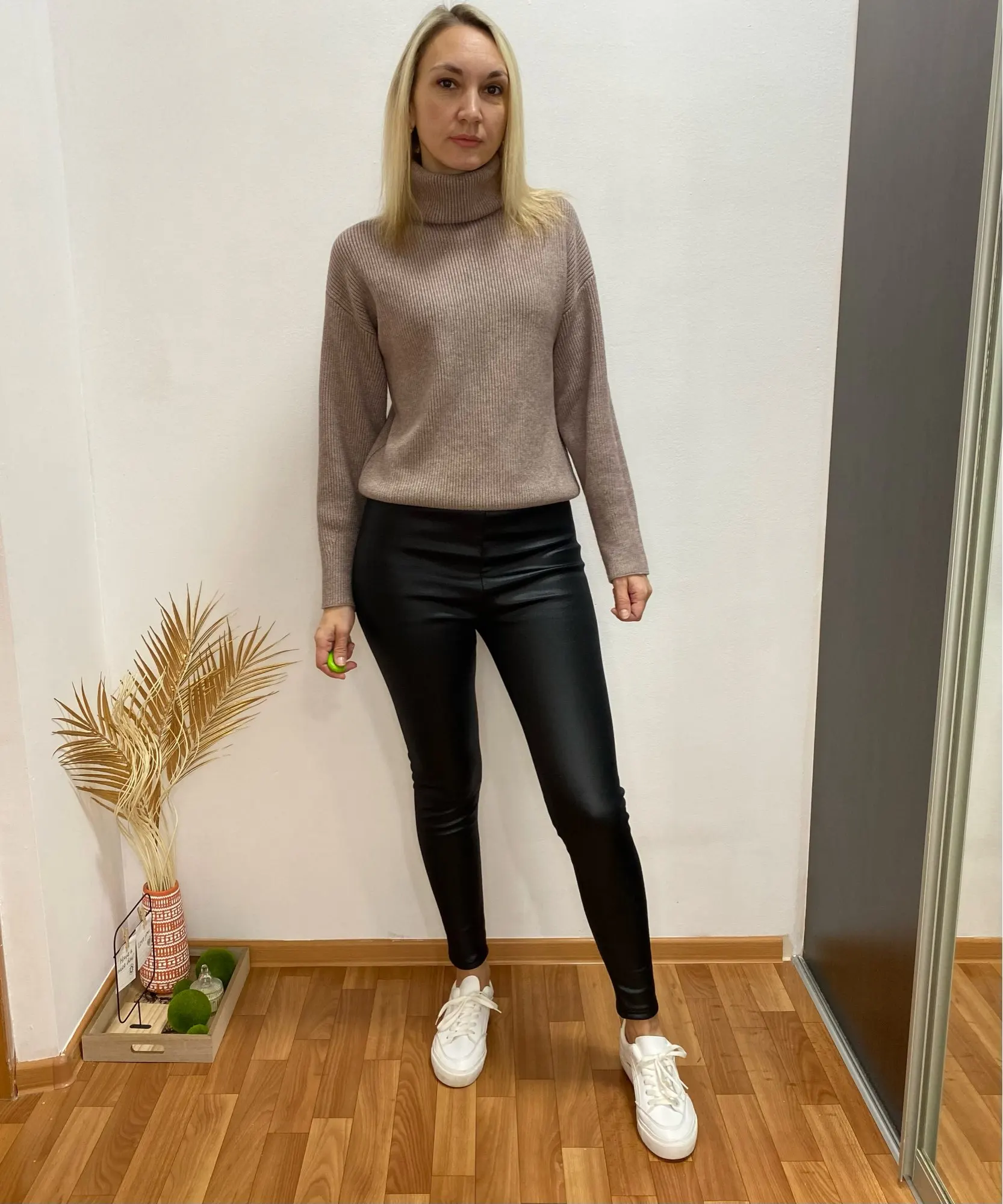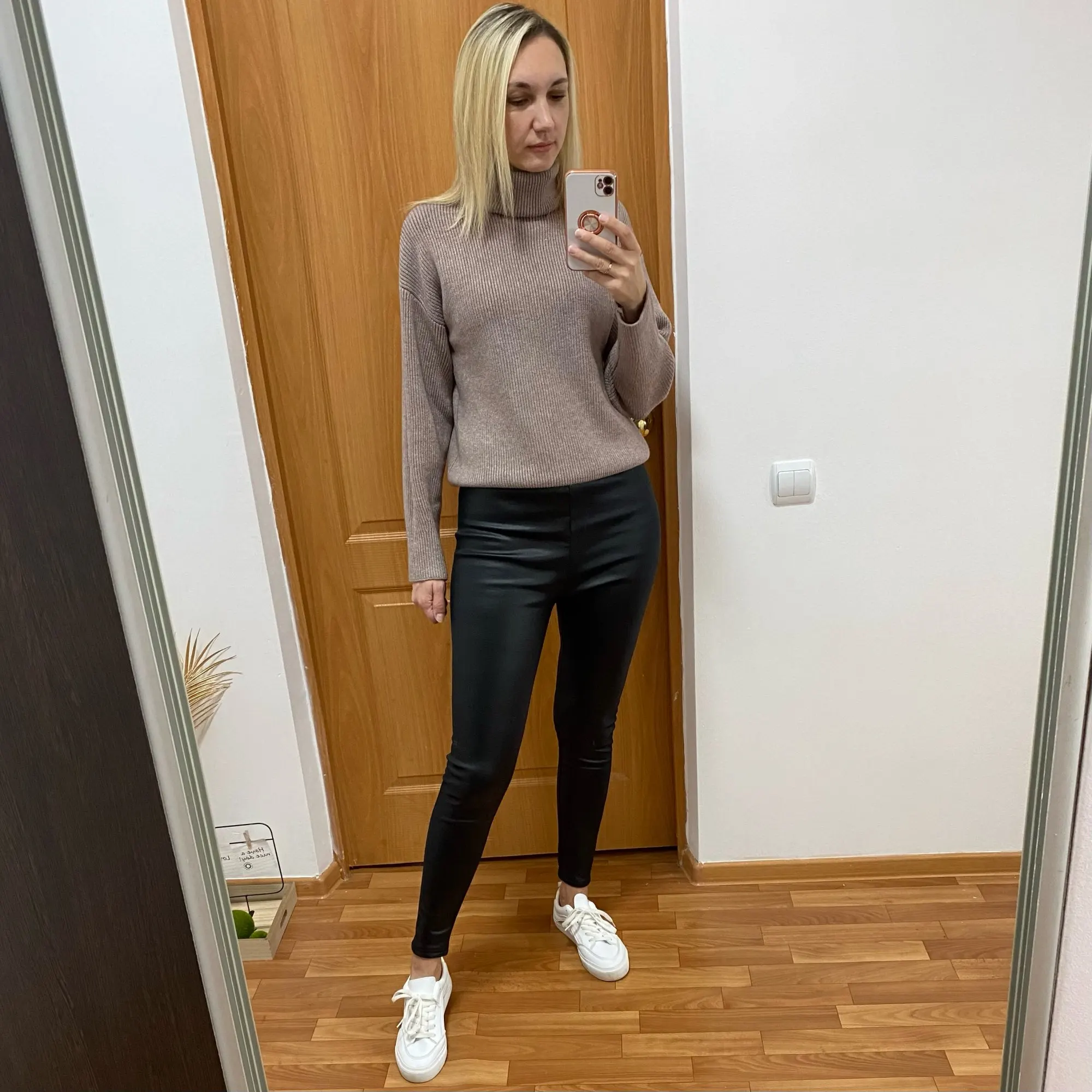 Визуально выглядят действительно как кожаные, но слава Богу такими не являются, это, безусловно, плюс! Думала начёс будет толще, надеюсь на обычную сибирскую зиму будут тёплые. Посадка не совсем удобная, ноги в обтяг, на талии немного свободные, хотелось бы талию повыше, а то при наклонах немного сползают. Белье, конечно, нужно бесшовное с ними. Размер брала 3XL на российский ближе к 48, бёдра 100 см. На 50 это нужно сильно постараться, чтоб натянуть, сомневаюсь что подойдёт больше 48 размера..Вообщем я довольна, смотрятся хорошо и дорого! За такую цену просто сказка! Спасибо продавцу и Али!)