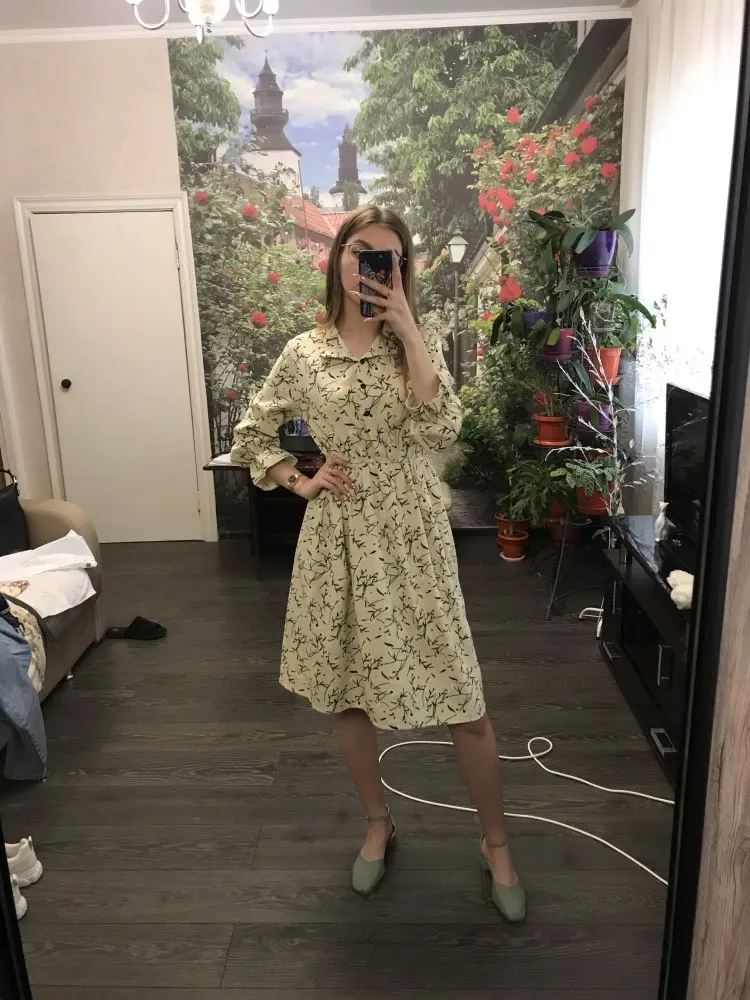 Nice dress. Cloth is dense, for the summer I think it will be hot. On my height 180 to the knee, parameters 60/100. Sleeve long