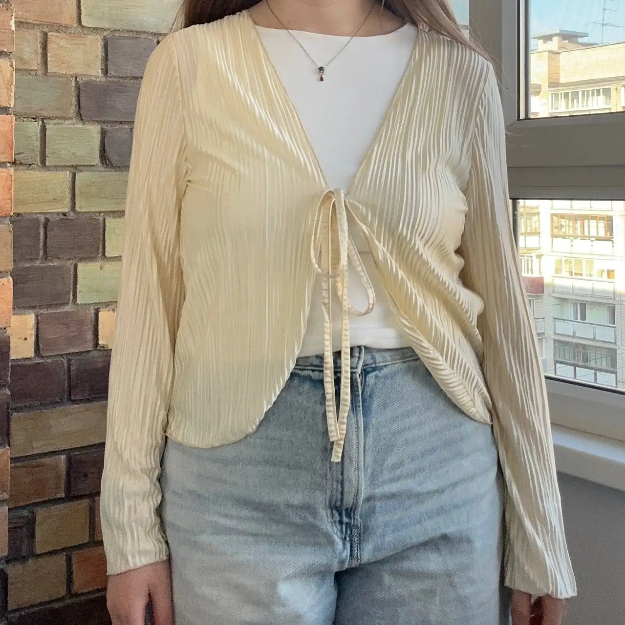 Beautiful cape, light yellow color. Size M fits 91-75-97 cm, 66 kg, height 163 cm, but if you like it loose, it's better to take a size larger.