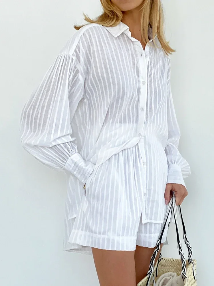 Stay effortlessly chic this season with our striped jacquard 2-piece shorts set featuring a lantern sleeve lapel shirt and elastic waist shorts. Designed for both comfort and style, this lightweight summer outfit is perfect for vacations, beach days, casual streetwear, or lounging in style. The relaxed oversized shirt pairs perfectly with the high-waist shorts for a flattering yet cozy look. Ideal for travel, daily wear, and resort fashion, this striped co-ord set is a must-have for modern minimalists.