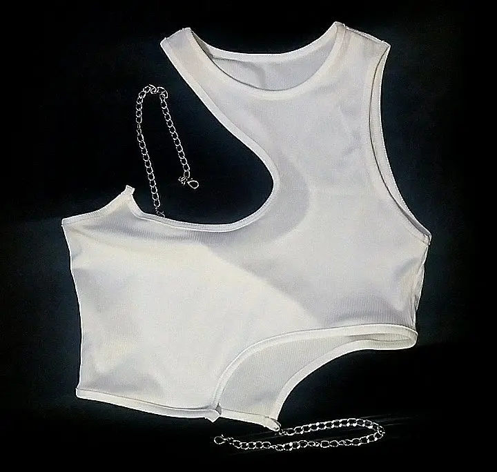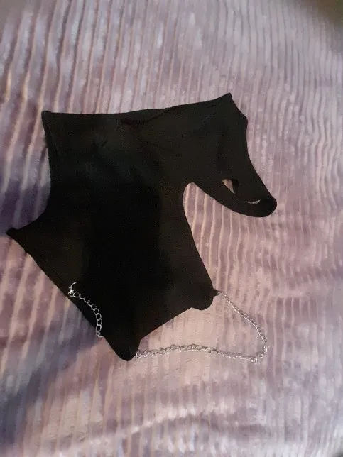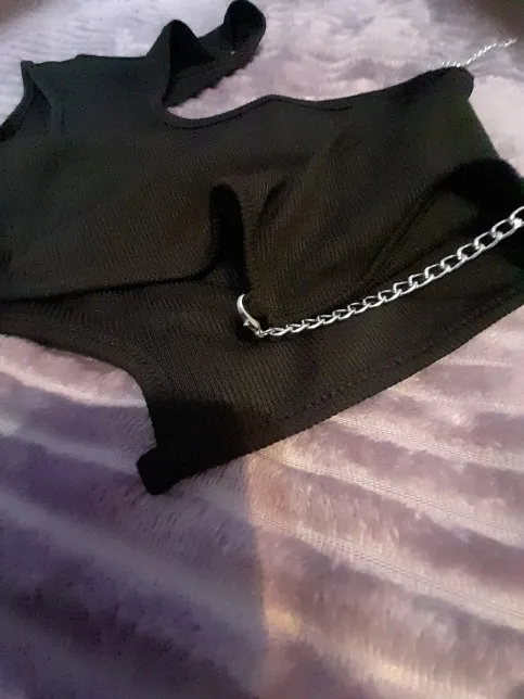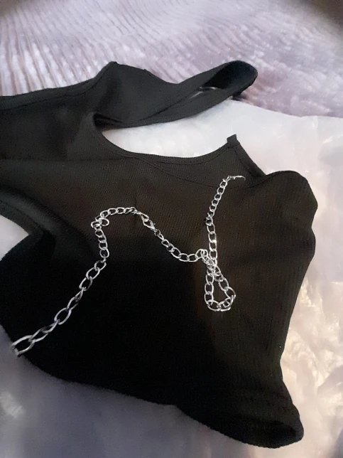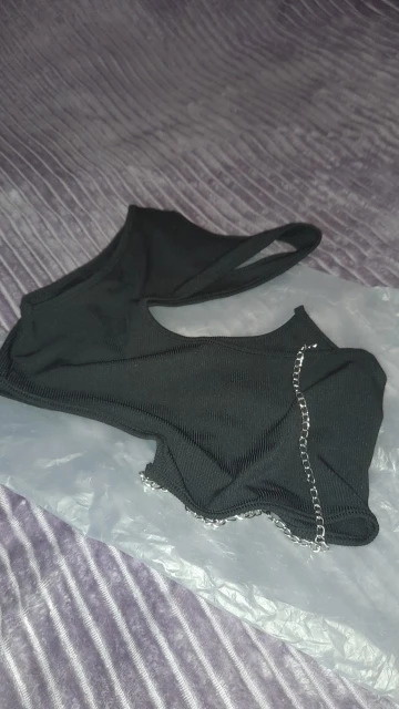 Stylish asymmetric top with chains. Ribbed fabric (polyester 95% is on the label, but pleasant to the body). It is better to put the chains on one side before dressing, and then fasten on yourself🤍