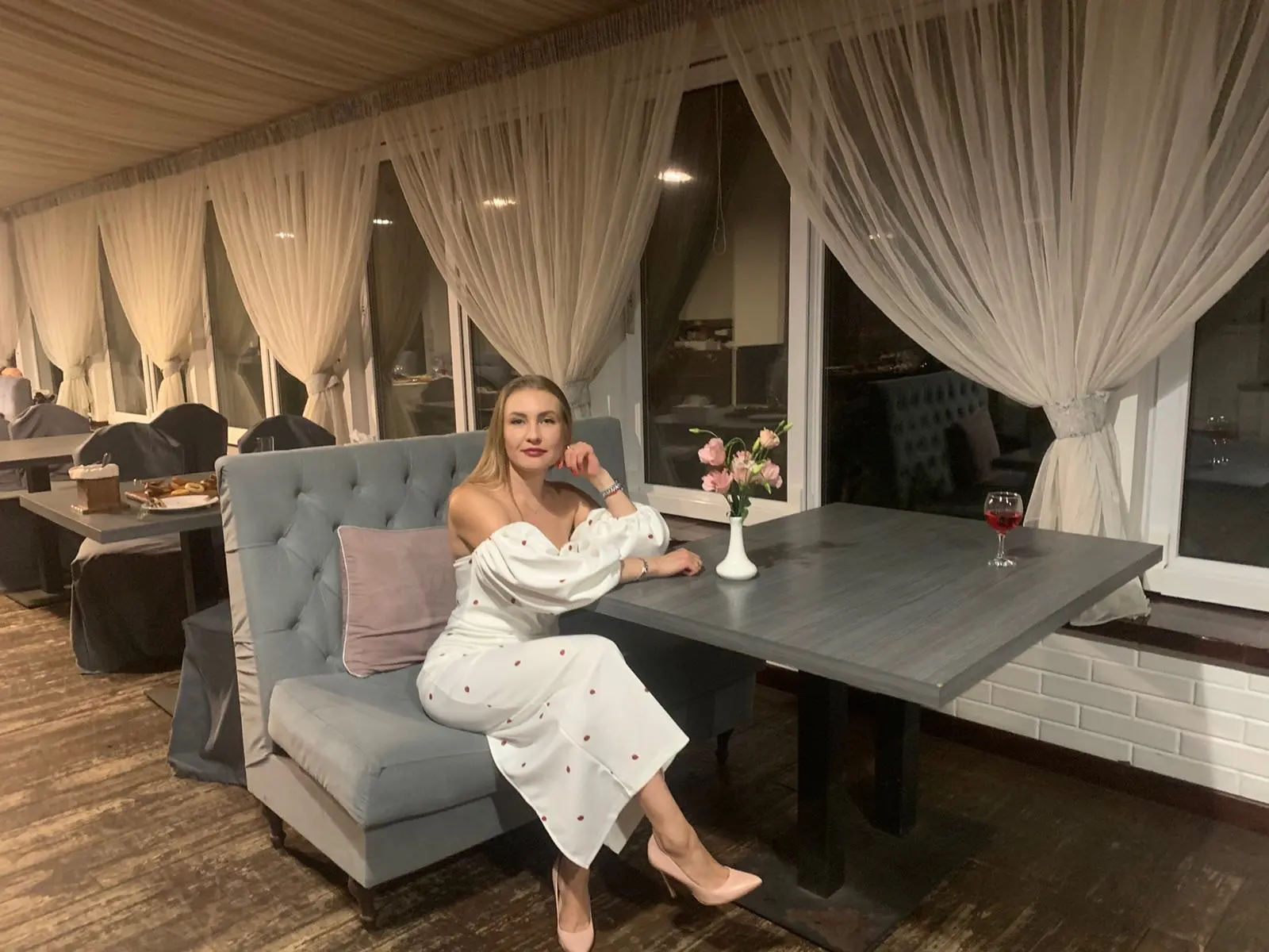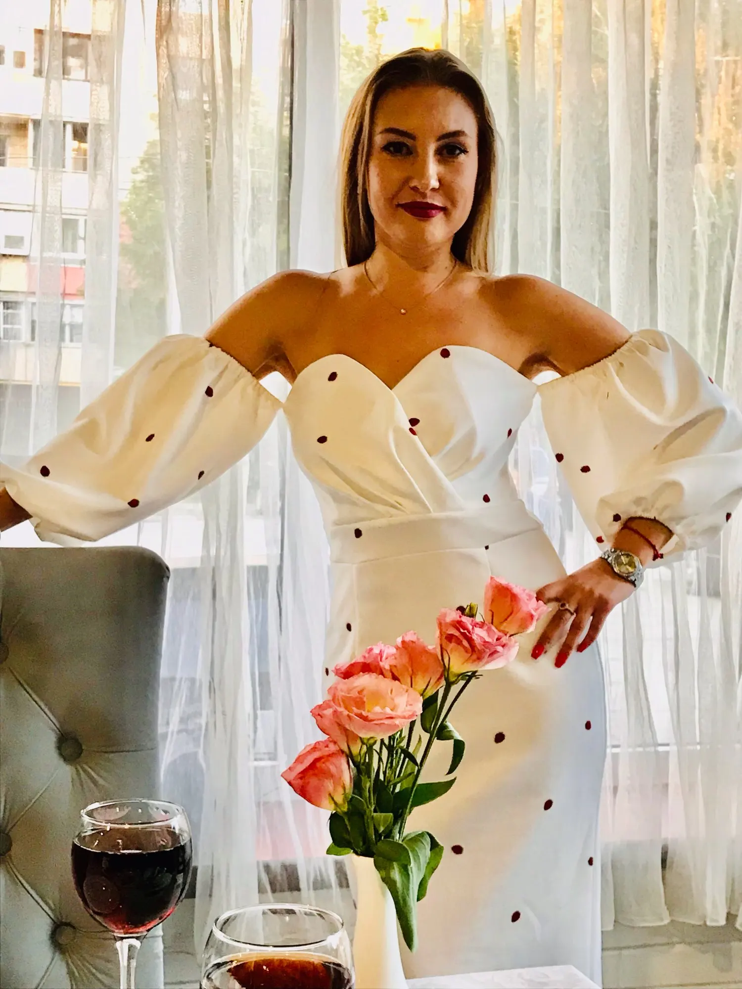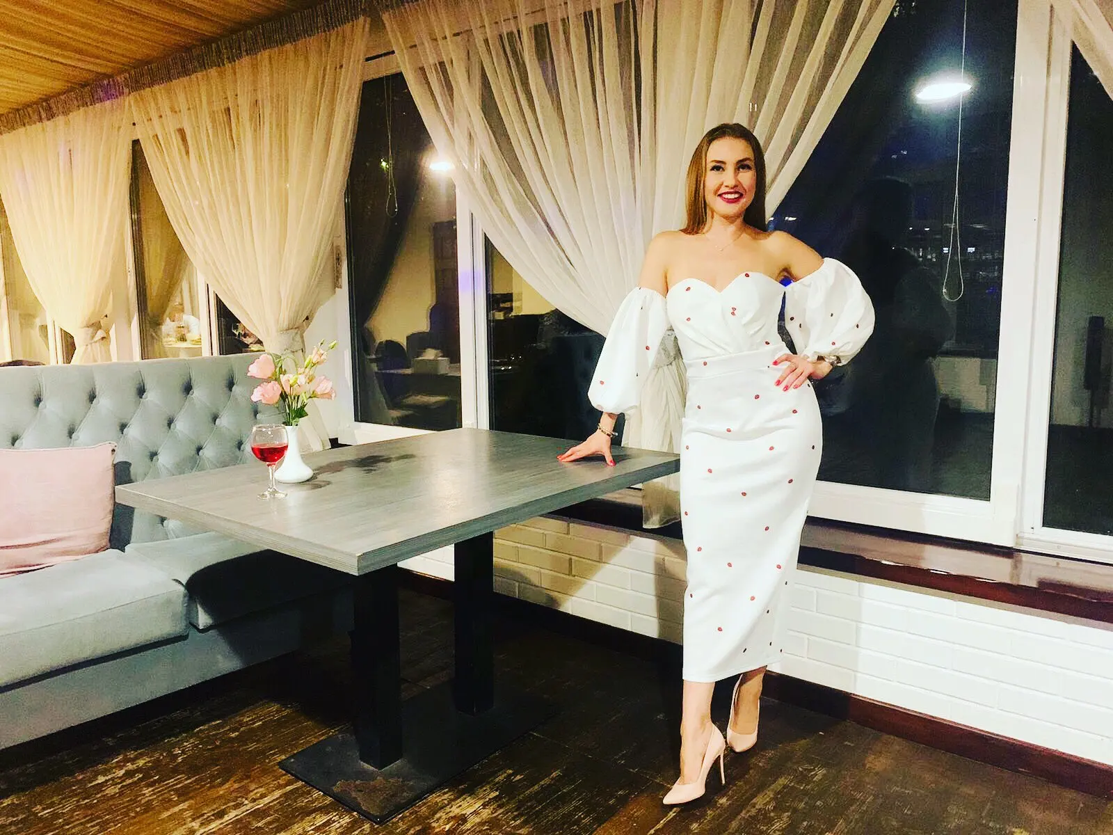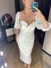 Oooochen beautiful dress. sewing neat. A beautiful style, so that the sleeves of the flashlight are more magnificent, as on the model, you can apply the tulle, then there will be a shape of the flashlight .. the fabric the fabric dress in white, under seamless underwear will be better. On the height of 165 cm. The length of the dress is just above the ankle. I took the size of M. it was possible and S. The store is very responsible, helped with the size answered all the questions, the order sent quickly. thank you very much for the good service.