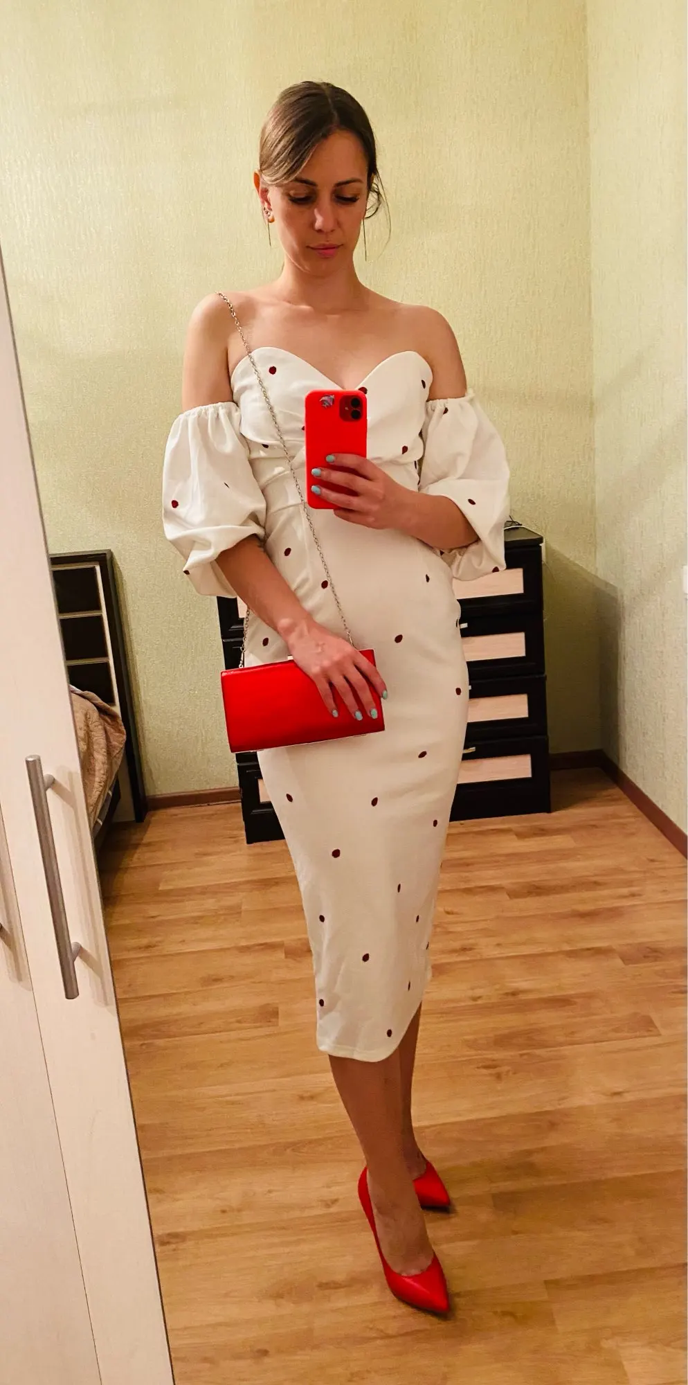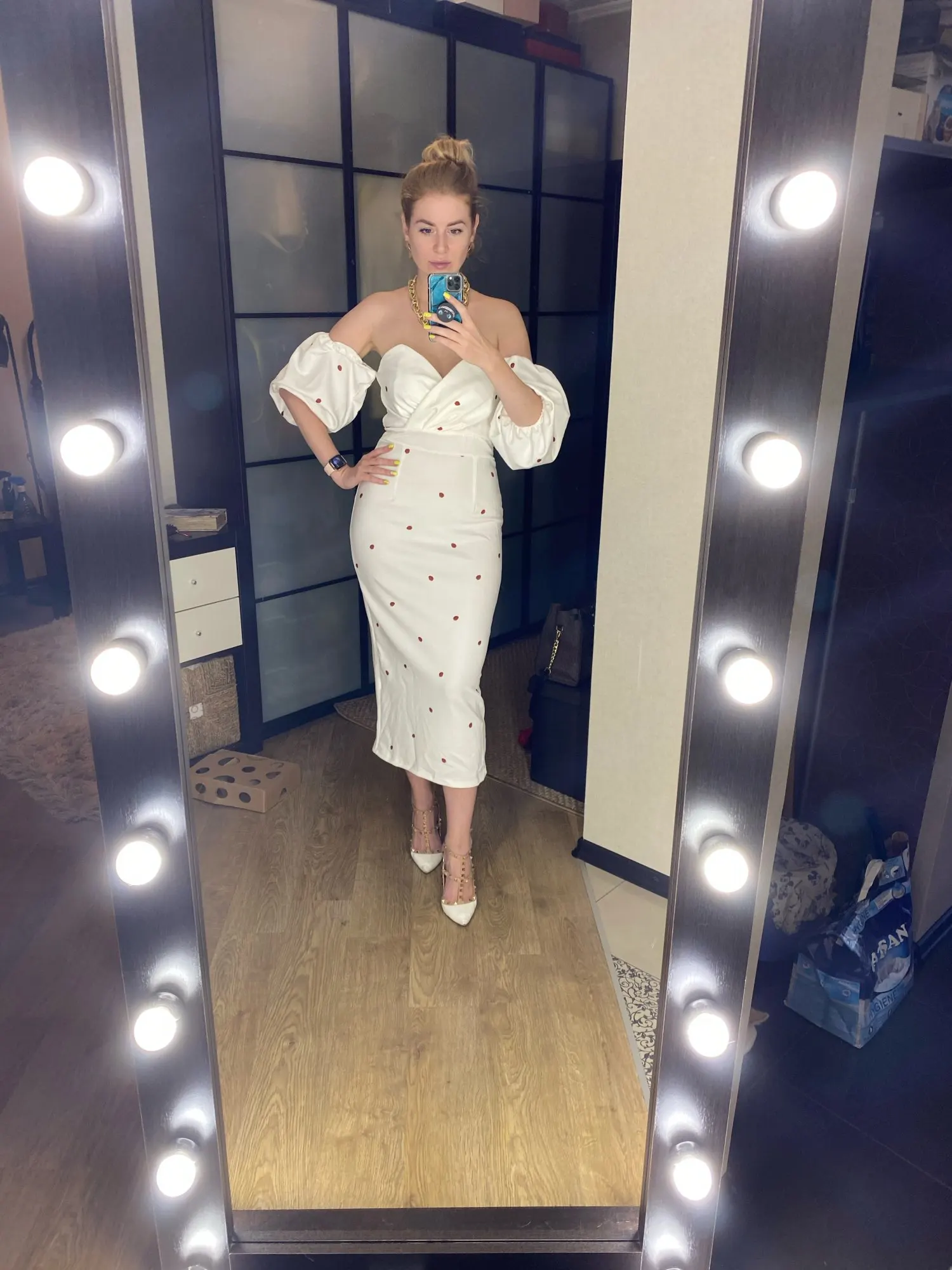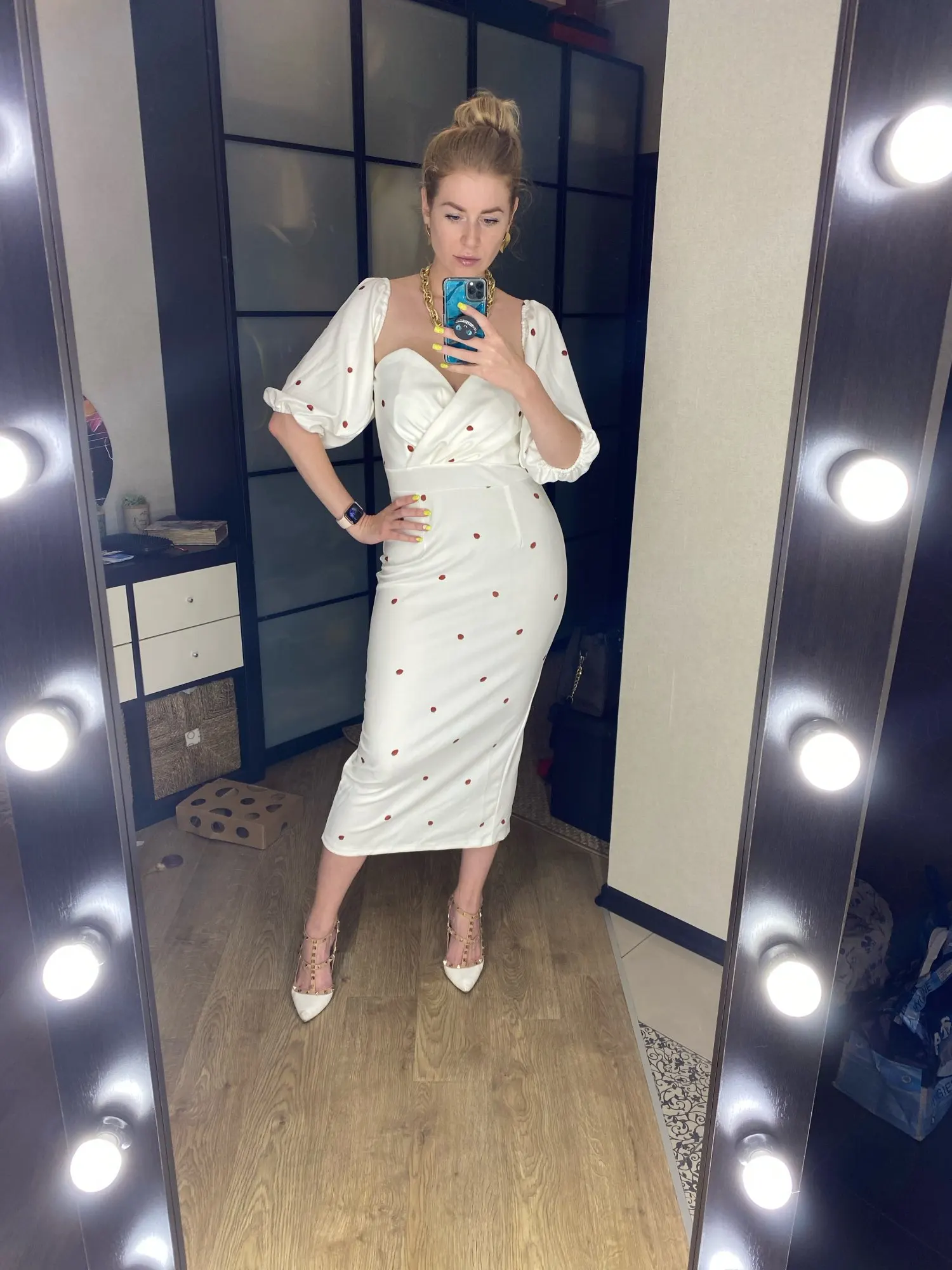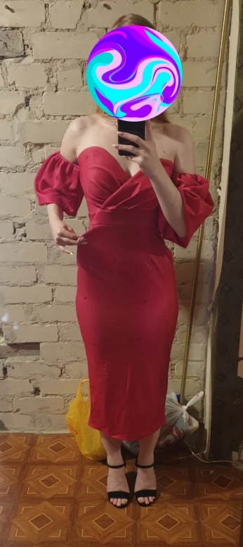 За свои деньги платье хорошее. Рост 160, ношу обычно xs. Проблему с висящими и не объёмными рукавами решила так: подвернула их вовнутрь, чтобы нижняя резинка прилегала к верхней, для удобства можно изнутри ещё закрепить булавочками (ну, или сшить, но у меня руки не из того места растут, поэтому мне такой вариант не подходит). В талии мне немного великовато, не критично, но на спине ткань собиралась. Широкий ремень решил эту проблему, плюс сделал верх платья более статичным (перестало крутиться или съезжать). Ремень заказывала в инстаграме @base_leather
