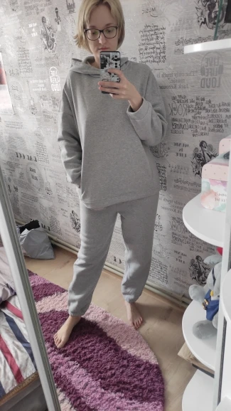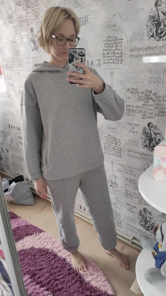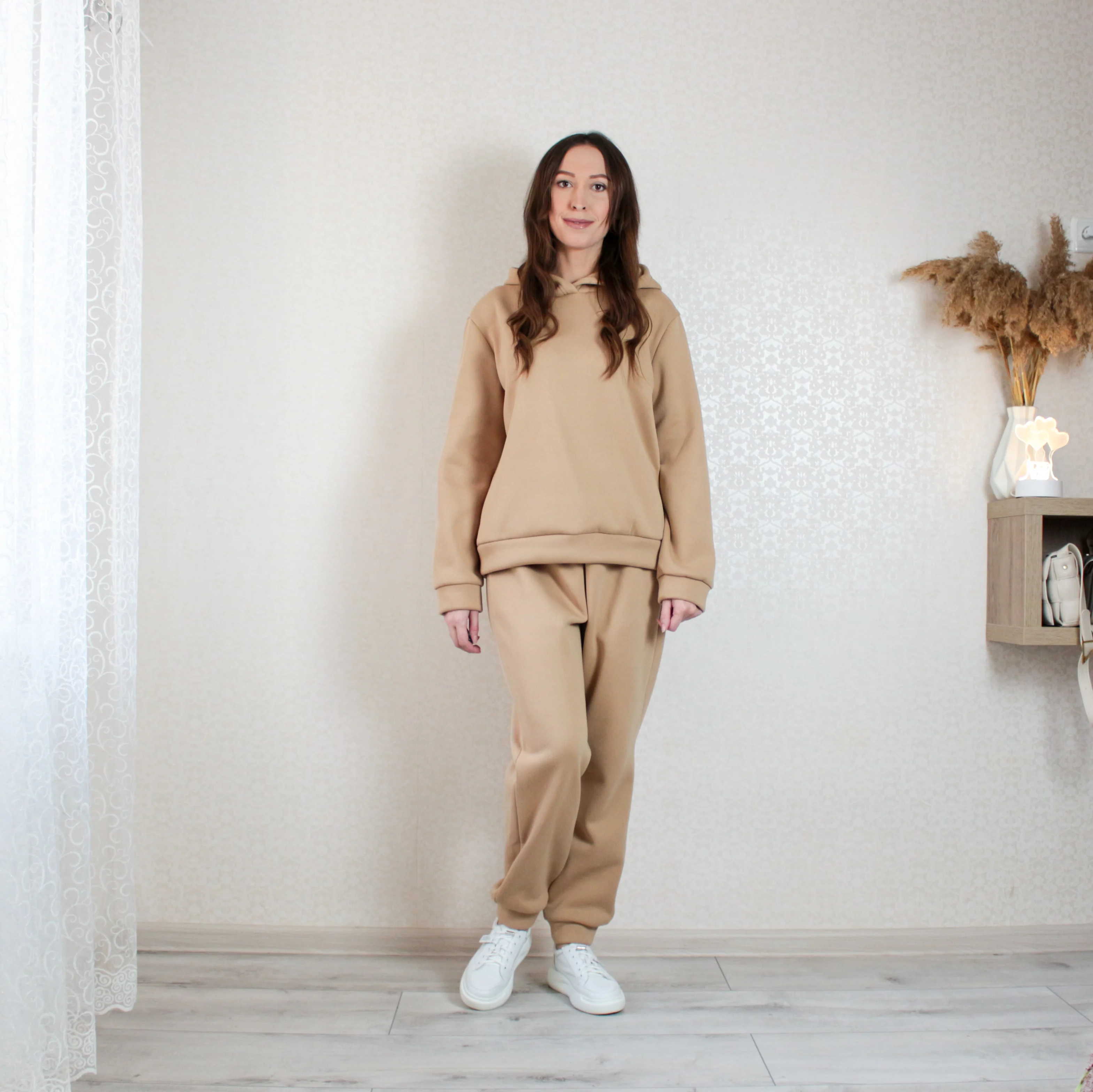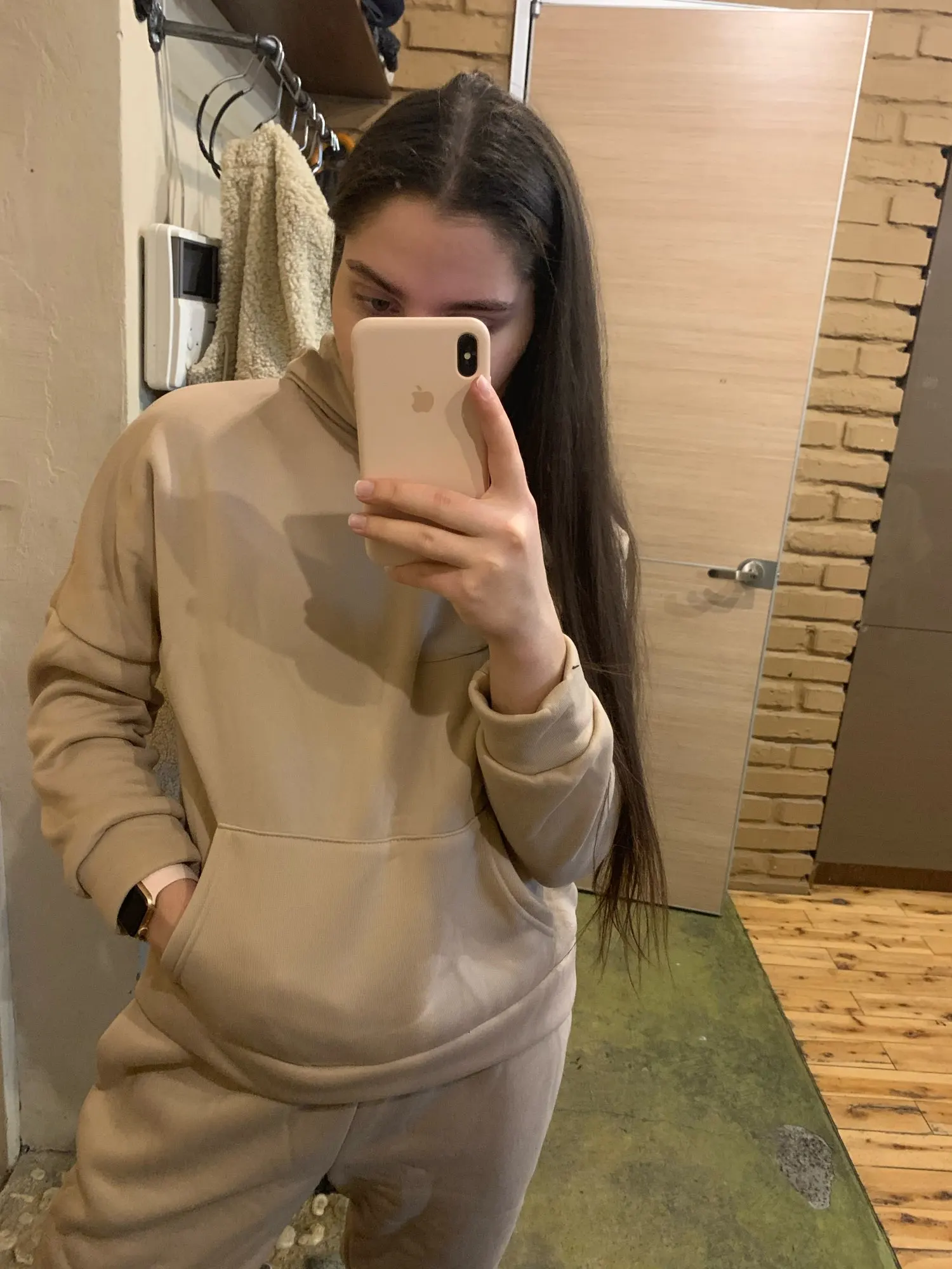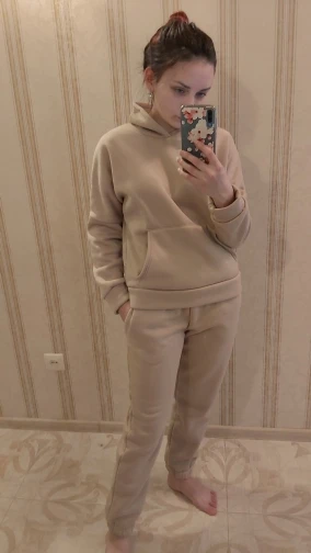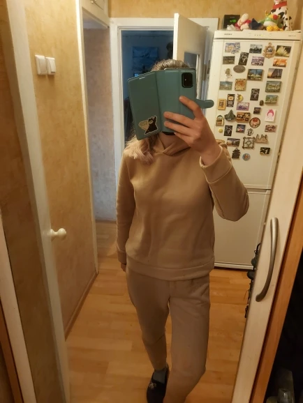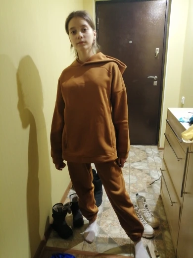 Insta milka_pon Very cool suit! The fabric is unexpectedly pleasant, looks great, it's cotton on fleece. The shade of coffee was more beige or even mustard, but still looks beautiful in life. Full base. It's nice that the costume is not small. I ordered M for parameters 89-67-92, height 168 cm, the suit almost perfectly approached me. Pleased that the length of the pants is chic (even for growth about 170 will be norms). But I'm very free at the waist, the elastic band is loose. It would be better to fit the size s.