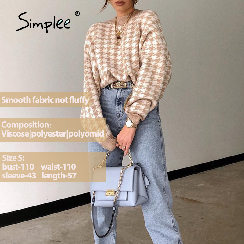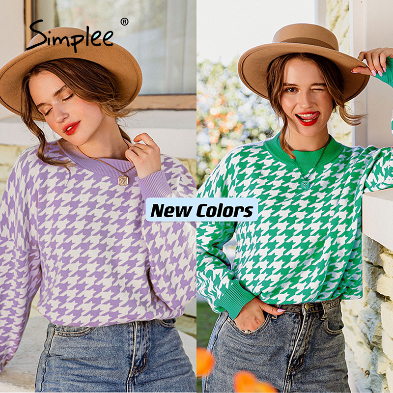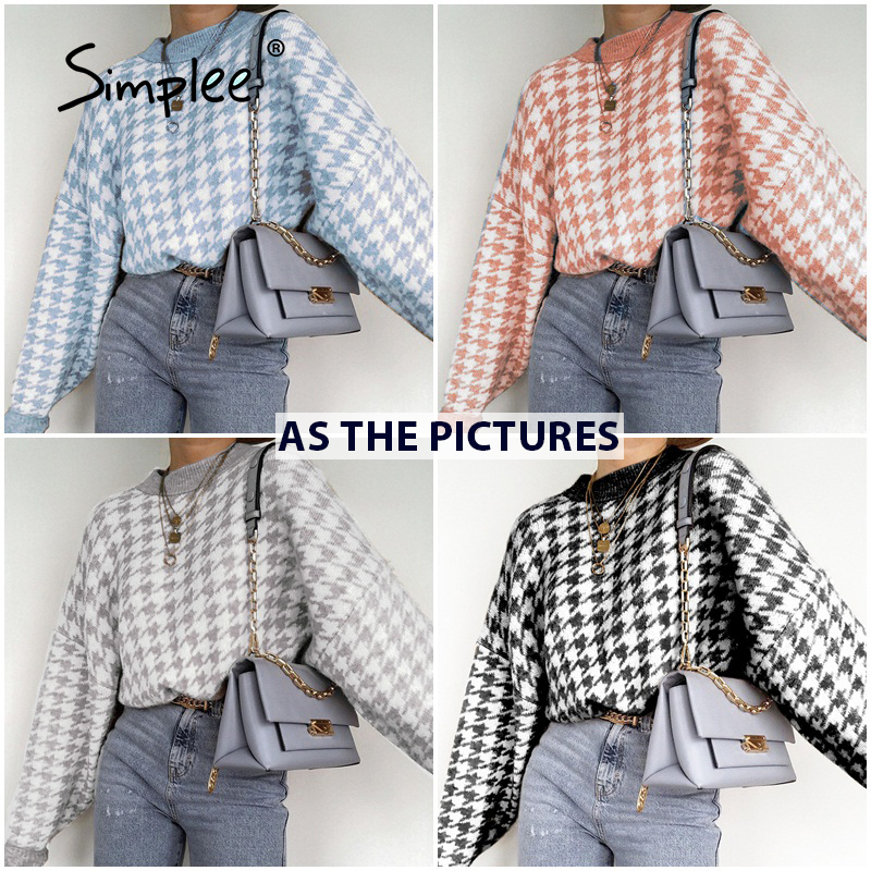 FREE SHIPPING Women Houndstooth Pattern Knitted Sweater OUT0909