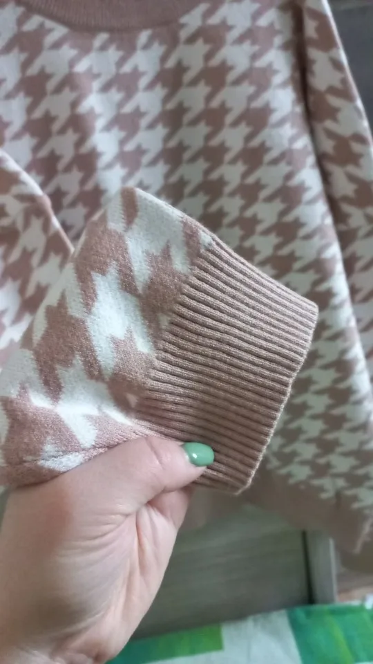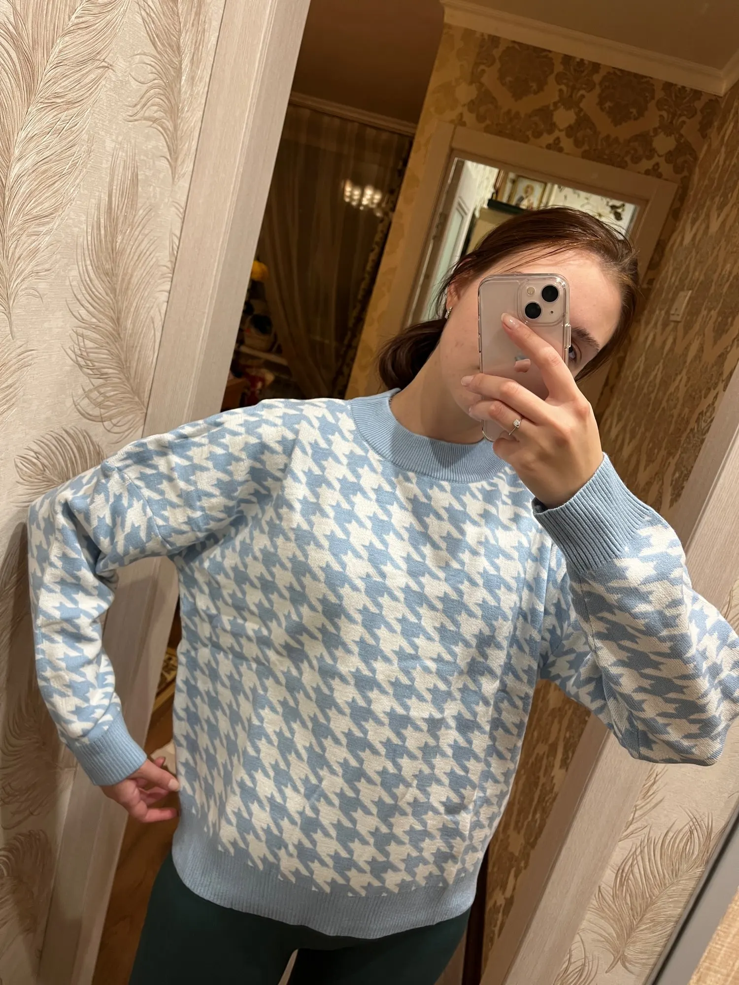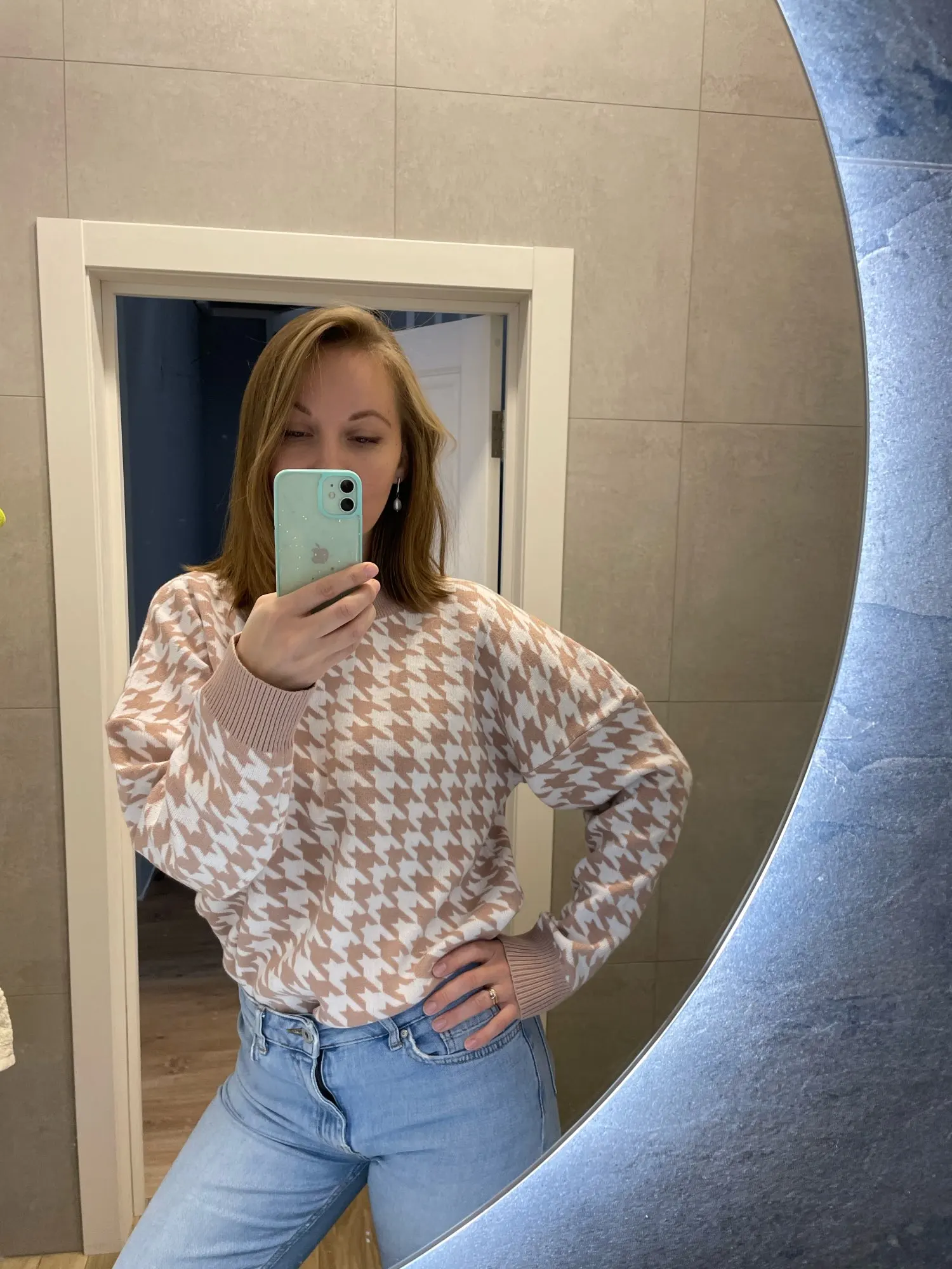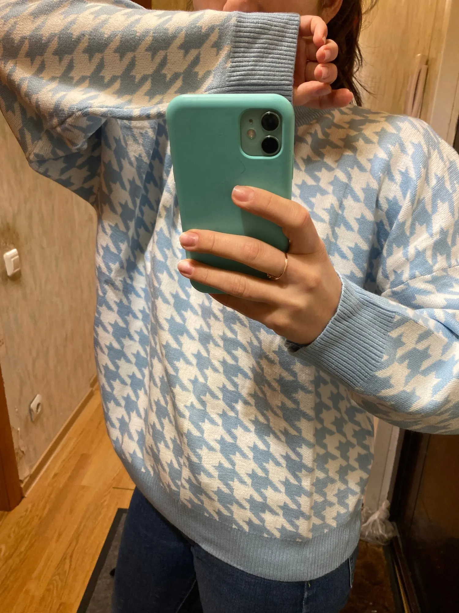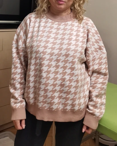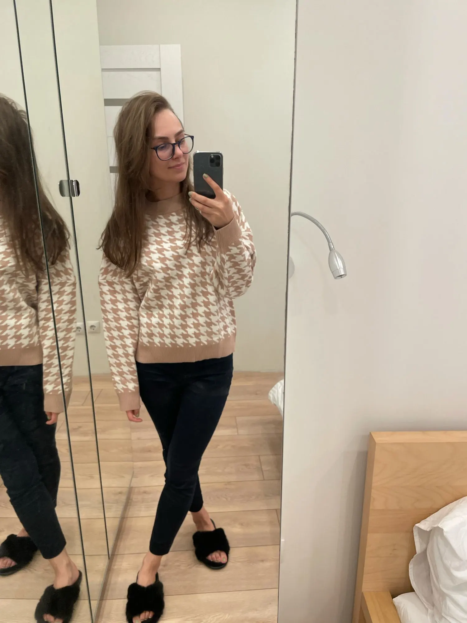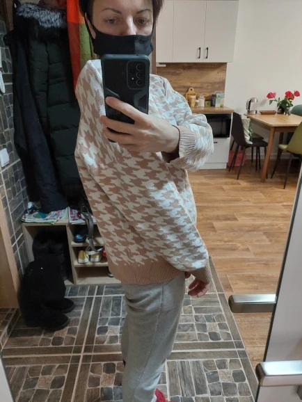 This jumper was in my basket for more than a year!!! Why didn't I buy it before ??? Very soft, cozy, stylish, modern print, while the coloring is gentle. On my parameters 89/63 sat down freely. With the store did not communicate, the order came very quickly, less than 2 weeks in Ulyanovsk.