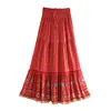 FREE SHIPPING Women Red Floral Print Beach Bohemian Maxi Skirt Rayon Cotton OUT1132