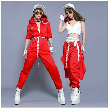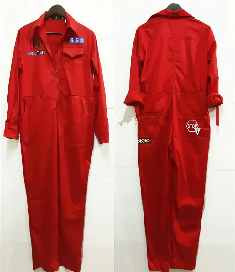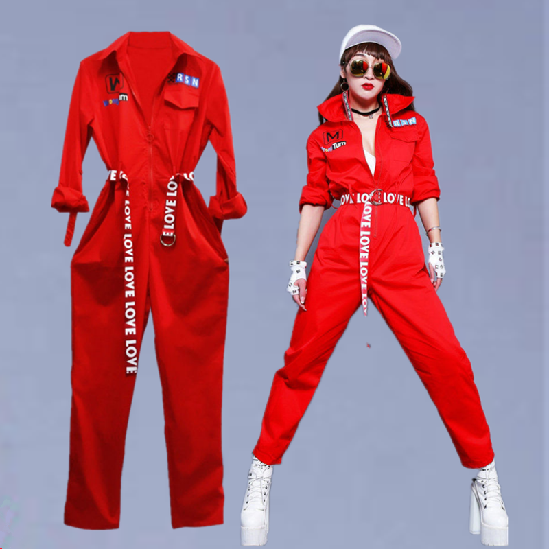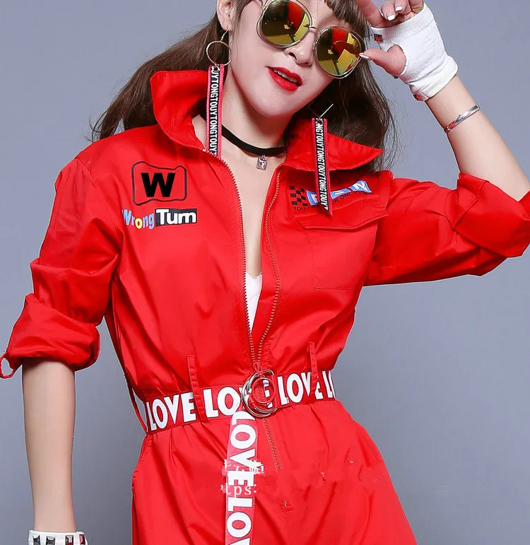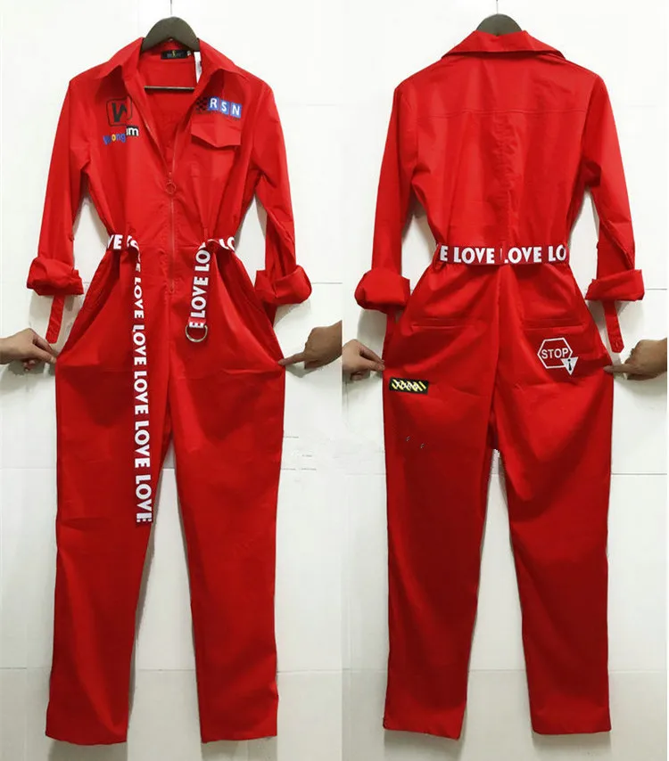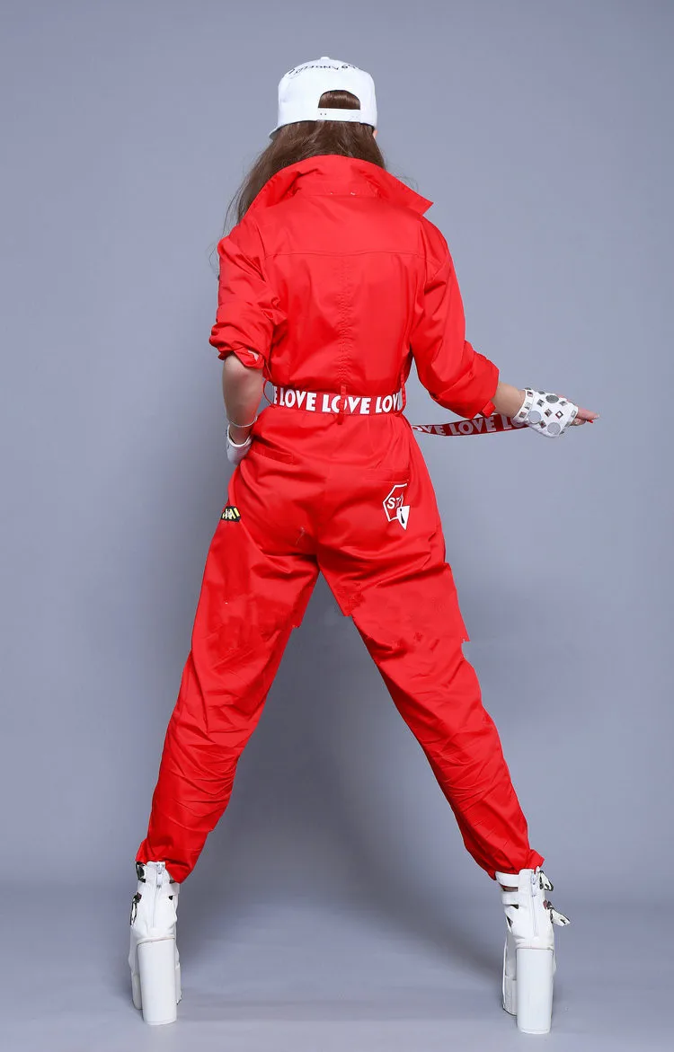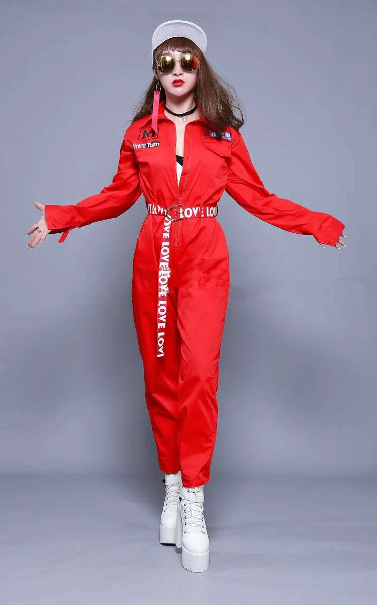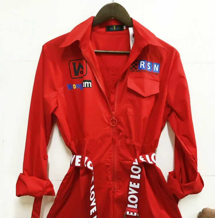FREE SHIPPING Women Red Streetwear Jumpsuit Long Sleeve Zip Up Utility Boiler Suit with Belt OUT1135