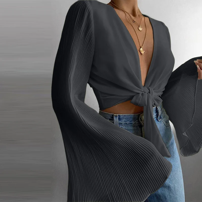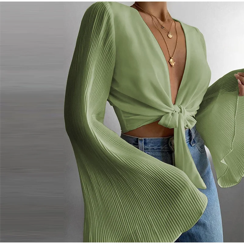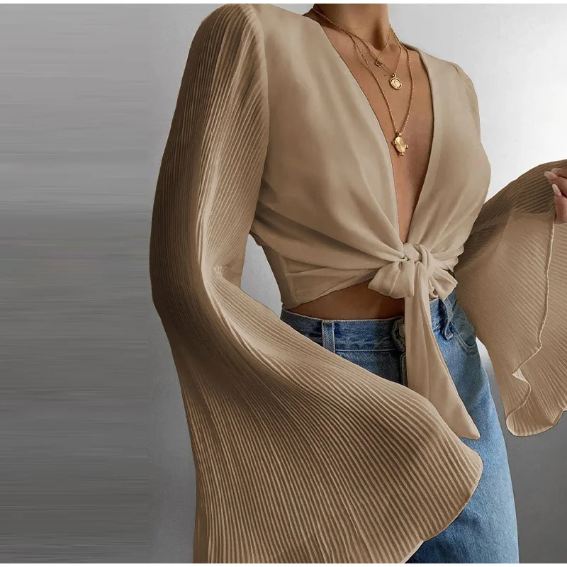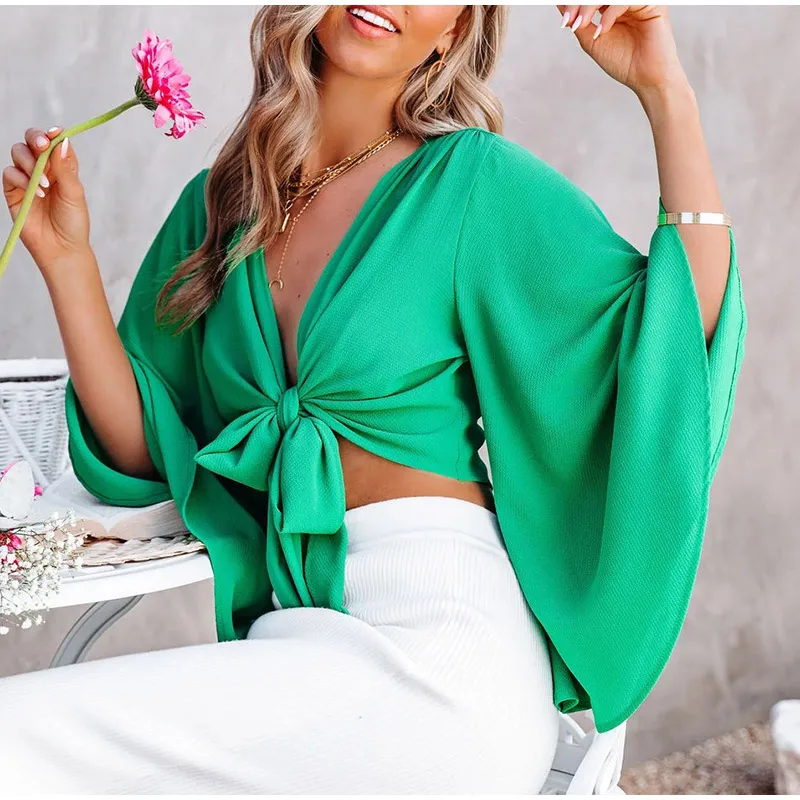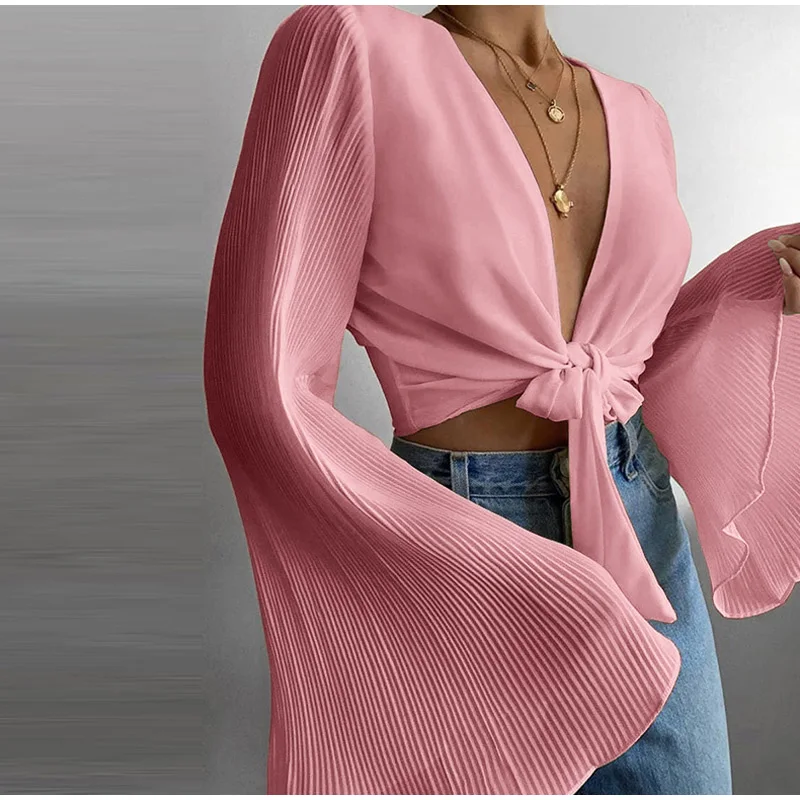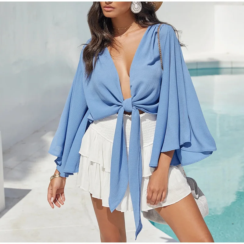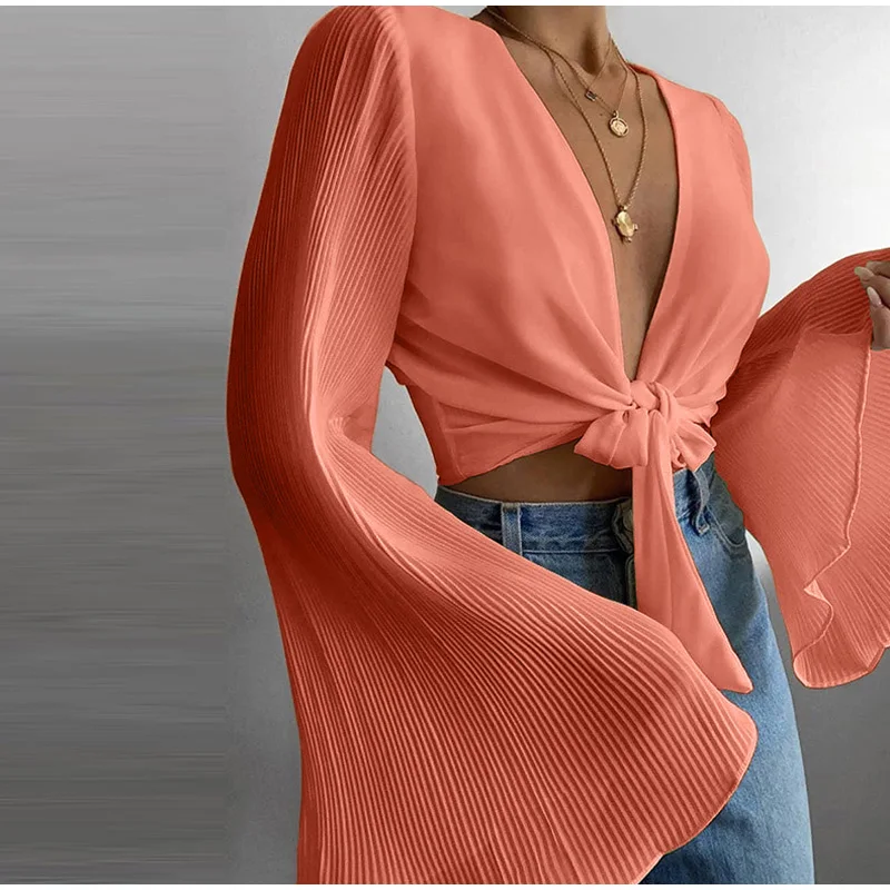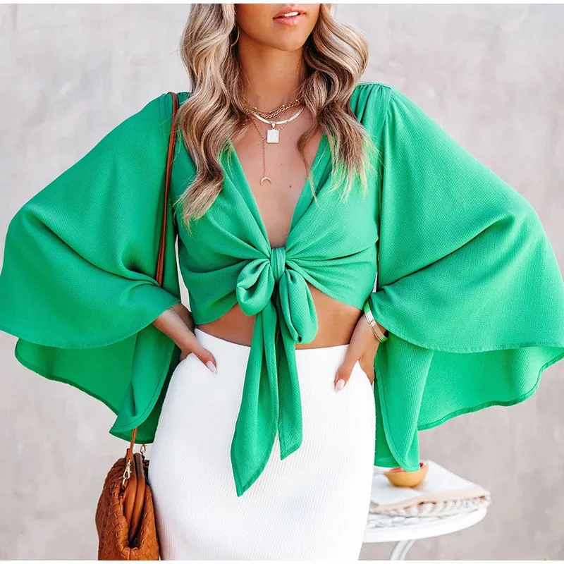 FREE SHIPPING Women Shirts Blouse Solid Flare Long Sleeve OUT0965