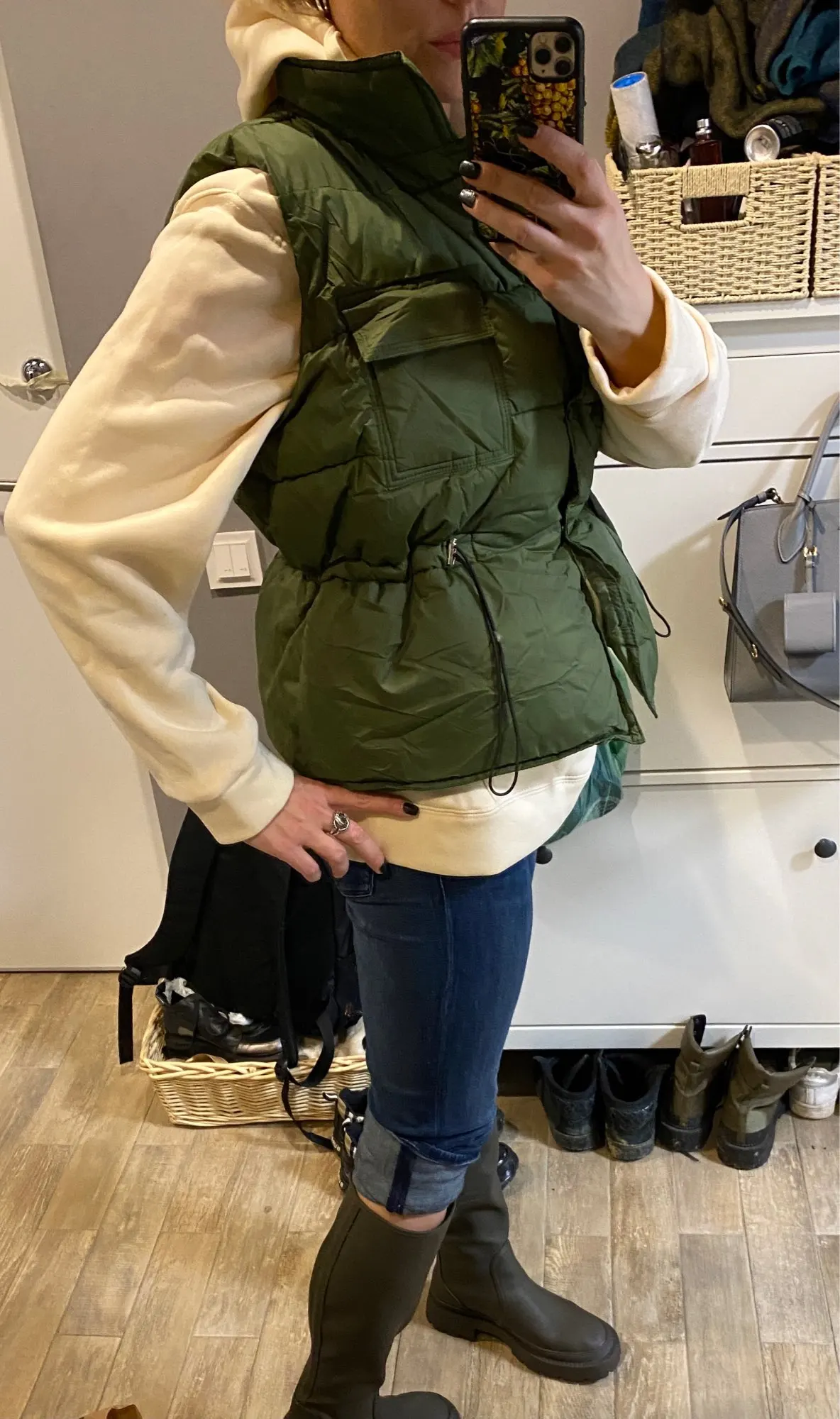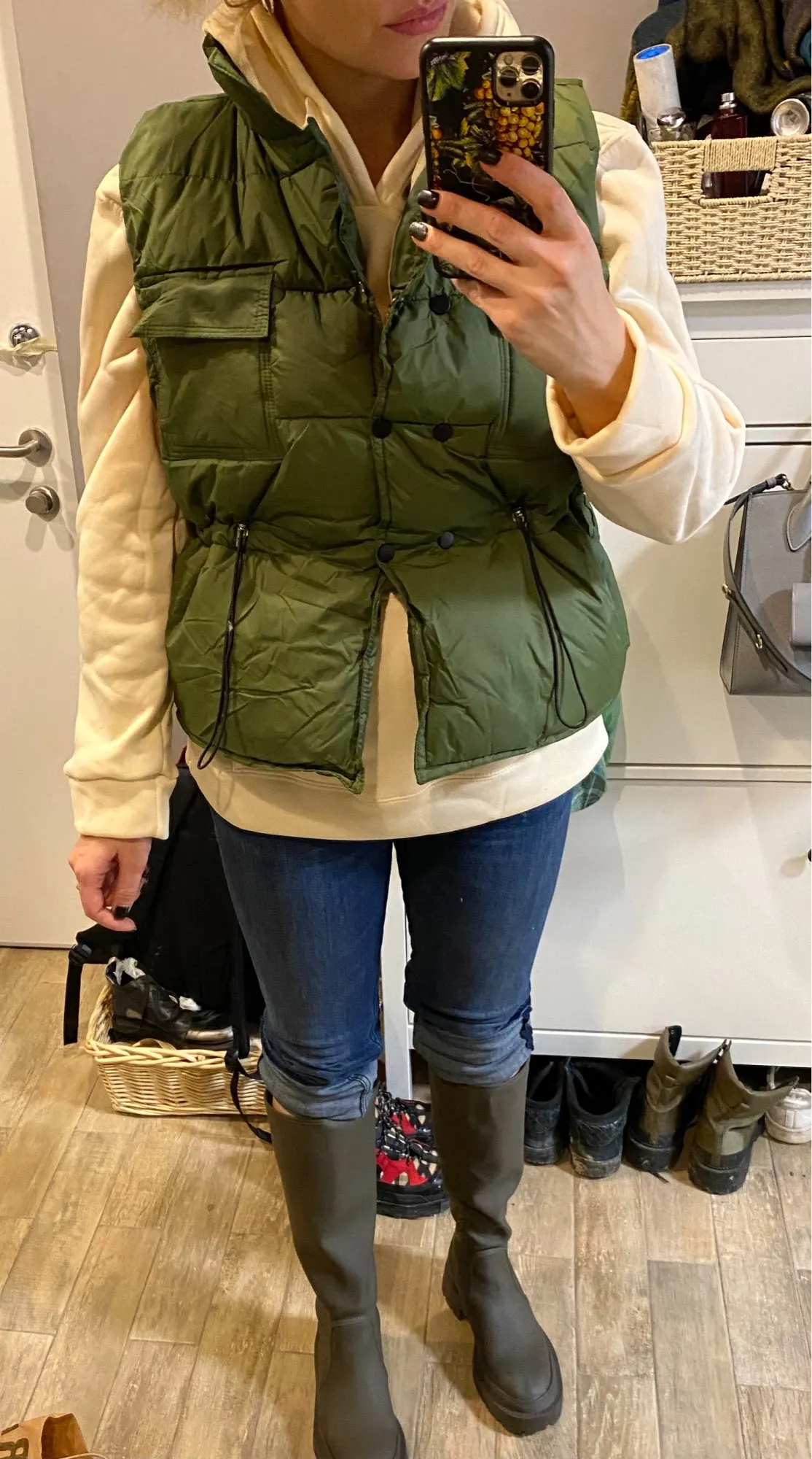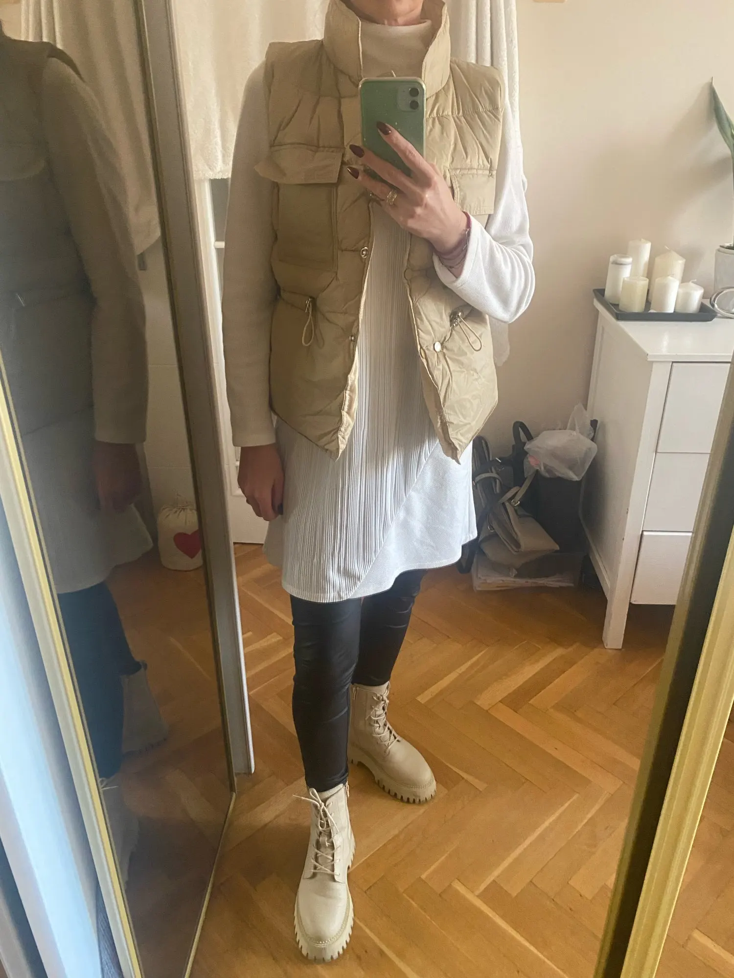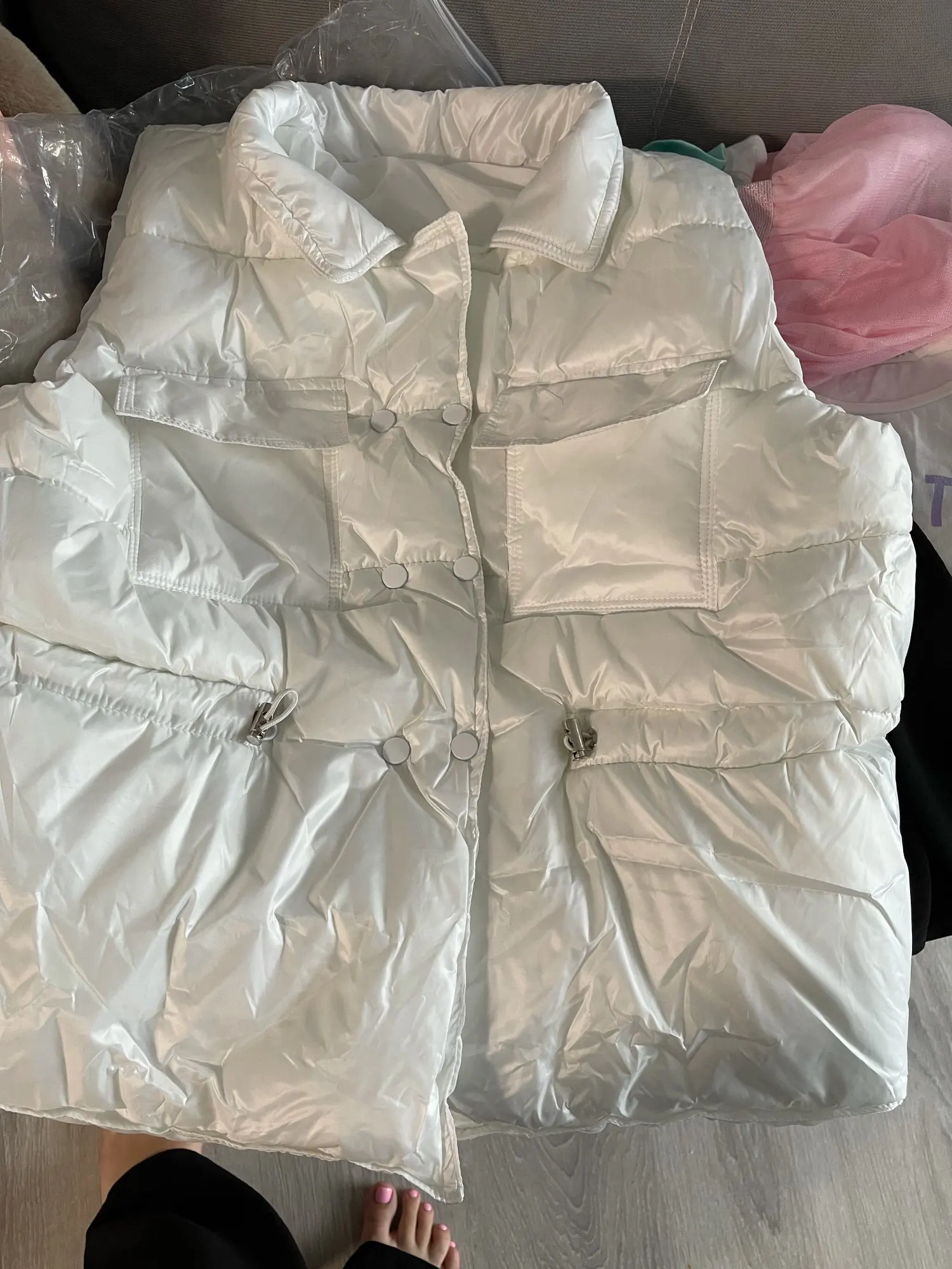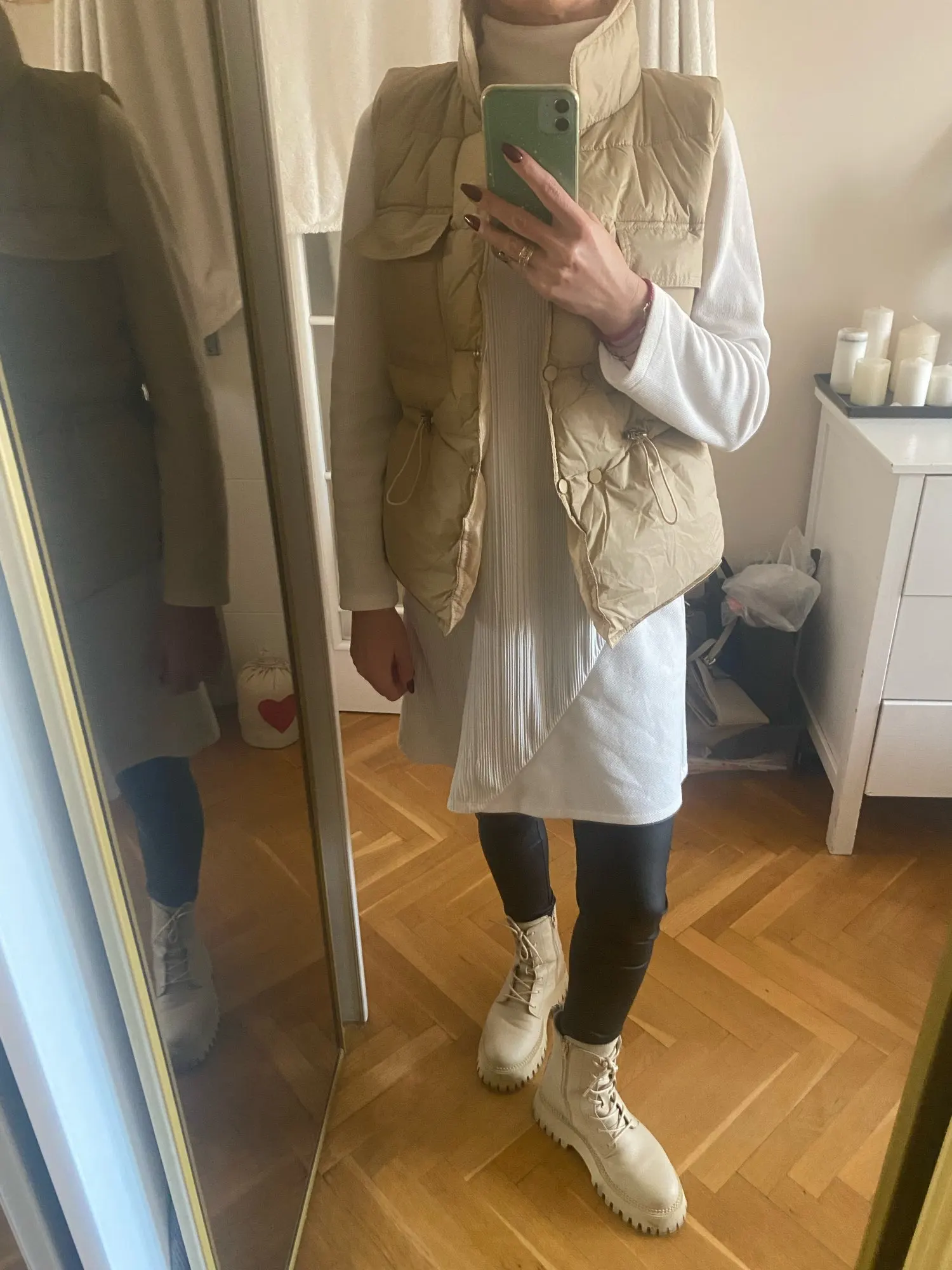 Неплохая жилетка, но очень короткая. На мой рост 170см выглядит как будто «подстреленная». И есть ощущение, что клепки не очень хорошего качества. Подойдёт миниатюрным девушкам. На мой размер 46-48 расходится внизу. Доставка до Москвы 2 недели