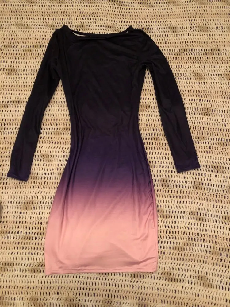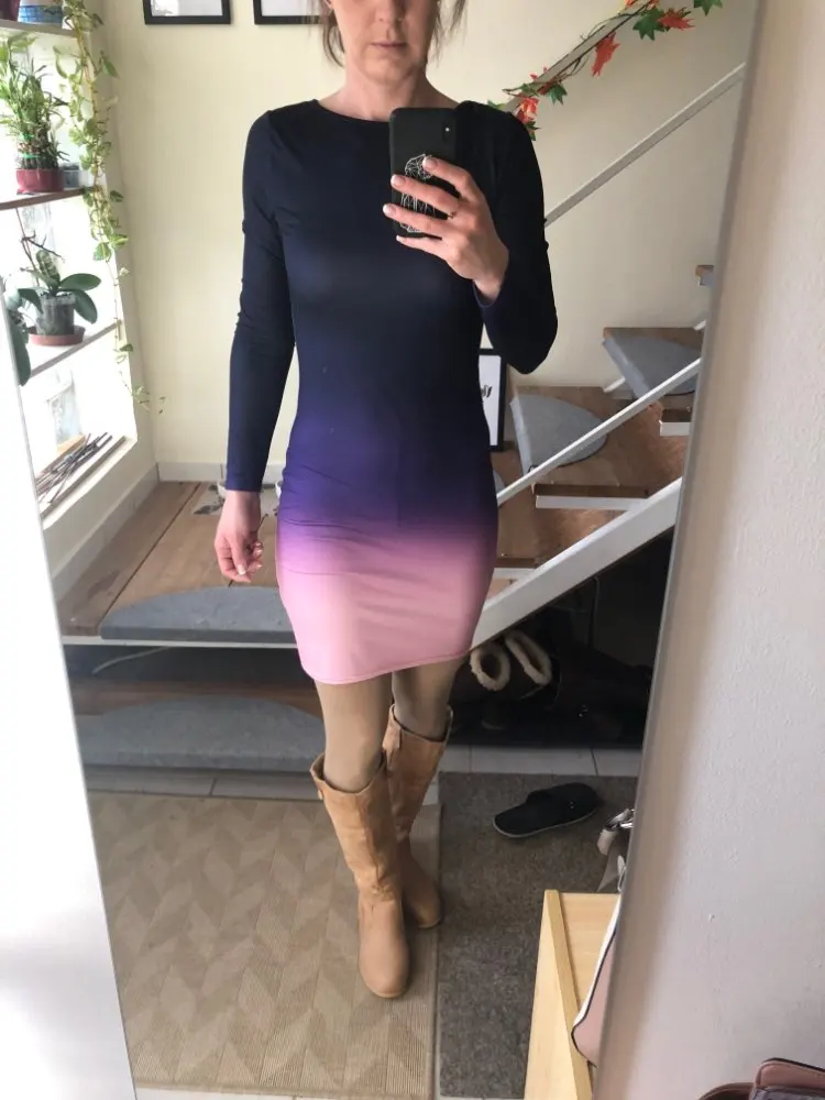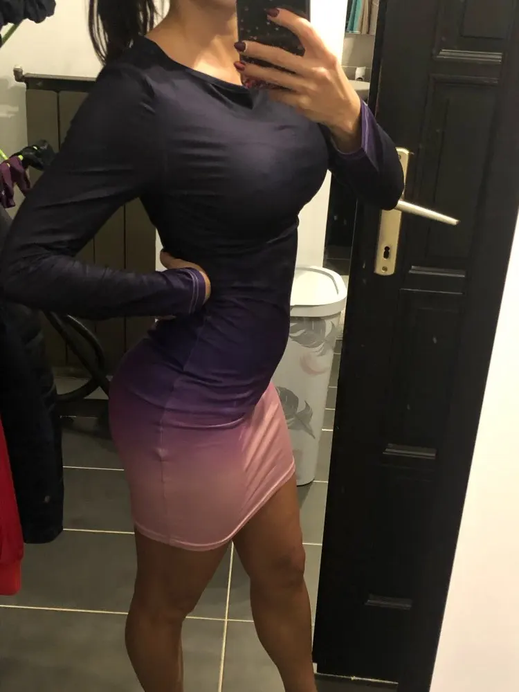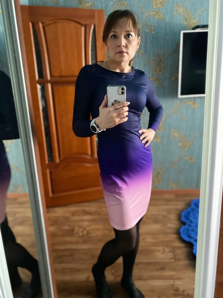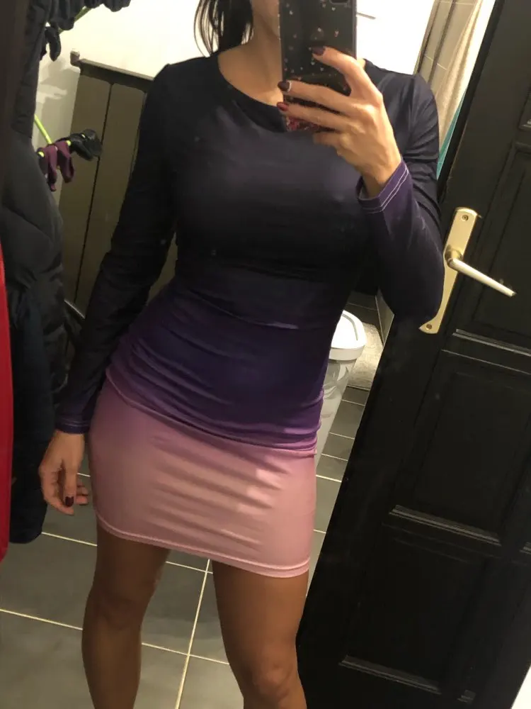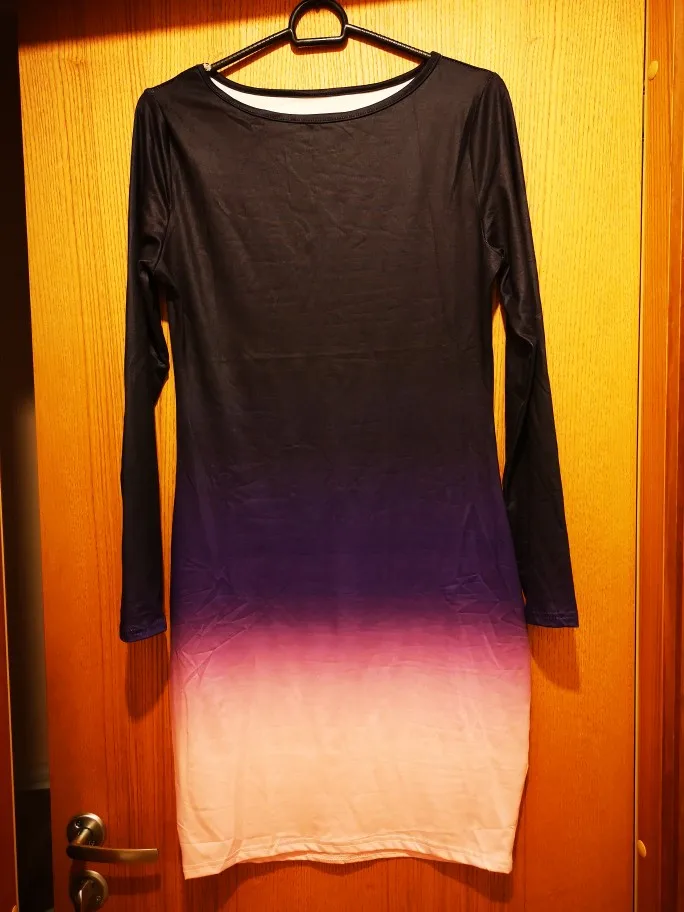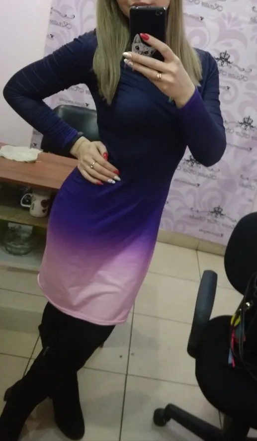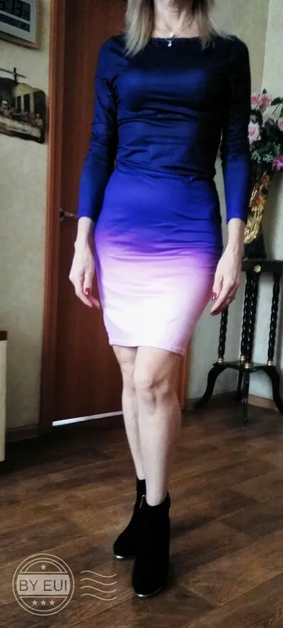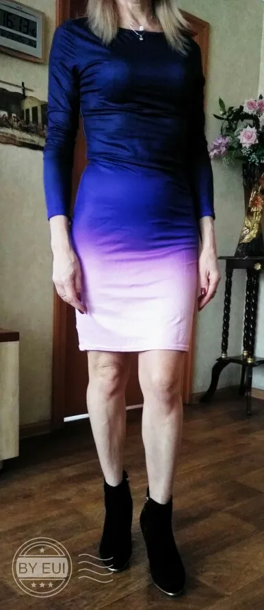 I bought for 455 rubles. Delivery a little more than a month. The track did not serve, the store did not communicate. The dress itself is no more than on its own money. The seams are not neat, the threads stick out. The top and the bottom are sewn with white threads, so even on the outside, the seam is very noticeable. The fabric stretches. But keep in mind that it does not pull, so that all the hanging flaws of the figure, only emphasize. I put S, the same size and ordered. For me in the neck is even too big. Although for all shortcomings, the gradient is certainly cute, you will not argue.