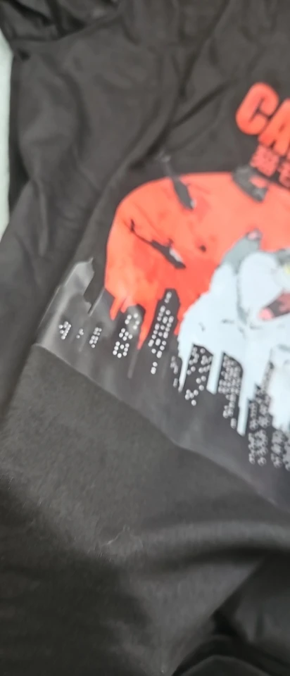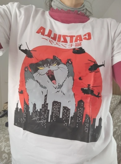 The fabric is not cotton, rather polyester, but it's not bad polyester. I was actually expecting worse fabric; this one is very soft and pleasant. The design is more like a sticker that seems to come off little by little with washing. I could have taken my size but since the comments said it runs small, I got one bigger. The truth is that it's a bit big on me but hey, it's fine.