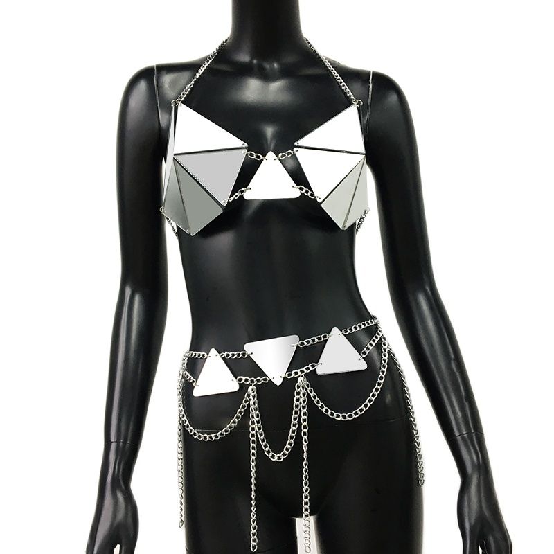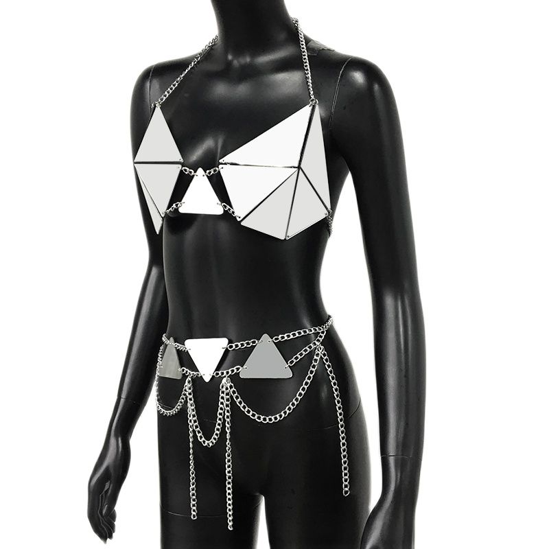 Holographic Mirror Bra And Harness Skirt Rave Set Festival Dancewear for Women OUT1020
