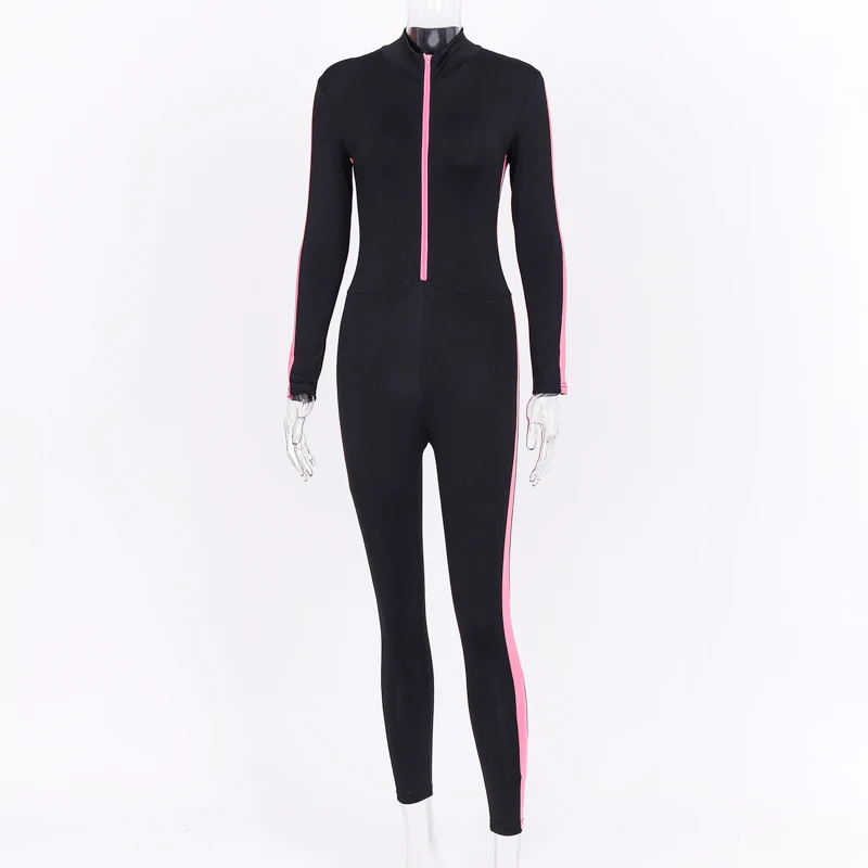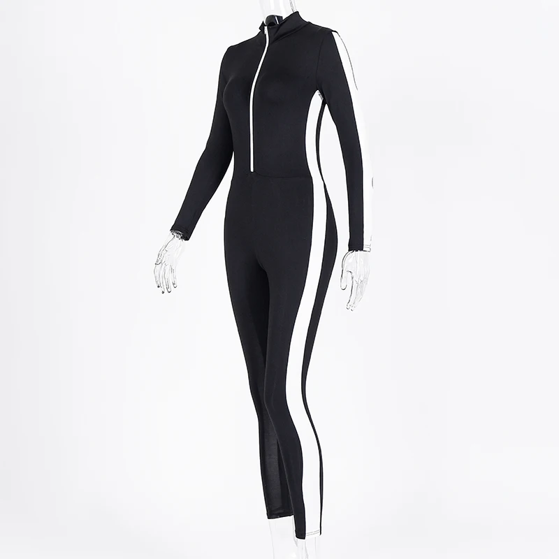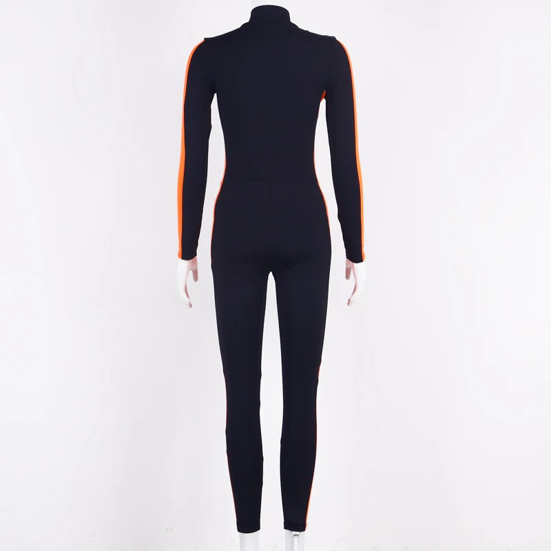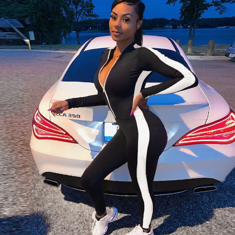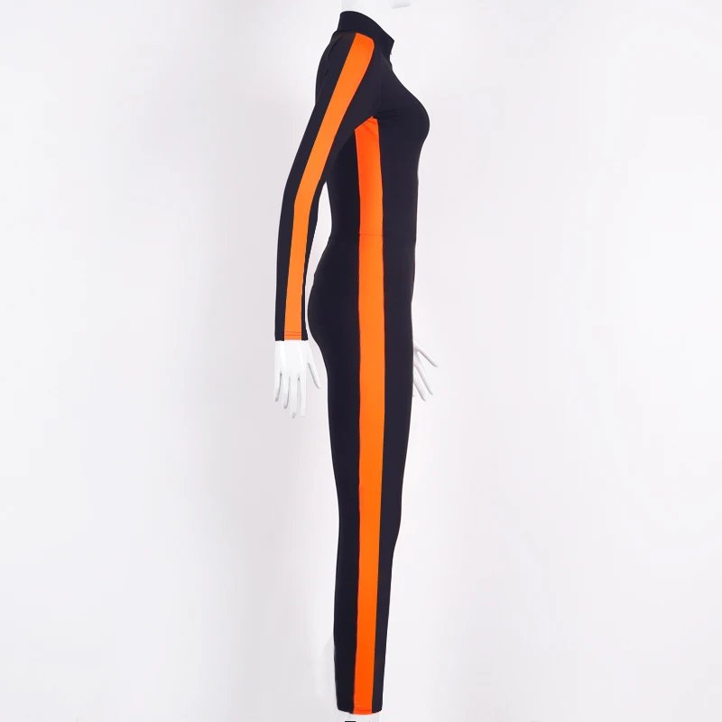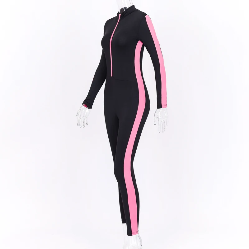 Long Sleeve Striped Patchwork Zippers Jumpsuit Stretchy Streetwear Outfits L0227