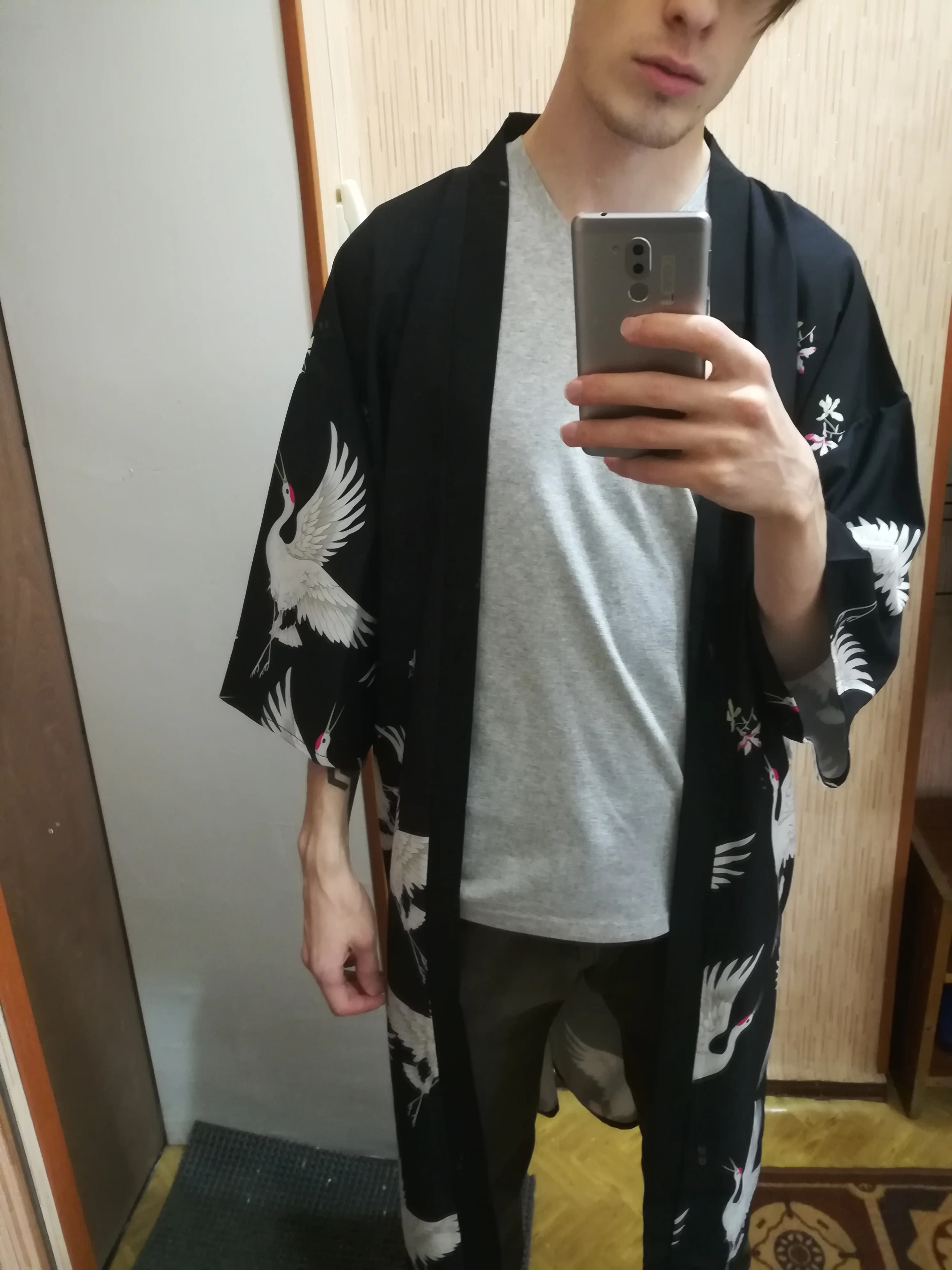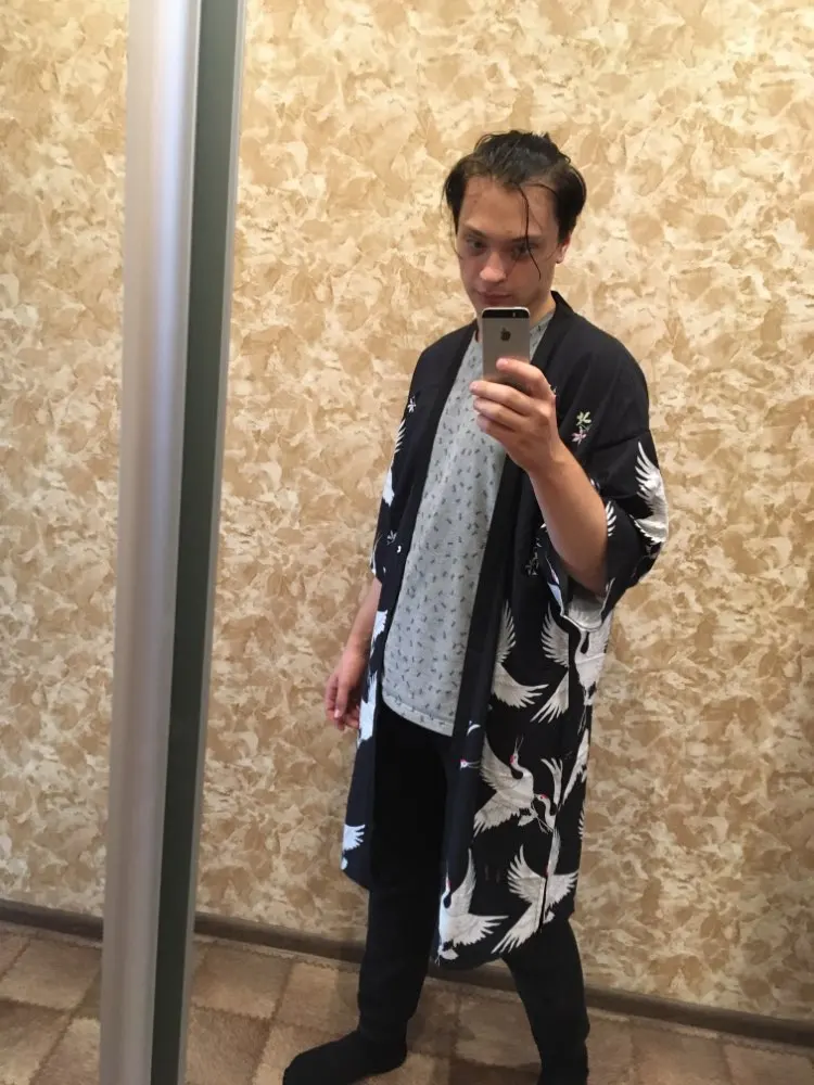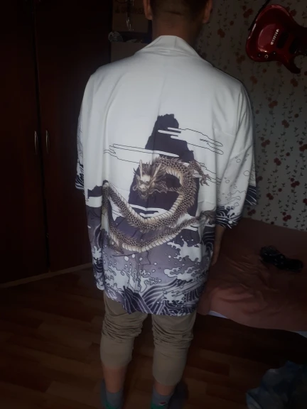 Very cool kimono. Cloth is dense, the pattern is clear, for the size I do not know, took for a gift, wears L, but I took with a margin of XL, I think it will be just. Delivery for 2 weeks to Poland