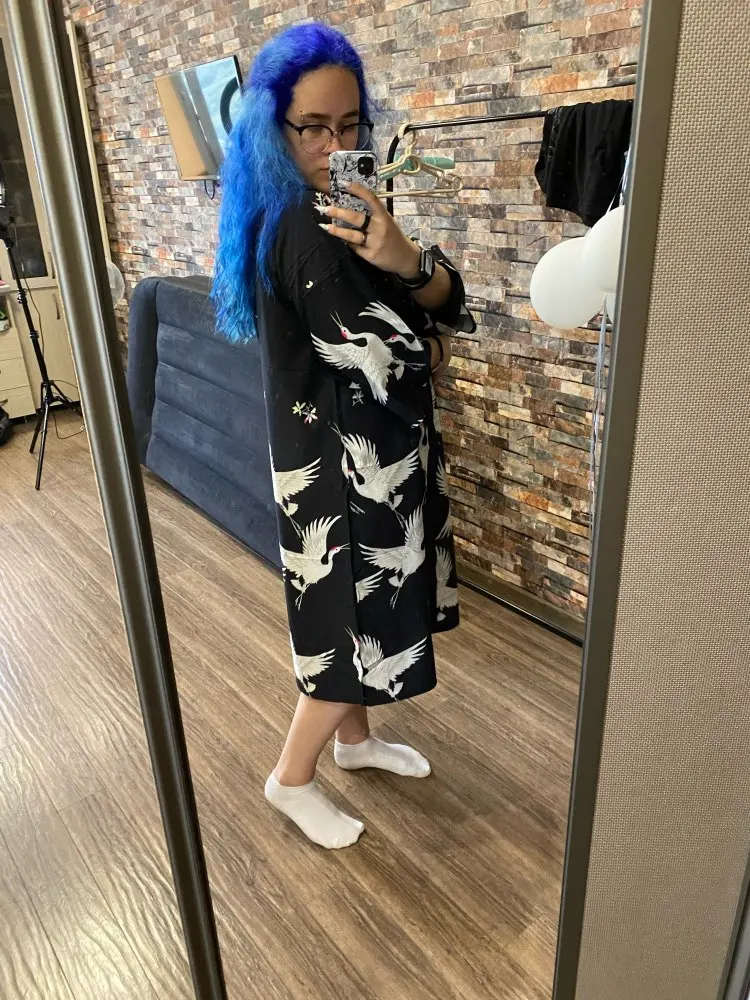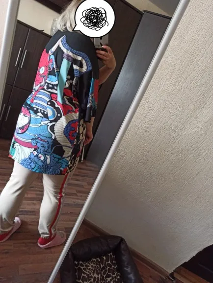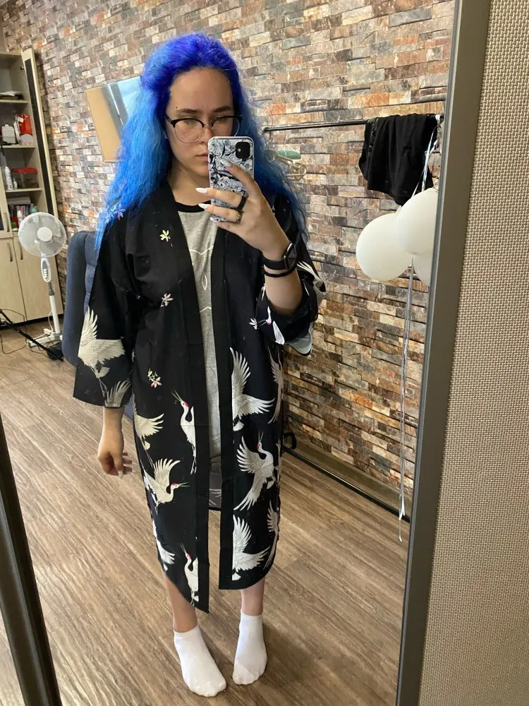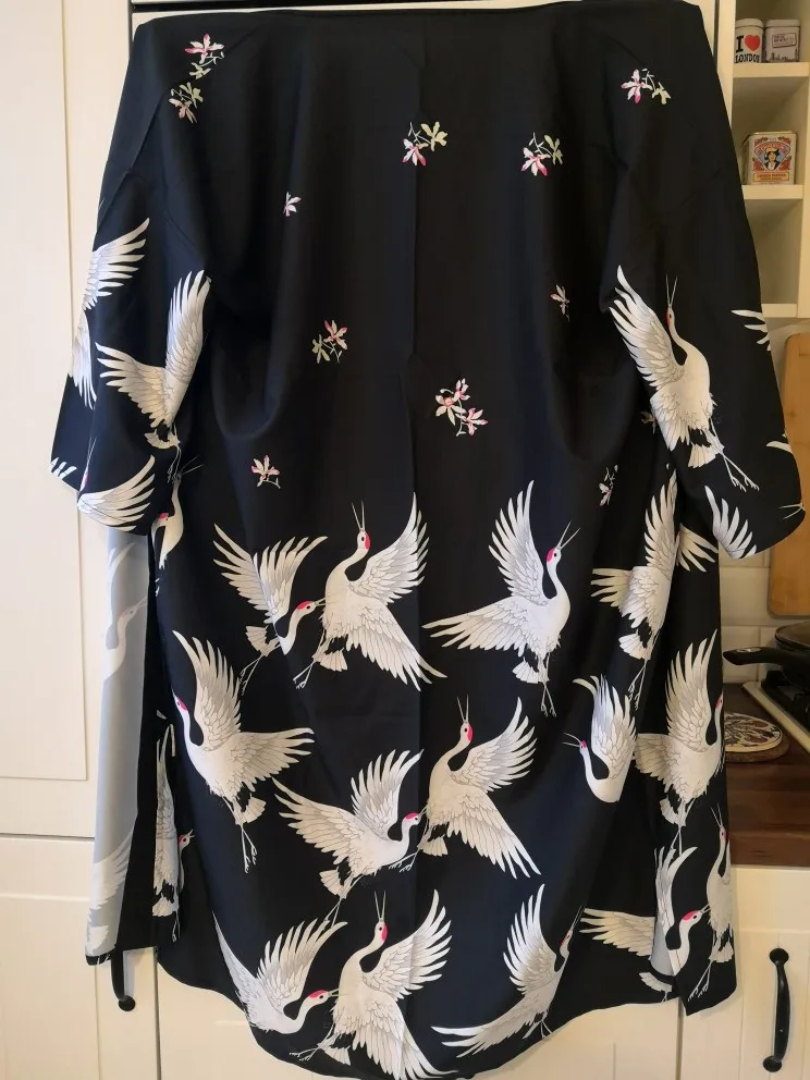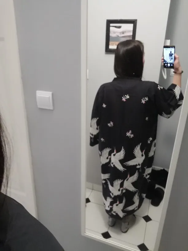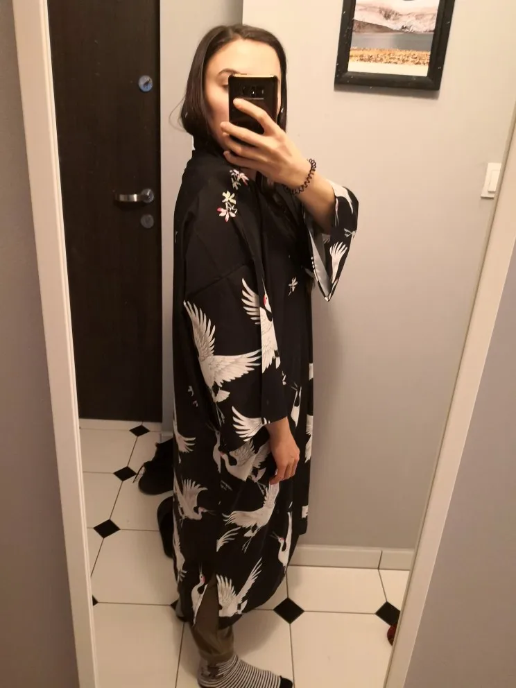 Очень красивое, качественное кимоно! Принт напечатан очень хорошо, ткань приятная. Долго выбирала и сравнивала с другими подобными и обратила внимание, что именно у этого печать принта самая качественная. Заказала размер M, на рост 168, 42-44 размера подошло идеально. Большое спасибо, я очень довольна покупкой!