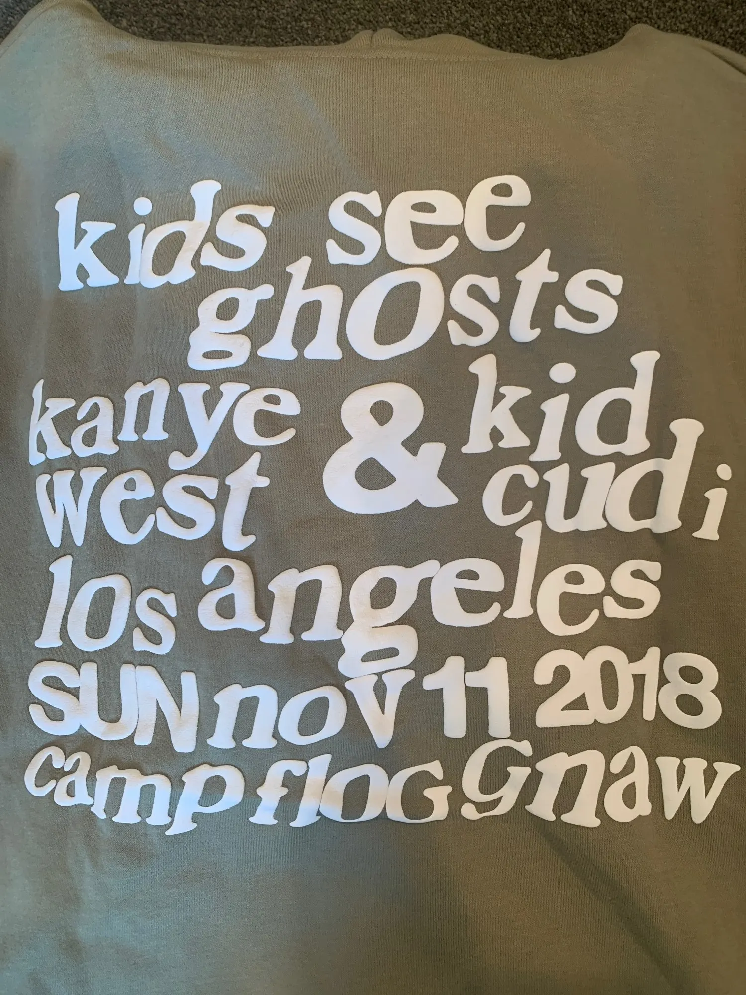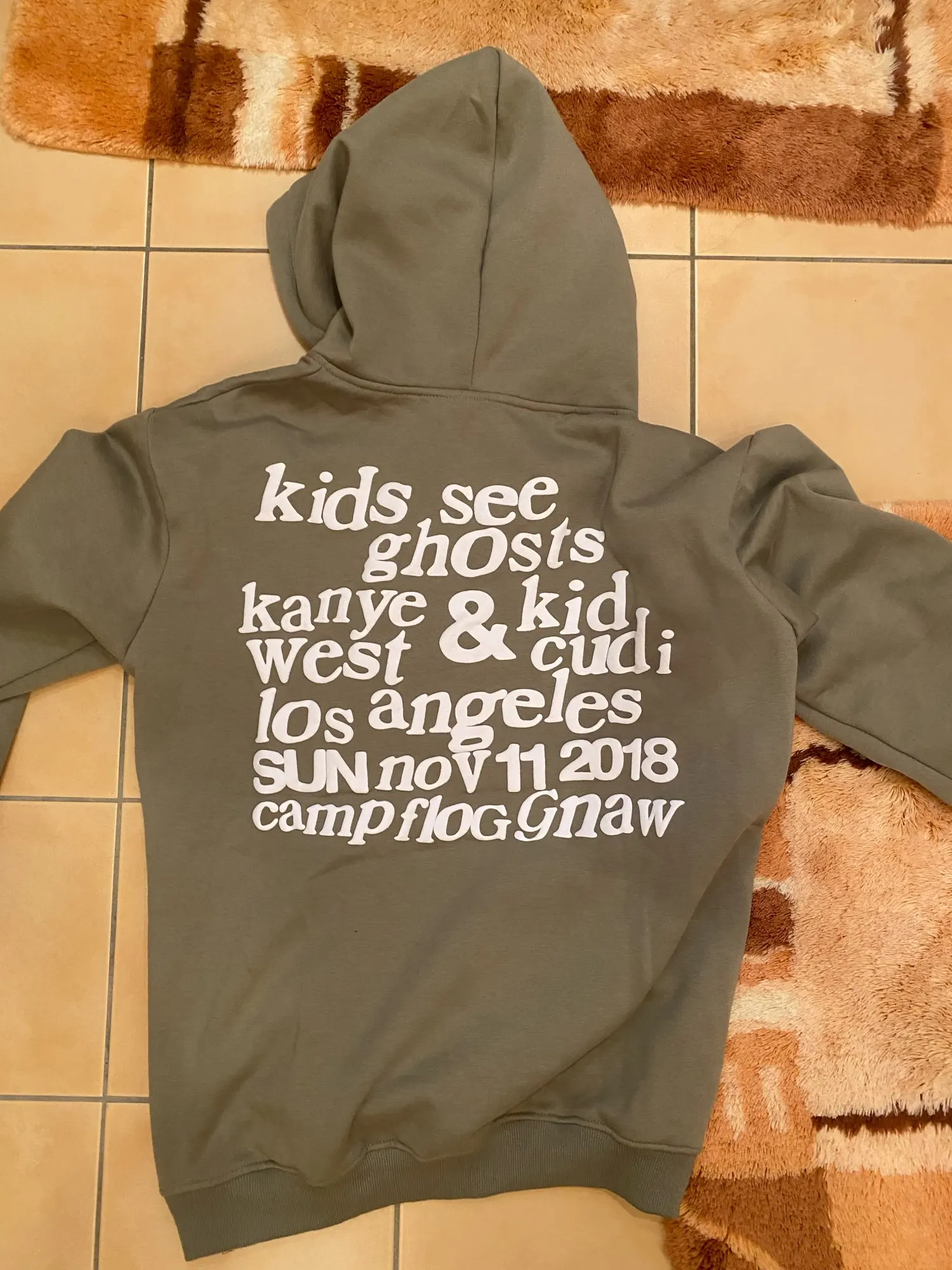 Colour is more olive than I expected but it looks nice. Great oversized fit. Writing is accurate. Very happy. Thankyou :)
