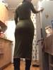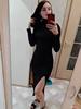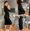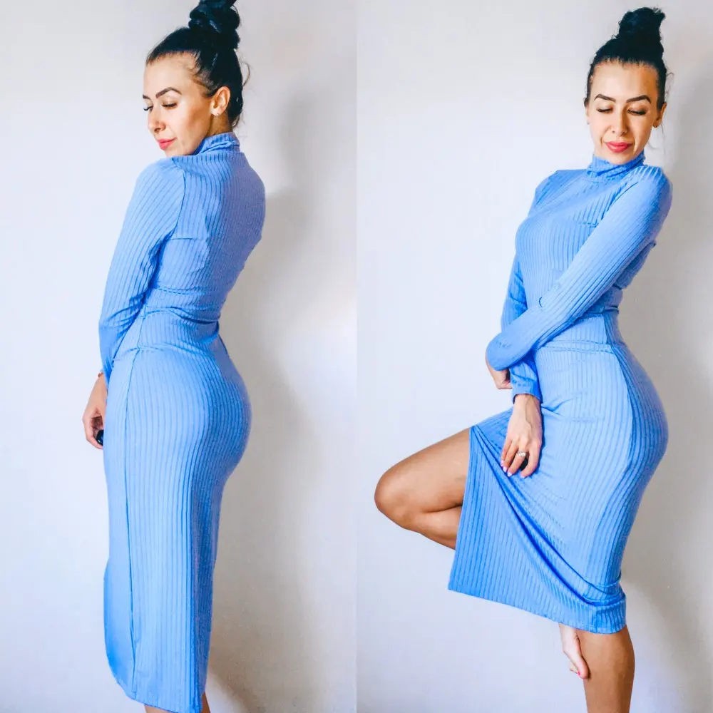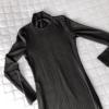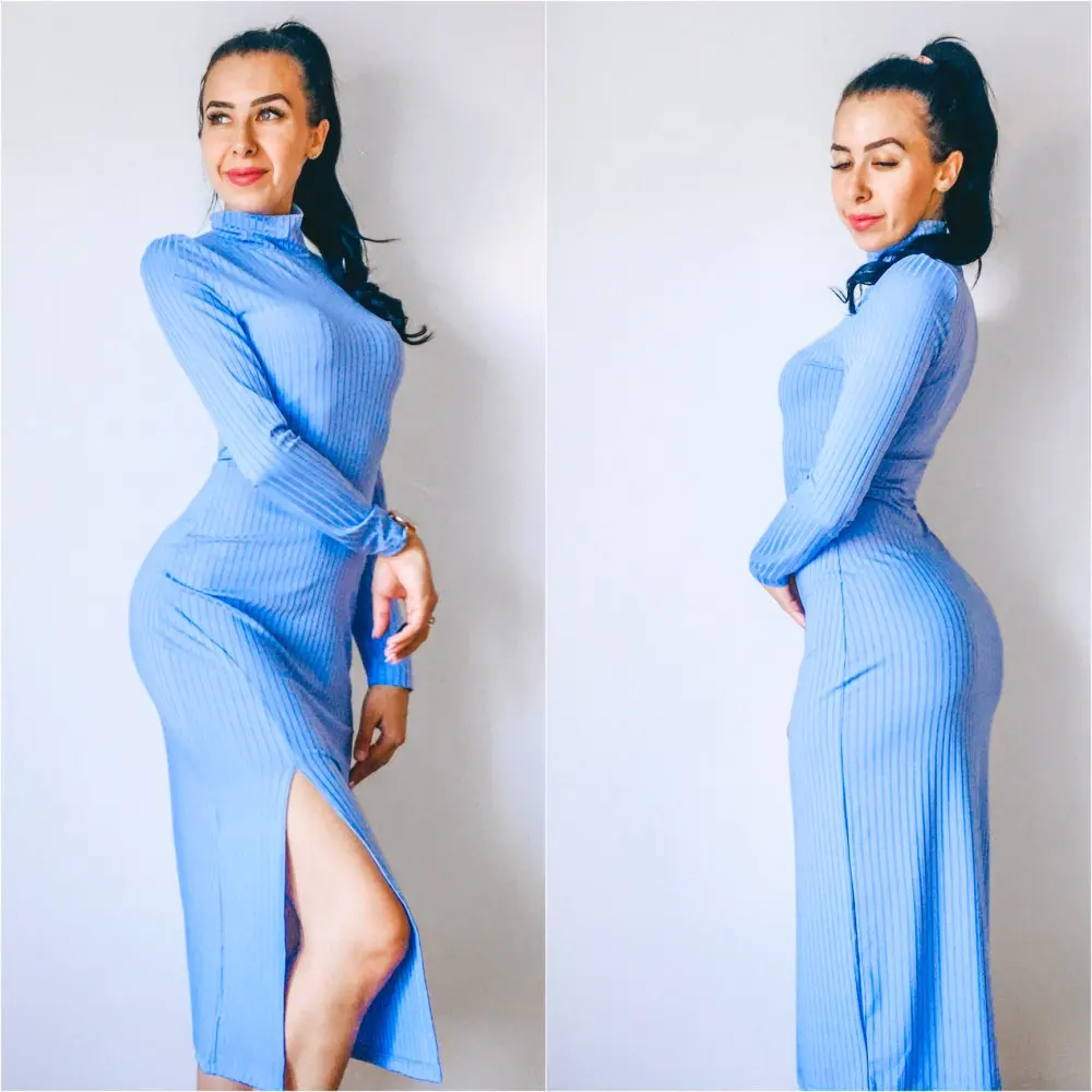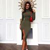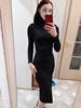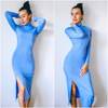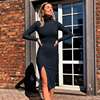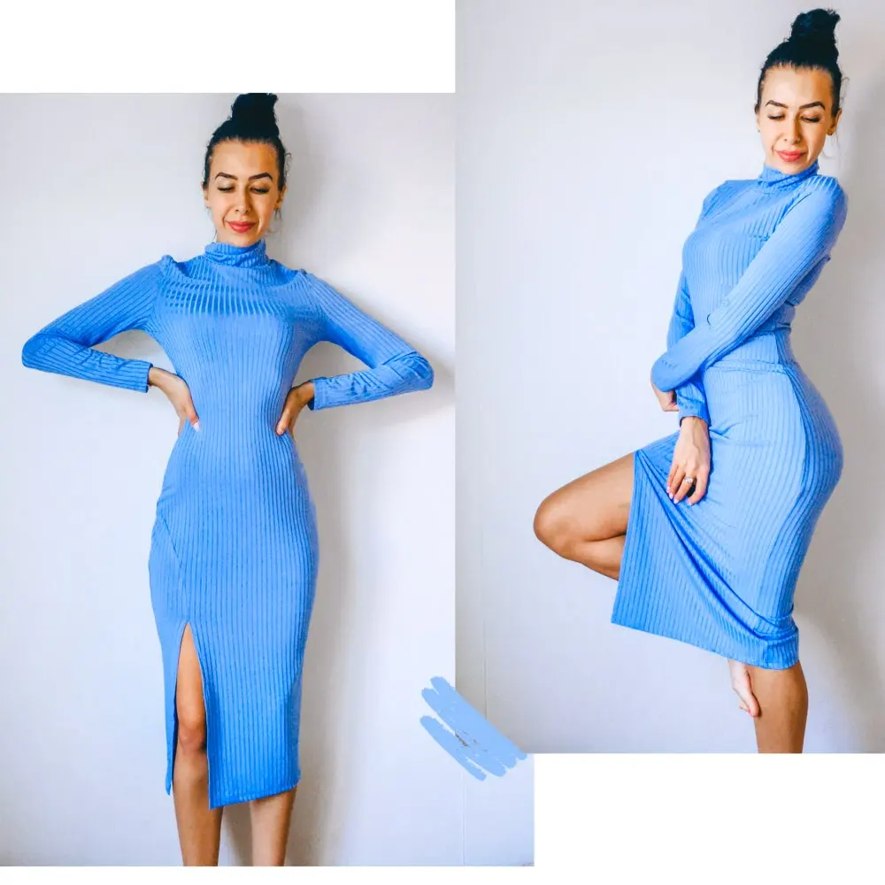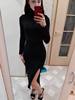 Knee Length Dresses Cotton Ribbed Knitted Turtleneck Solid Split Long Sleeve Autumn Mock Neck Elegant Dress L0244