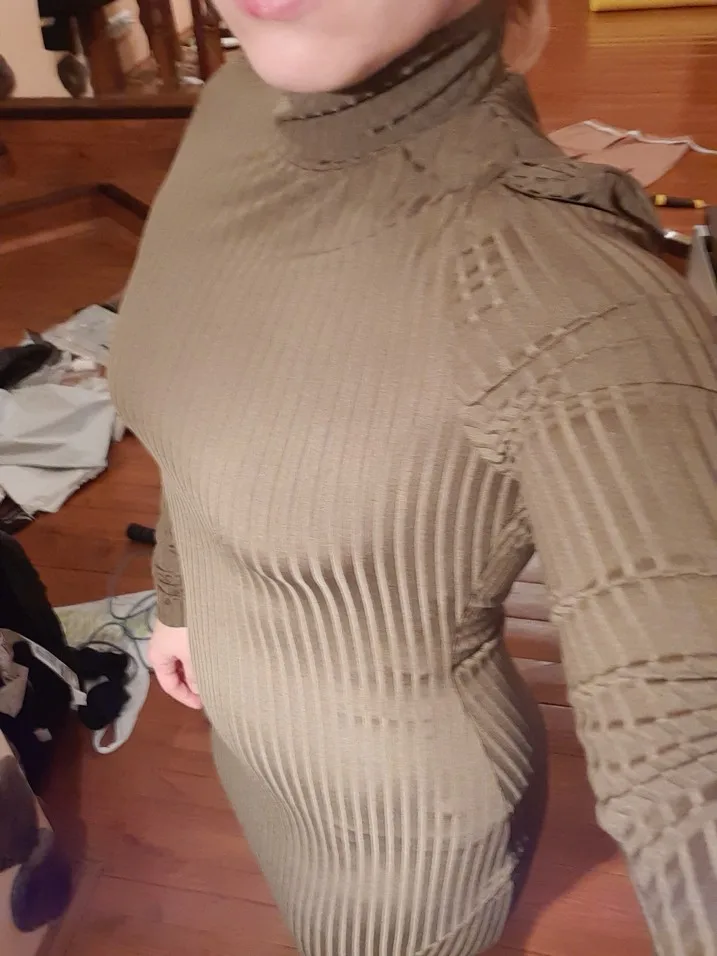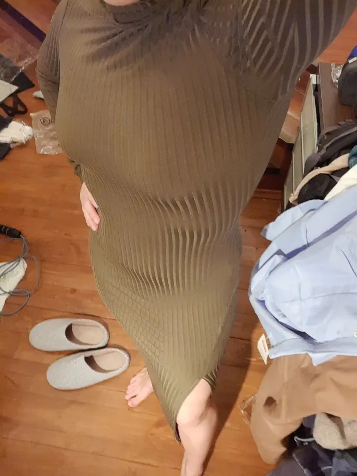 Delivery very fast (from this store always came quickly). The store is contact and very nice, advise. about the dress is made of fine knitwear of good quality, odorless, does not shine through the body, but you need seamless underwear. black looks very cool and spectacular!! And thin!! Blue for its parameters did not risk, but black I advise everyone! Stretches the fabric well, I think that "neat externally" pregnant is also suitable. at its 92-75-102 (at the moment) on me L.. On large parameters are no longer worth taking. .. Height 168, with it the cut is not vulgar. I want more khaki