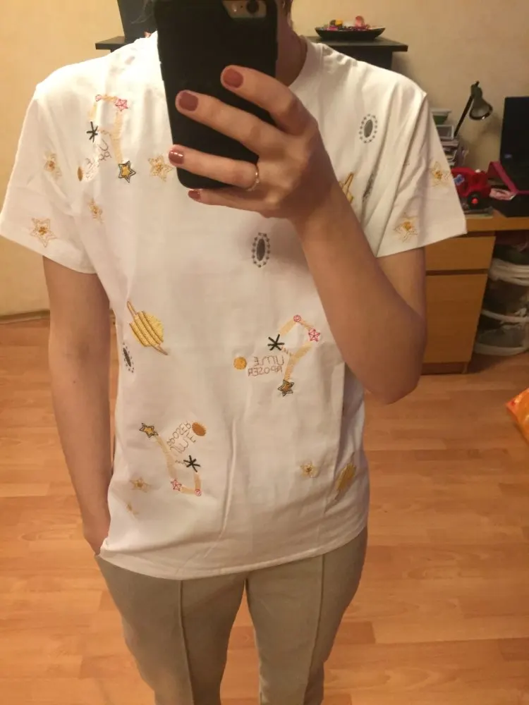 Excellent white T-shirt, drawing embroidered. At OG 98 from 75 came XL or 170/94 A on the tag to the T-shirt. Slightly stretches, sits neatly, feels pleasant. With the store did not have to communicate, the order came quite quickly, somewhere in a month.