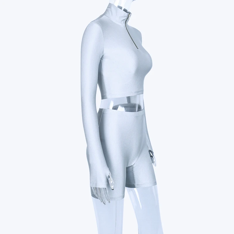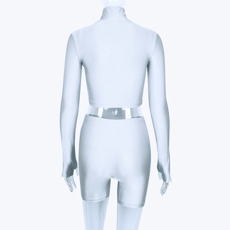 Long Sleeve Zipper High Neck Elastic Sexy Crop Tops And Shorts Two Sets L0214