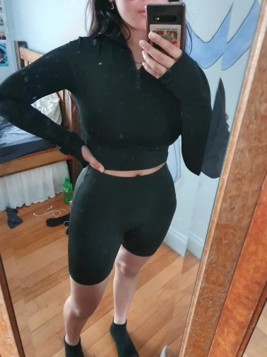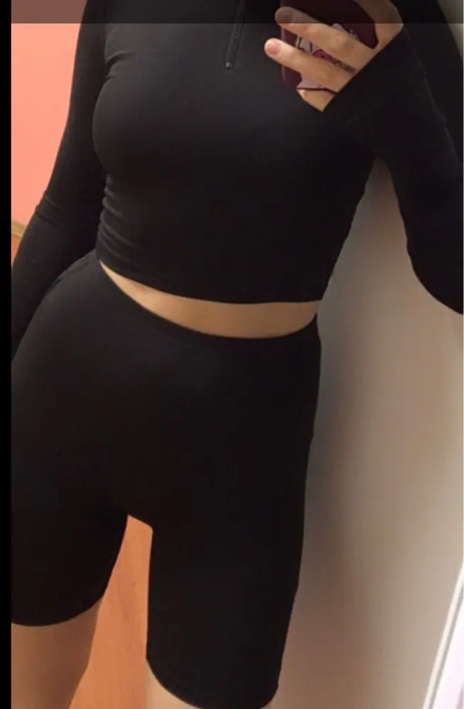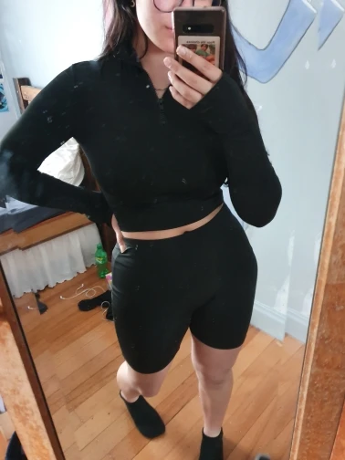 Fabric is SO SOFT! Feels like Lululemon butter and it is so shiny and brushed. Was concerned that the shorts would give me a lower belly pouch since there’s no waistband but magically they don’t! Love it :) - size S
