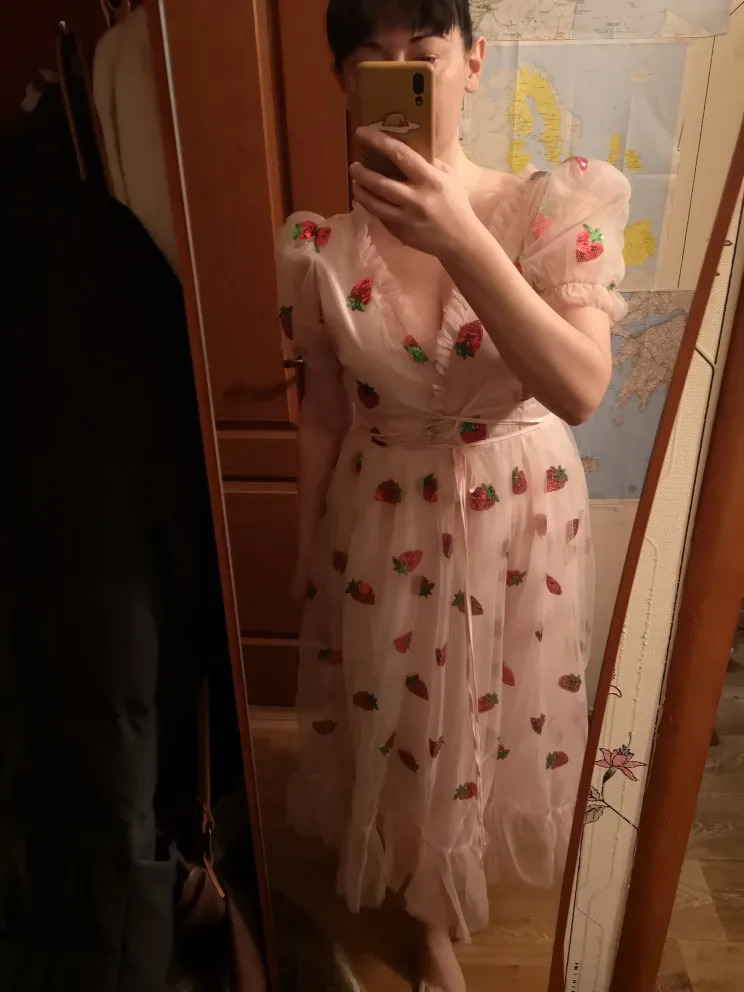 The dress is just gorgeous!!! I fell in love with him at once! The material is good, all the strawberries are intact, the threads did not stick out anywhere. The only thing-tormented with this belt-ropes, Long could not understand how to properly tie them at all, so that it was normal. And that's 5 stars! I'm delighted!