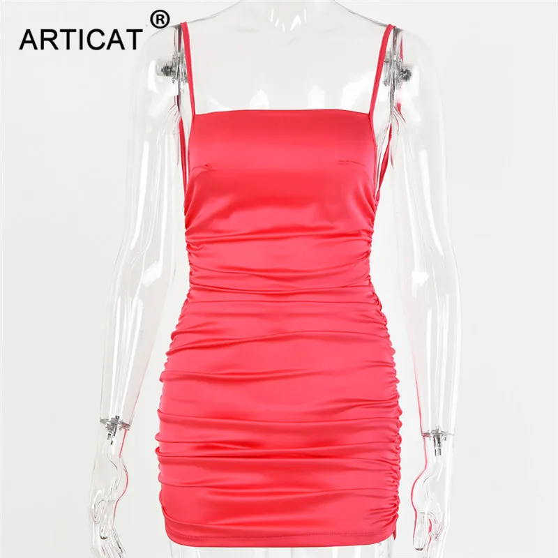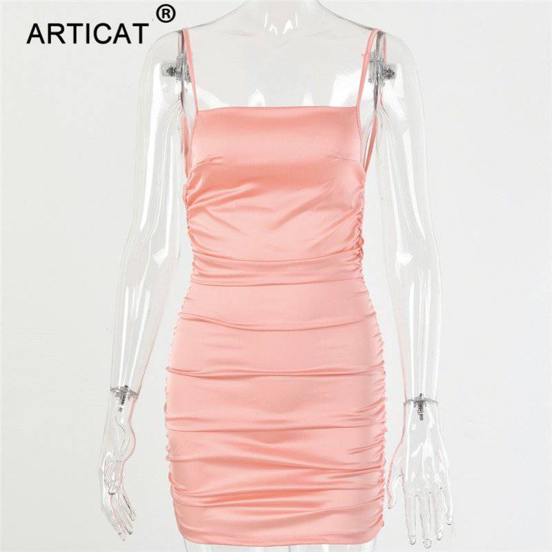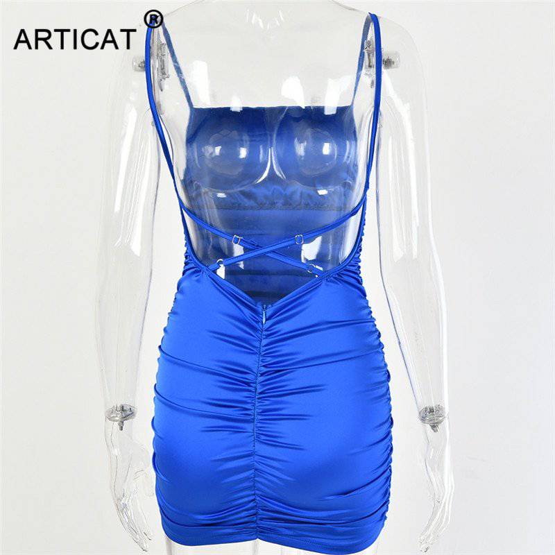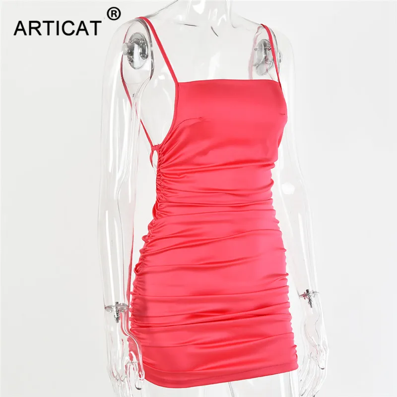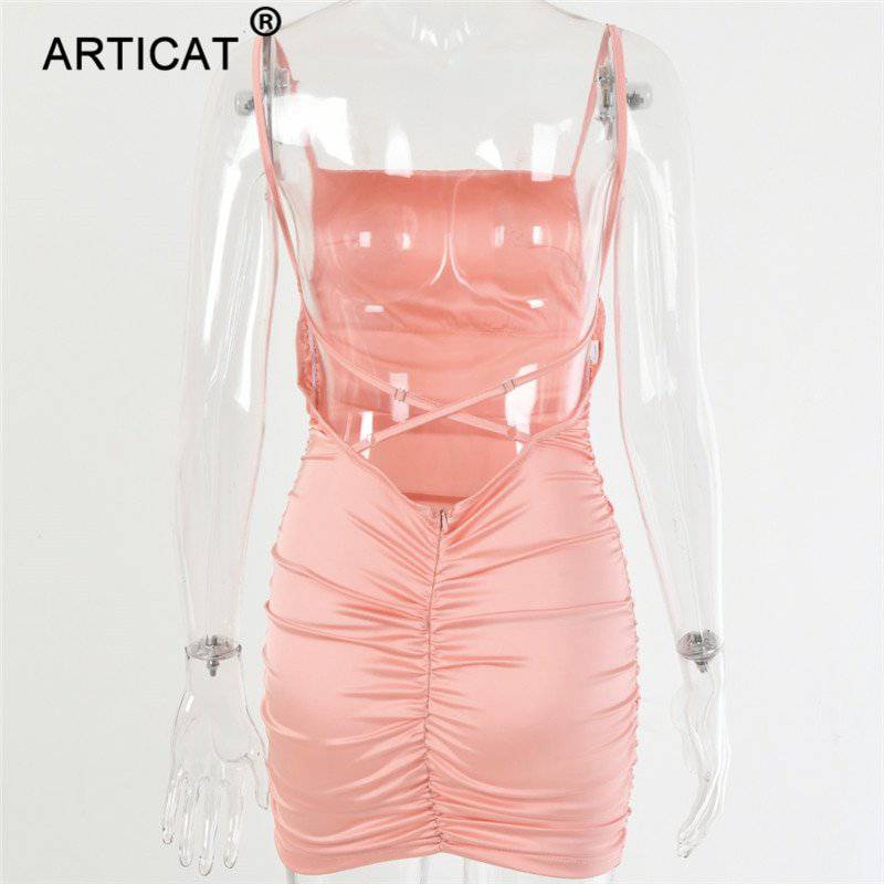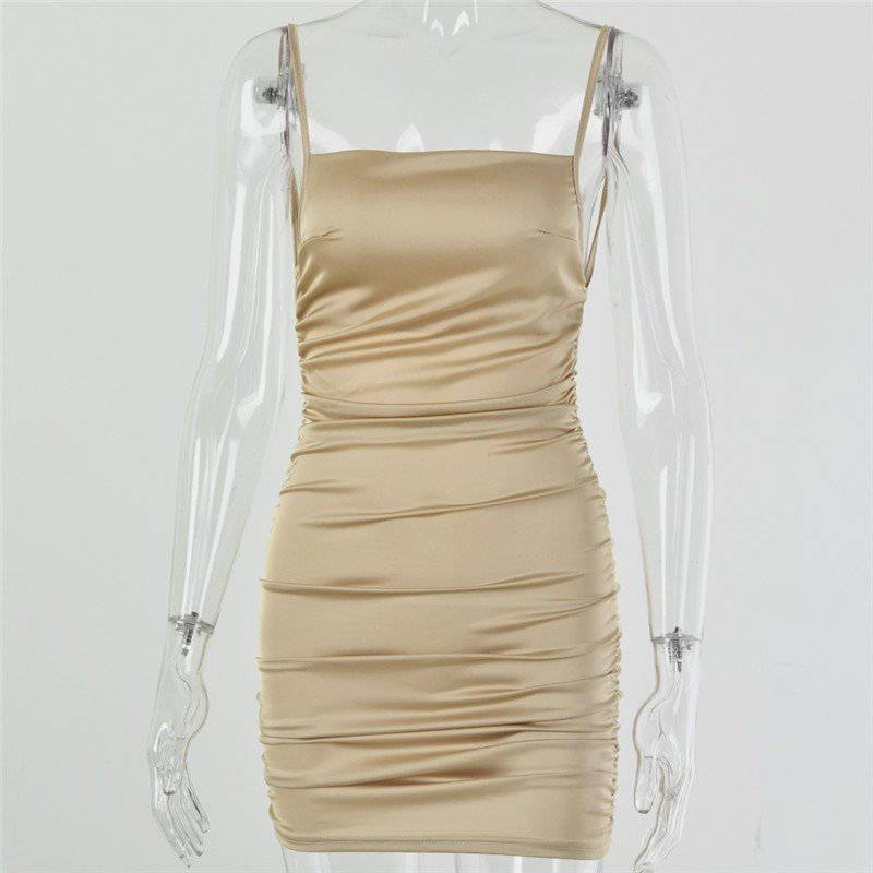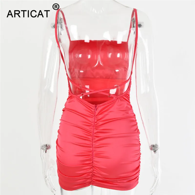 ­Mini Satin Dress Spaghetti Strap Backless Cross Bandage Bodycon Dresses L0085