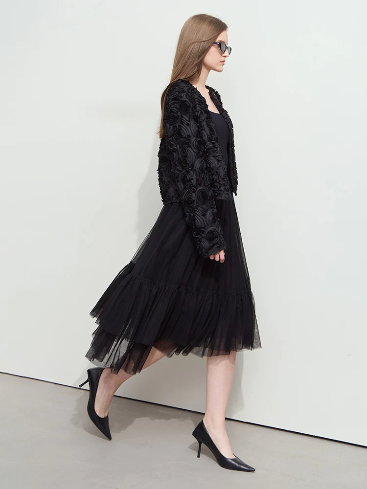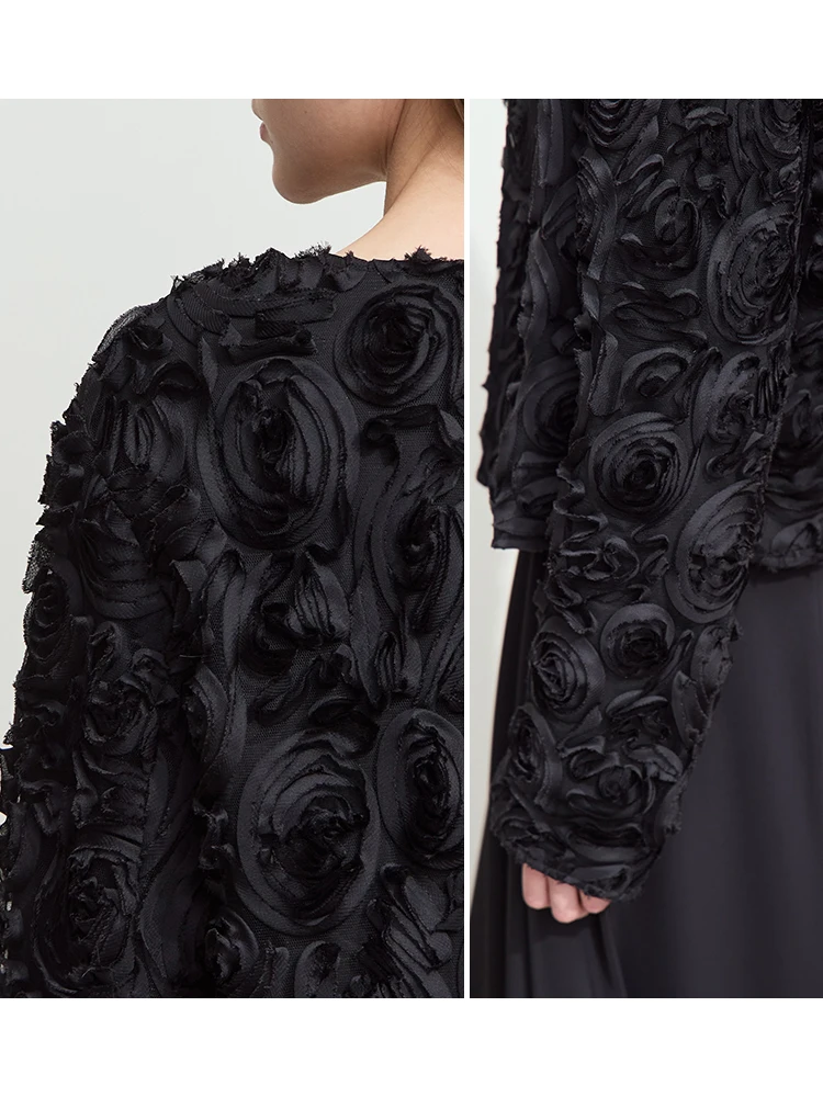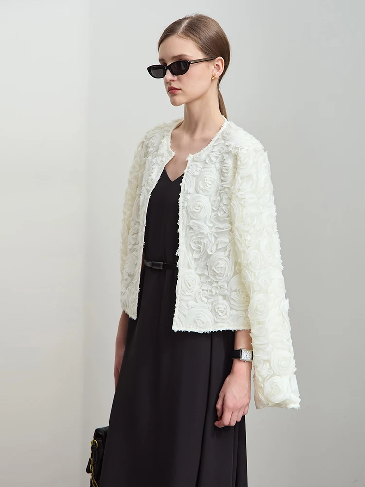 Minimalist Short Jacket for Women 2025 Spring Elegant Stereoscopic Flower O-Neck Hook Button Outwear Coat OUT1013