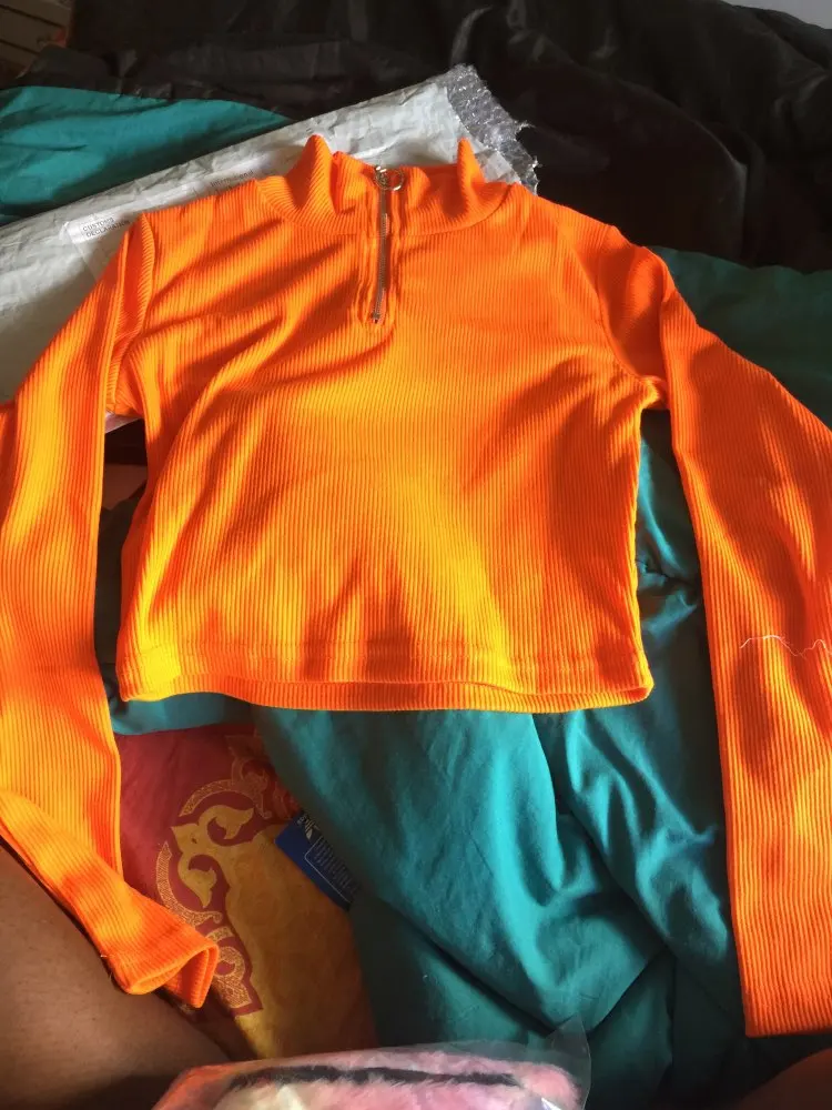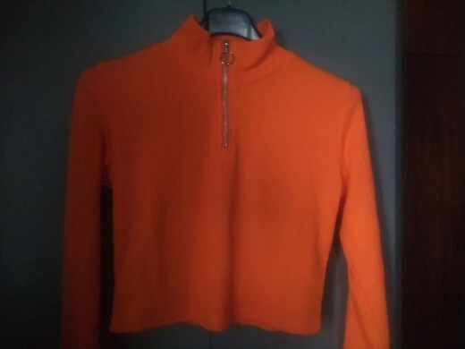 I loved! THE fabric is very good, very soft. Took a slightly larger size because like leaves the inside, but yet to leave as cropped. The colors are bright, as in description, perfect.