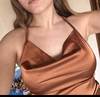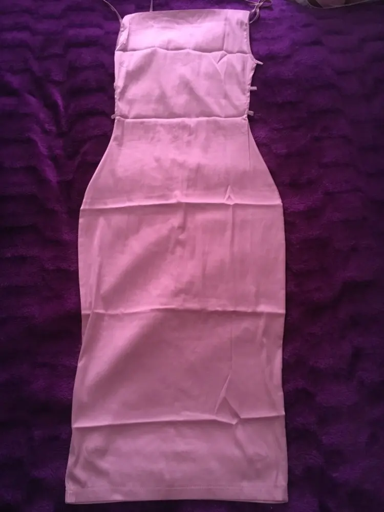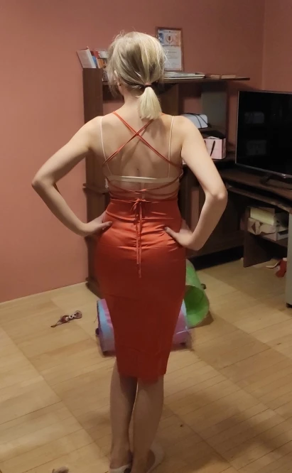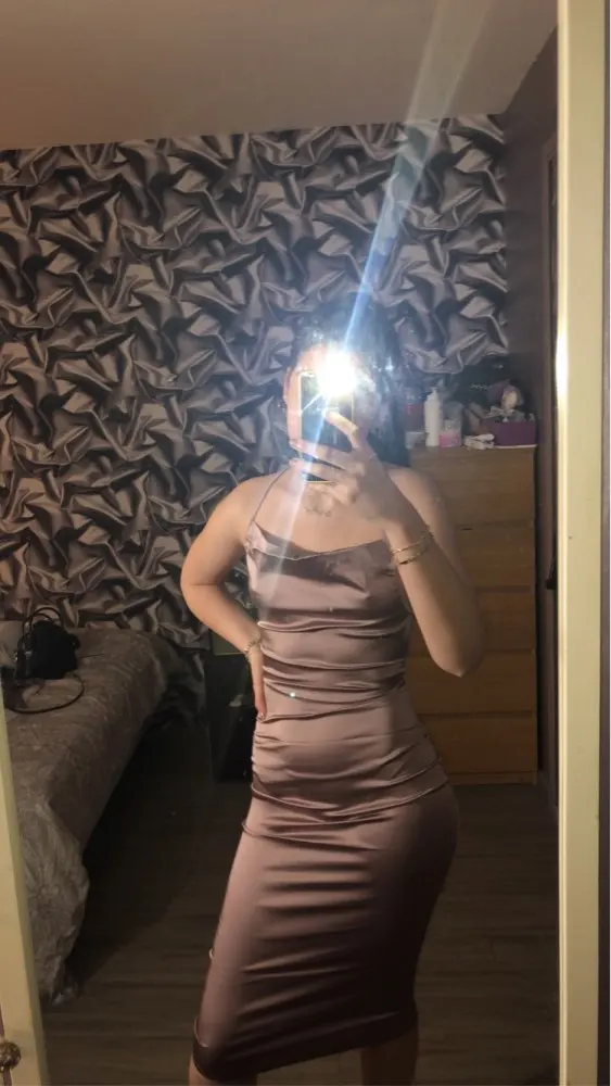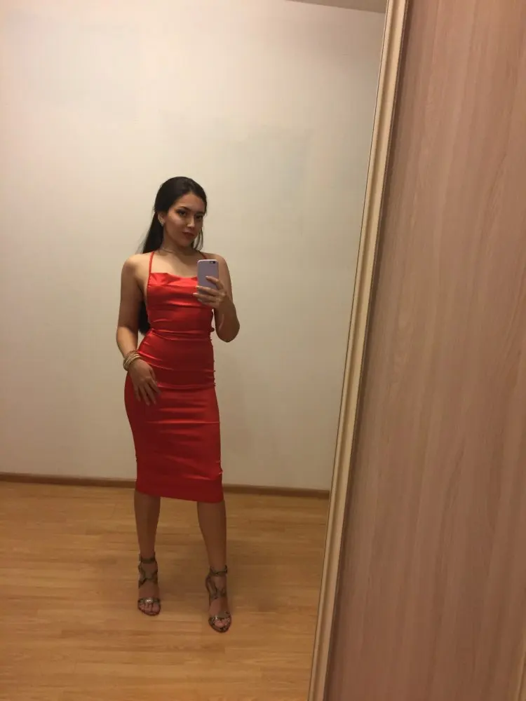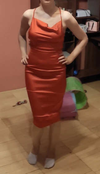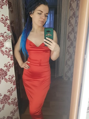 The dress is excellent! Threads do not stick out, sits well, nice satin. Matches the photo. Read reviews and ordered M, but it would be better to Village s. My parameters are 90-62-88. If you have a waist less than 65cm-take s. The dress stretches and climbs on any ass)