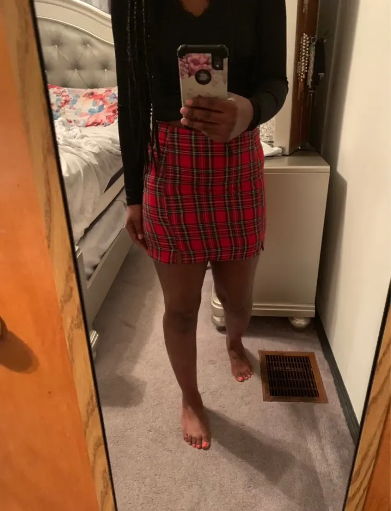 The skirt looks just like the picture it’s just tight with no stretch order a size or two up I ordered a medium I could have done a large my height is 5’8 my weight is 155 pounds