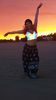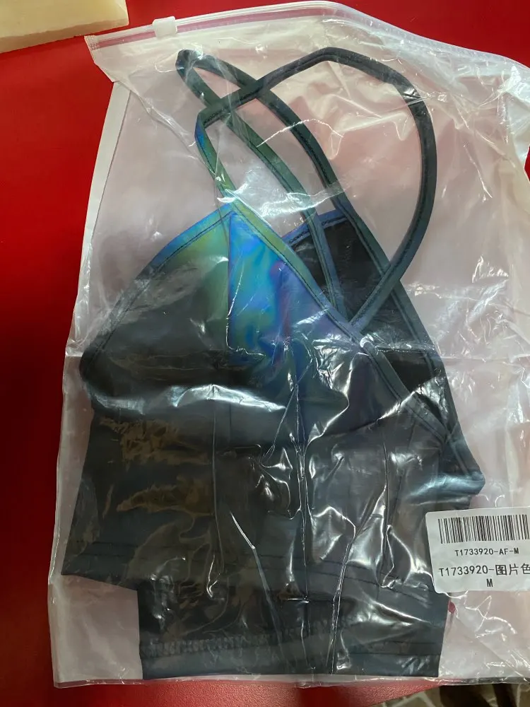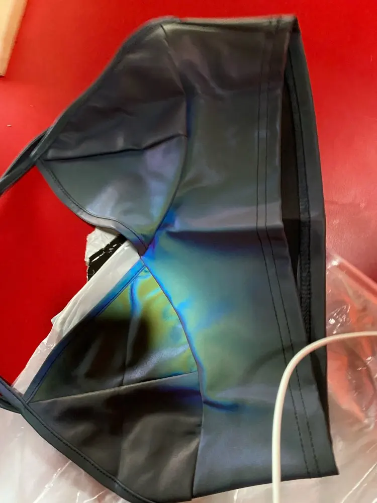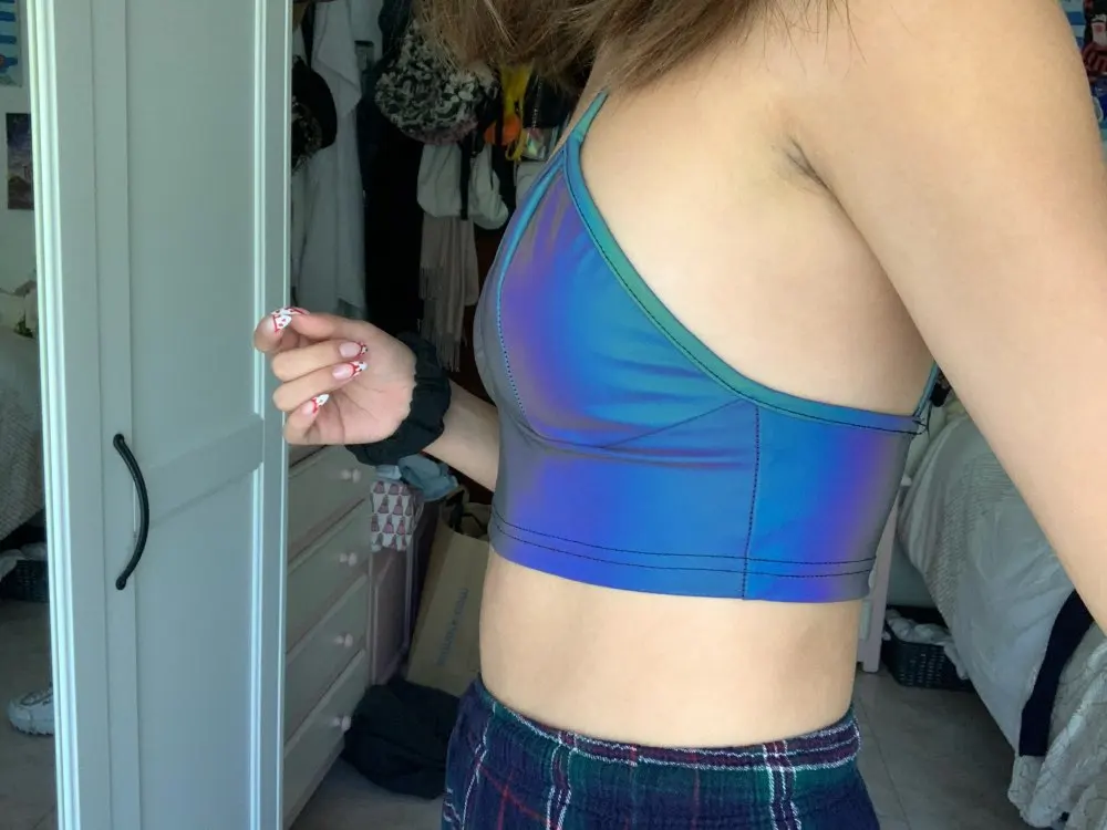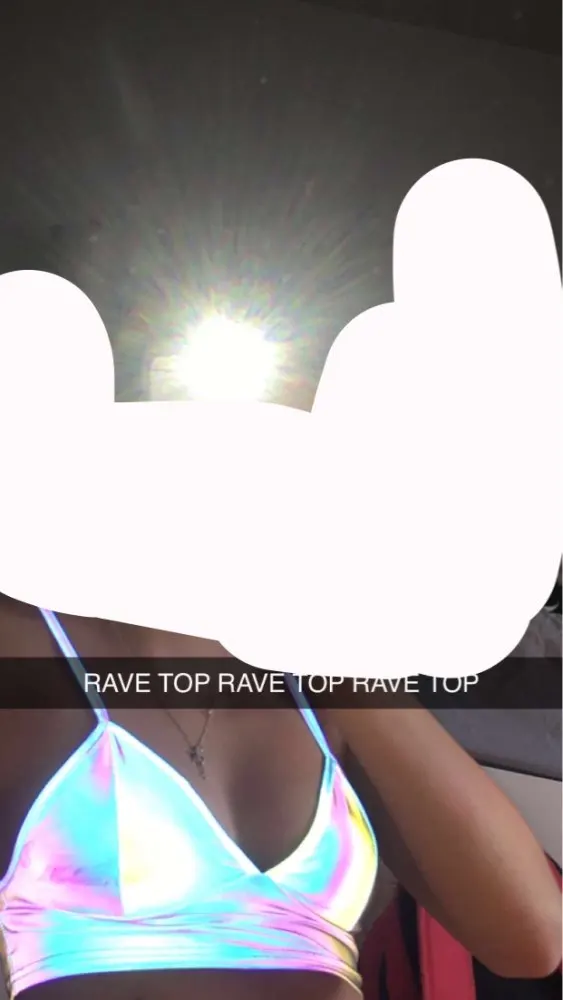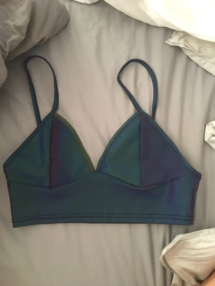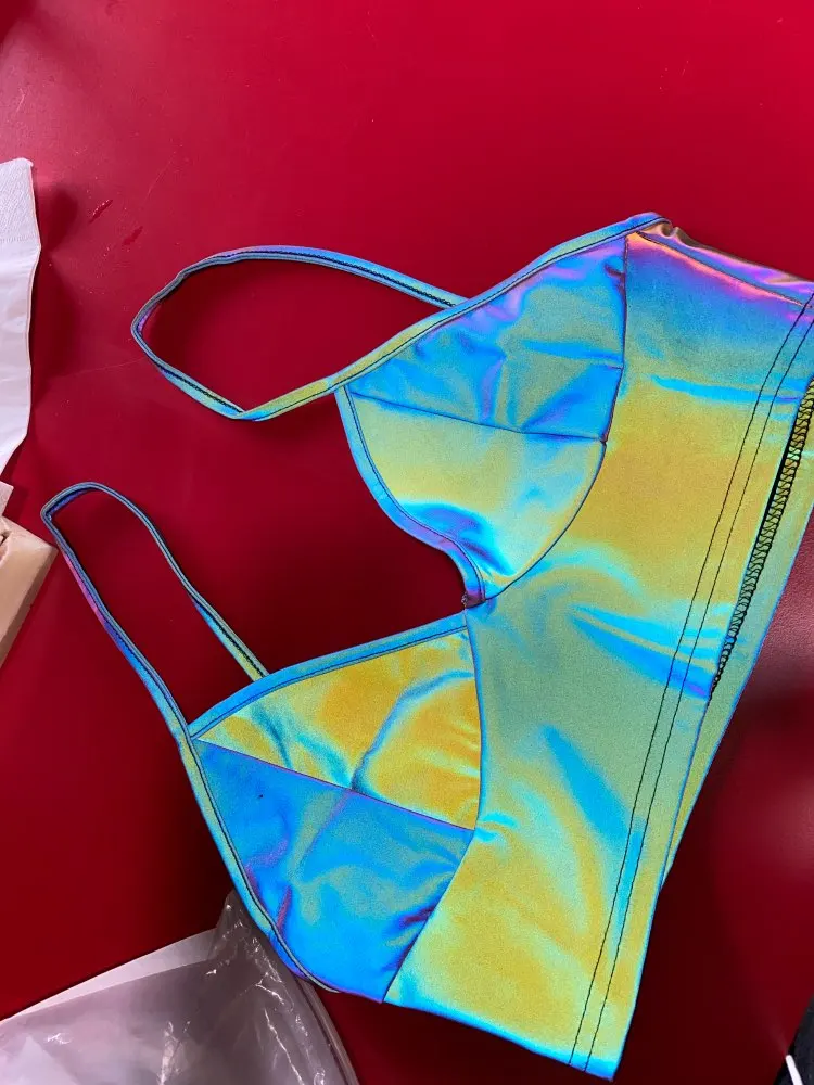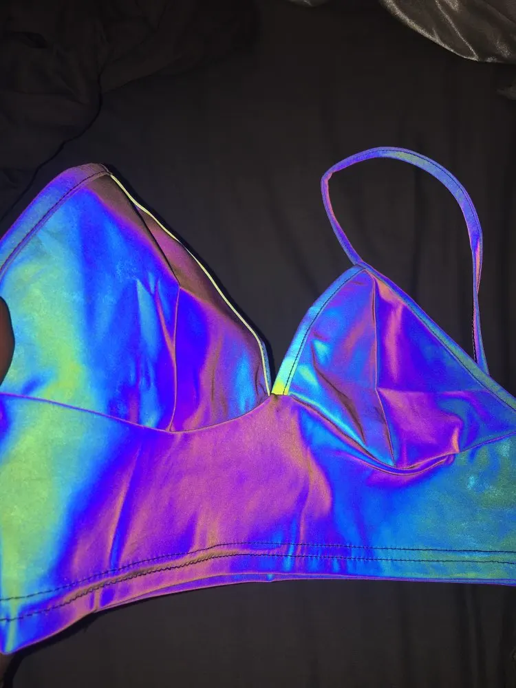 This top is so cool! Looks exactly like the pictures. Without flash it’s a navy blue green colour and with flash it reflects purple green and white. Super cool for raves. The material is a bit stiff but definitely wearable.