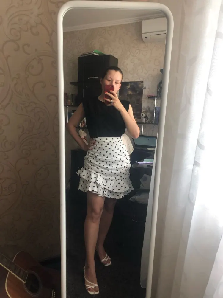Skirt as in the photo of the store. On the hips 100 took the size L, so that the length was adequate. She sat down well, but what you see in my photo, I went to the waist. There was a very large stock) on another type of figure, maybe, and do not have to suture. And so the fabric and sewing are excellent, I will wear it with pleasure.