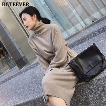 Women Sweater Knit Dress Turtleneck Full Sleeve Sashes