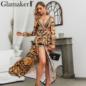 Boho Dress Summer Elegant Maxi Dress Vintage V Neck Split Long Sleeve Paisley L0299