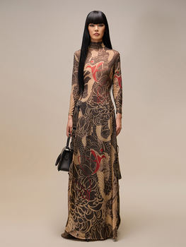 FREE SHIPPING Elegant Koi Fish And Leaf Printed Women Mesh Maxi Dress Turtleneck OUT1106