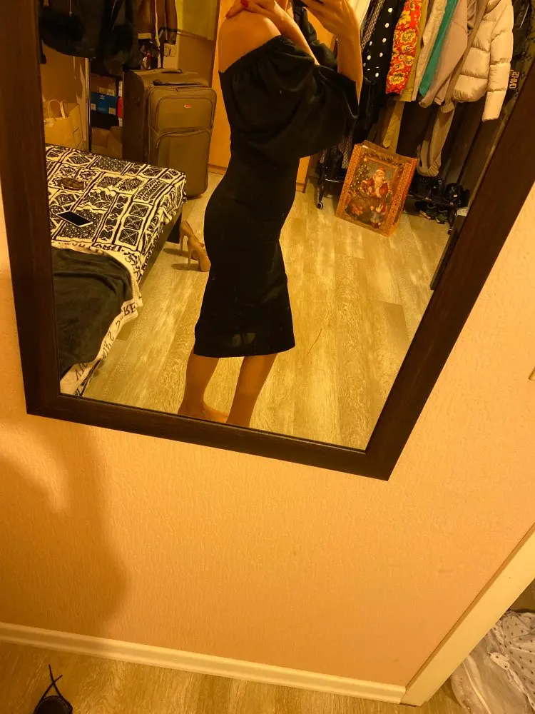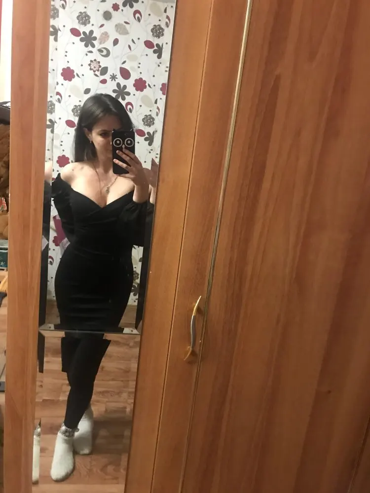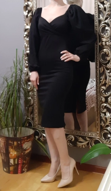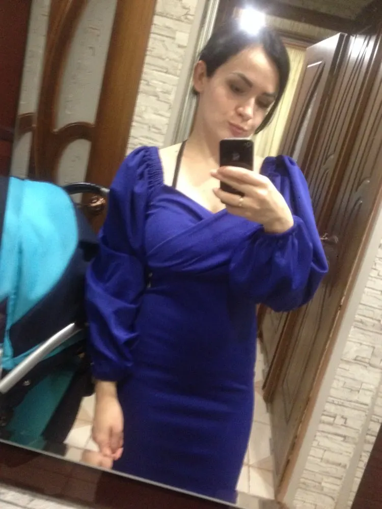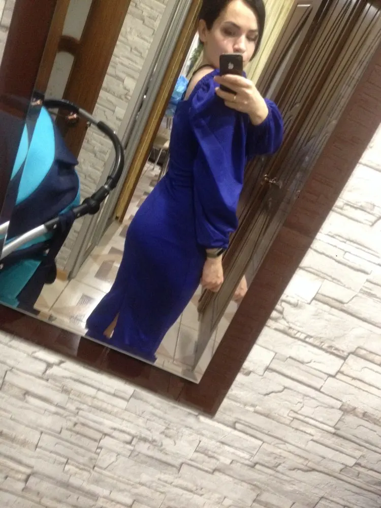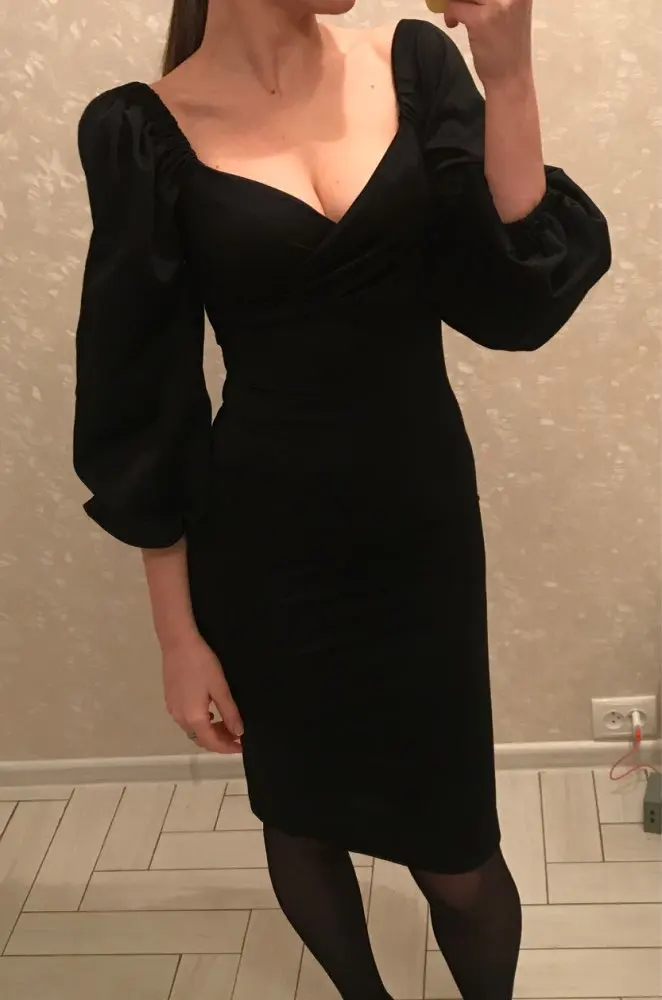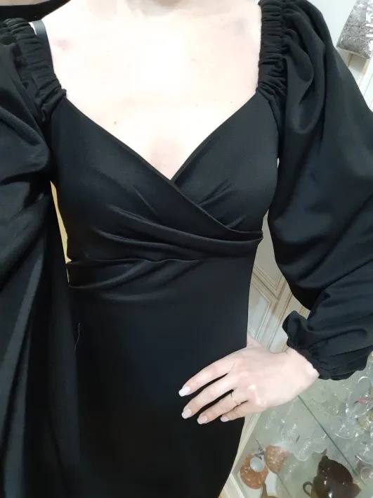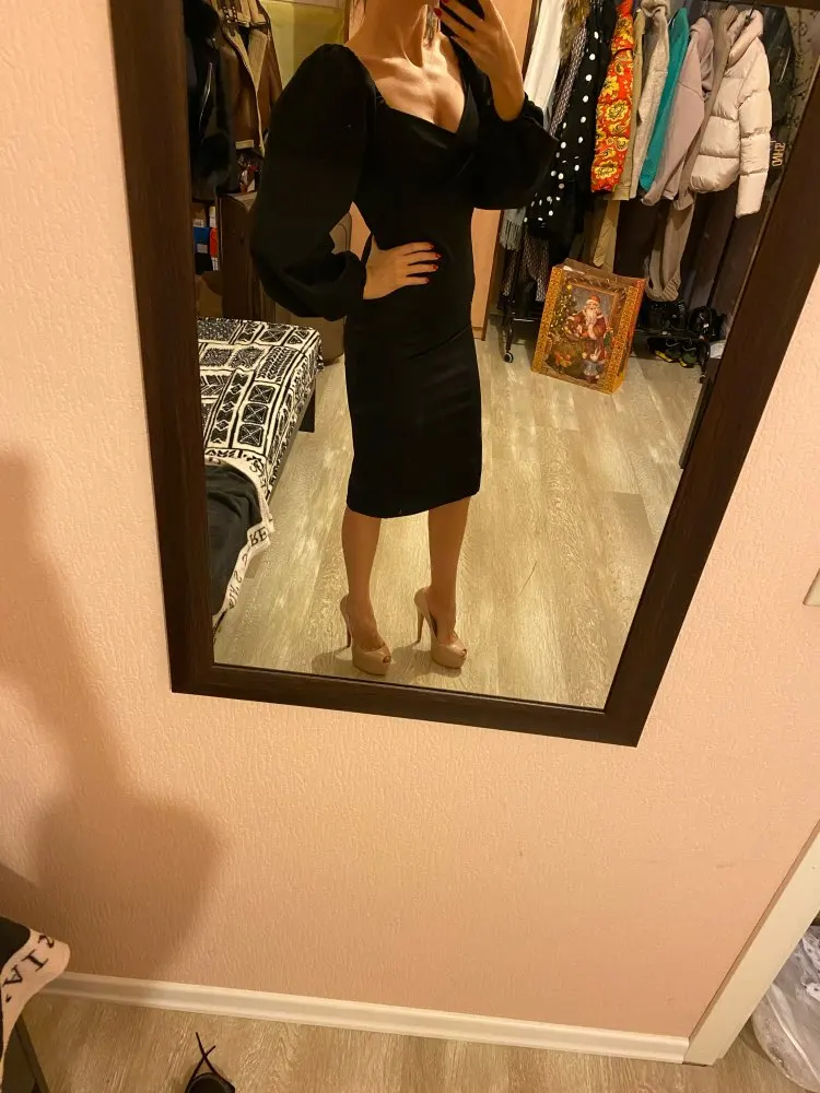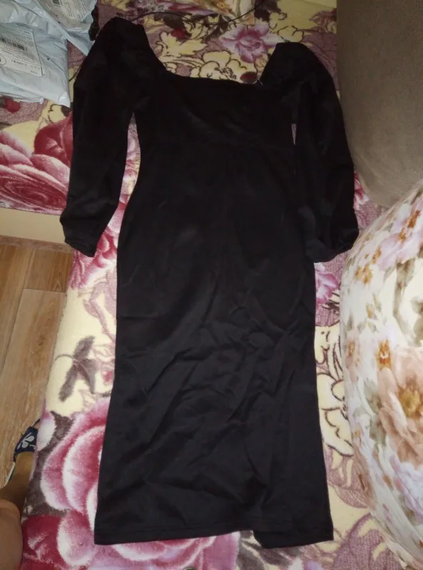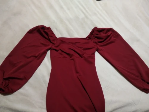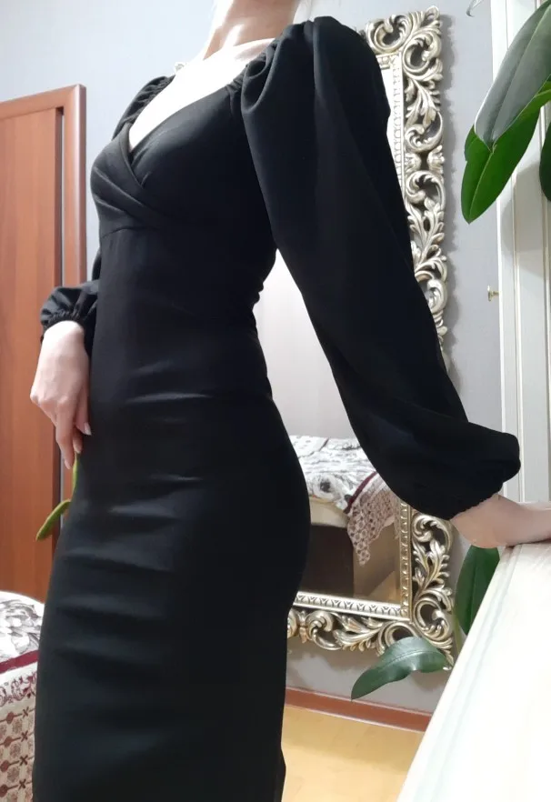 Evening dress, fitted silhouette, with a flirty neckline on the chest, long sleeves with lanterns that hold on the shoulders thanks to rubber bands, behind the dress is a regular square neckline. At the bottom of the skirt behind the slot. Material: Polyester, spandex, not thin, nice to wear. Sewing perfect, no strings and curves seams. On the dress there was a store tag, on the wrong side there is information about the composition of the fabric and the size. Waited for the parcel 20 days, the track was tracked all the way, the dress was packed in the postal package and zip package. The dress fascinated, thanks to the store.