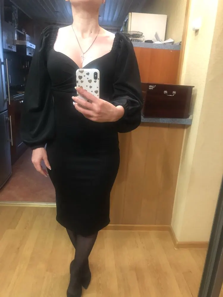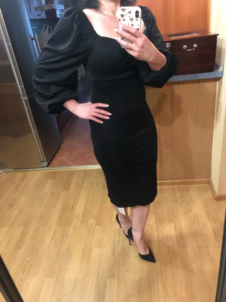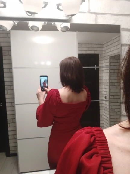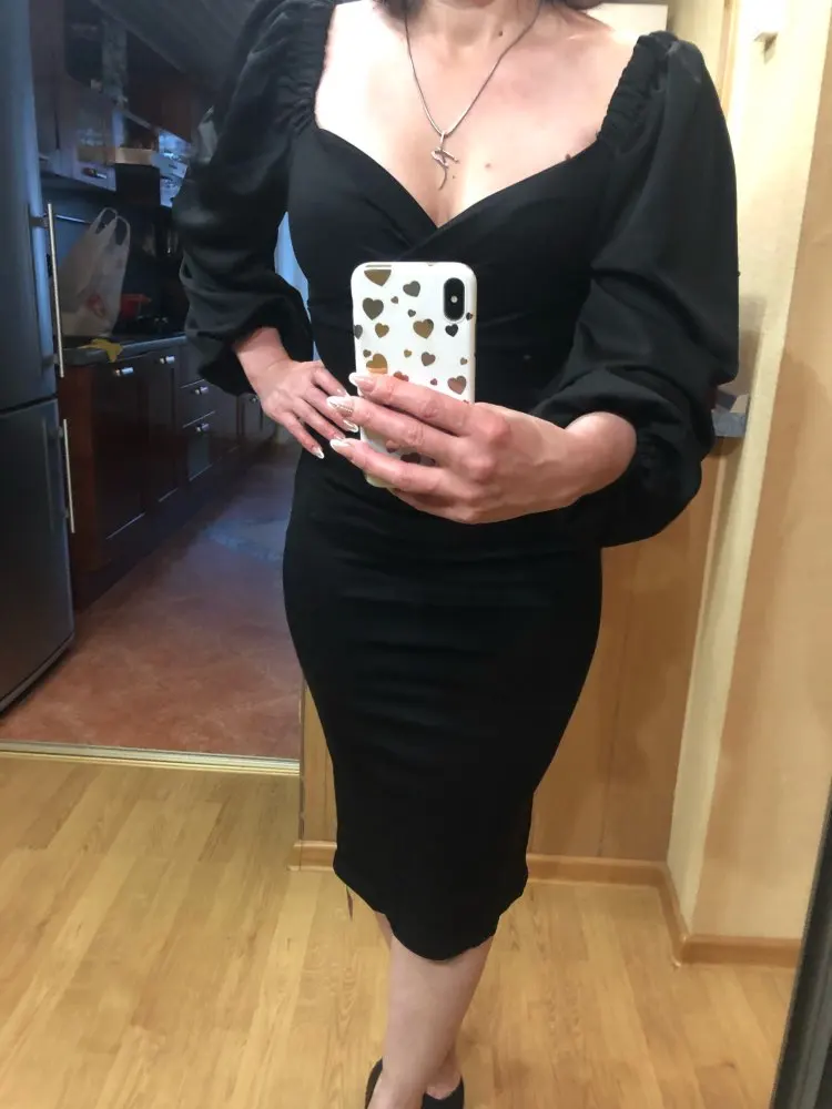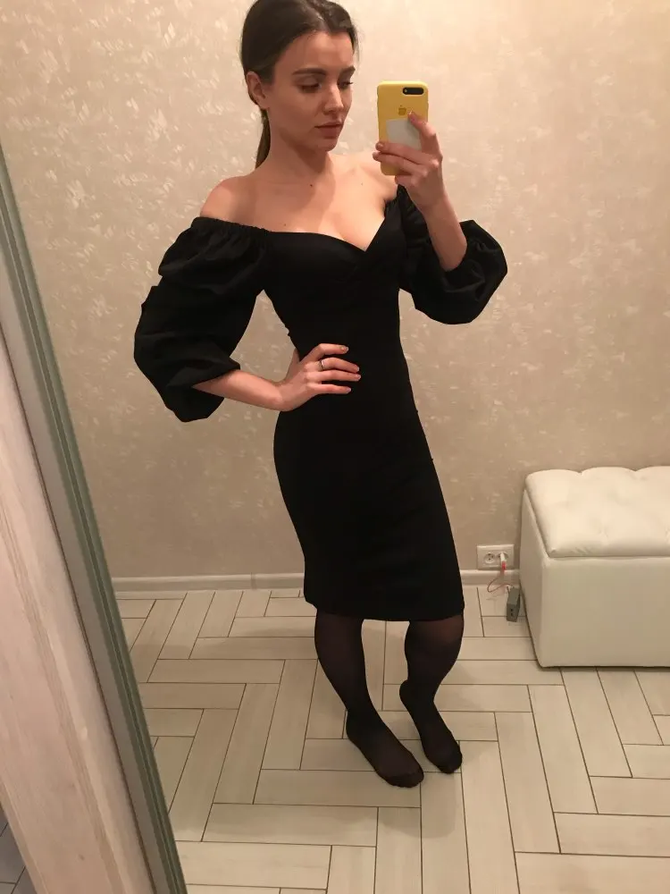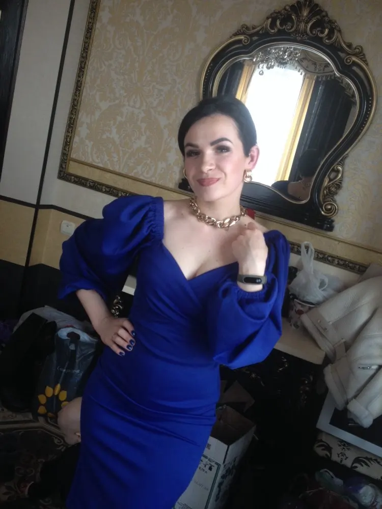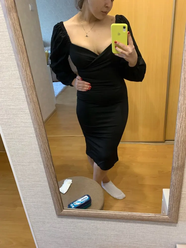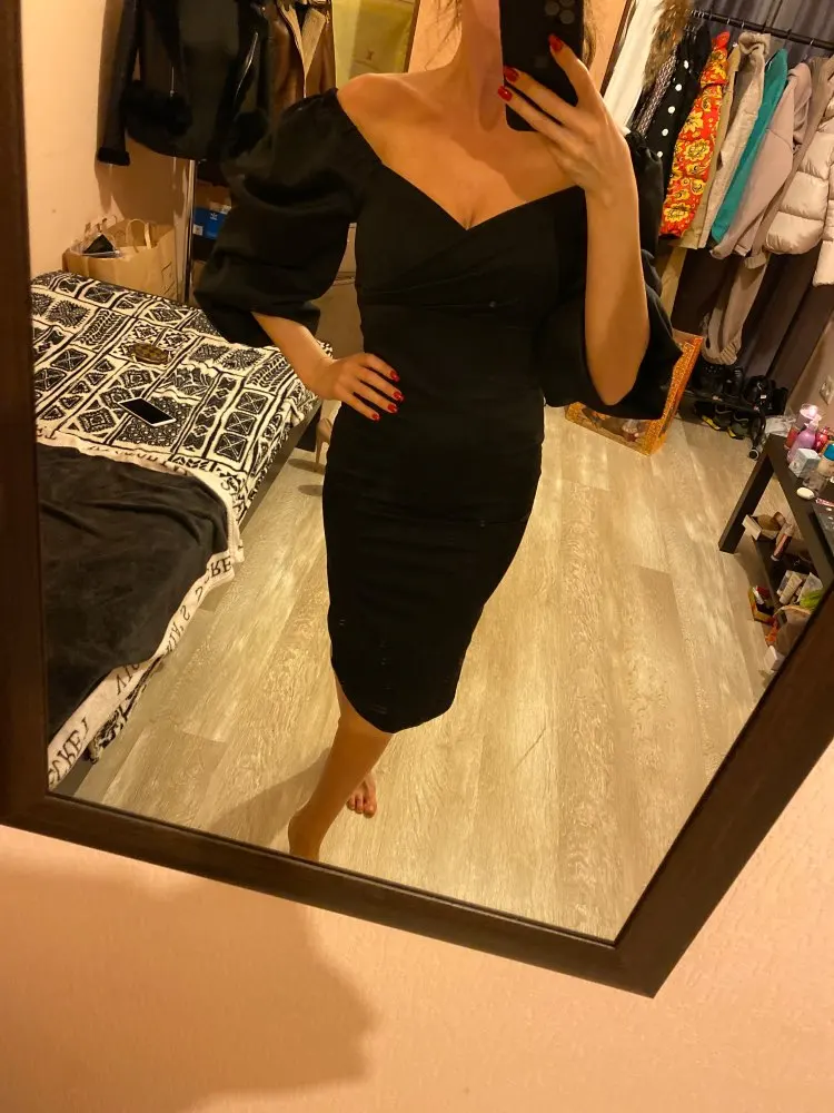 Evening dress, fitted silhouette, with a flirty neckline on the chest, long sleeves with lanterns that hold on the shoulders thanks to rubber bands, behind the dress is a regular square neckline. At the bottom of the skirt behind the slot. Material: Polyester, spandex, not thin, nice to wear. Sewing perfect, no strings and curves seams. On the dress there was a store tag, on the wrong side there is information about the composition of the fabric and the size. Waited for the parcel 20 days, the track was tracked all the way, the dress was packed in the postal package and zip package. The dress fascinated, thanks to the store.