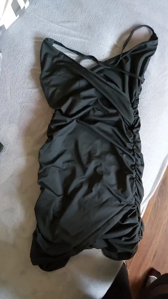 Exactly as on picture. Measures: 171 cm/ 67 kg/ 94-74-99 cm I didn't know it was a little lift up when I took the shot.