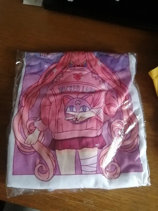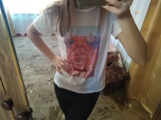 The parcel came quickly-in 17 days.) the quality of the T-shirt and the print is very pretty. Definitely recommend! I took the size L that would be spacious-I did not guess:>