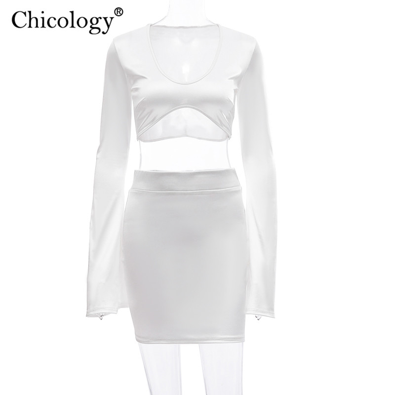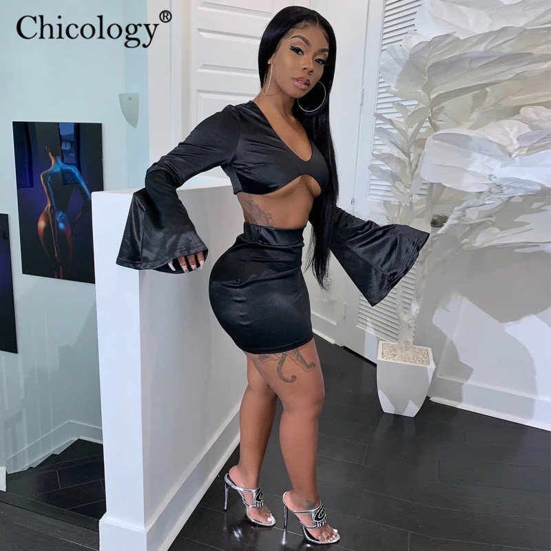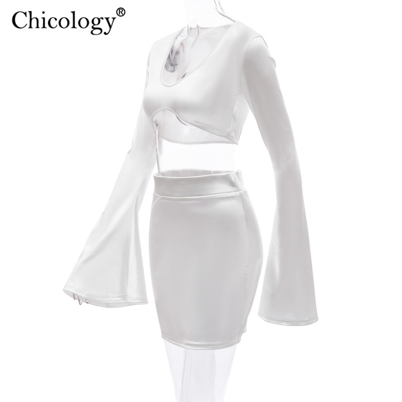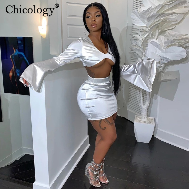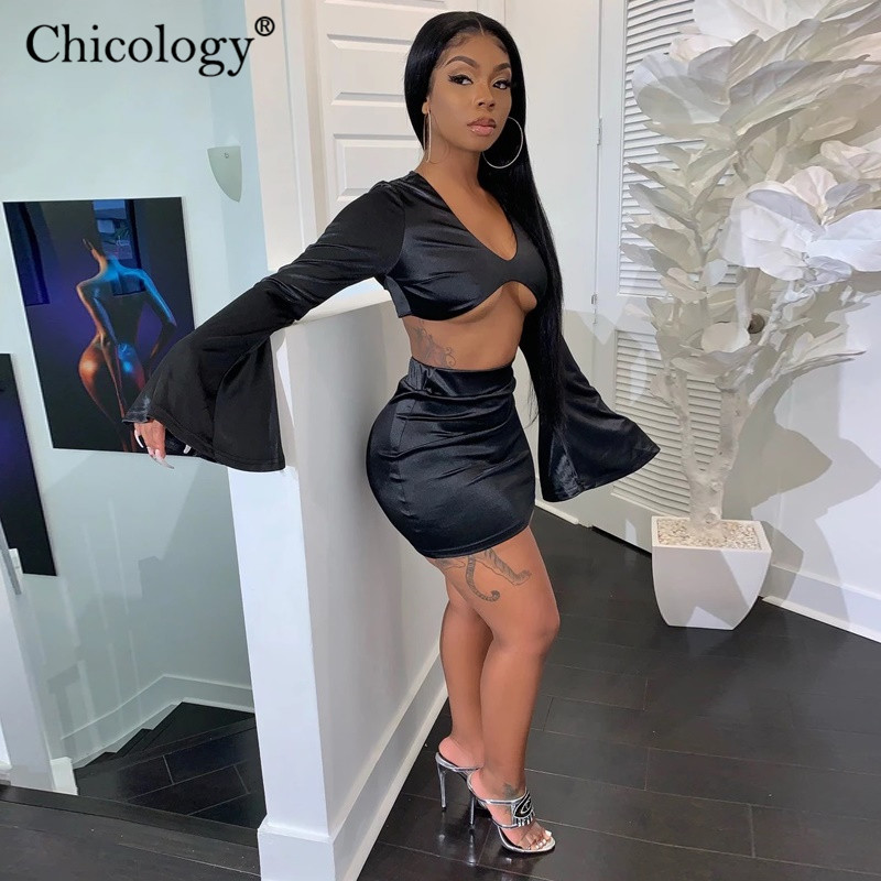 Satin Flare Long Sleeve Two Piece Matching Set Women Crop Top High Waist Mini Skirt L0167