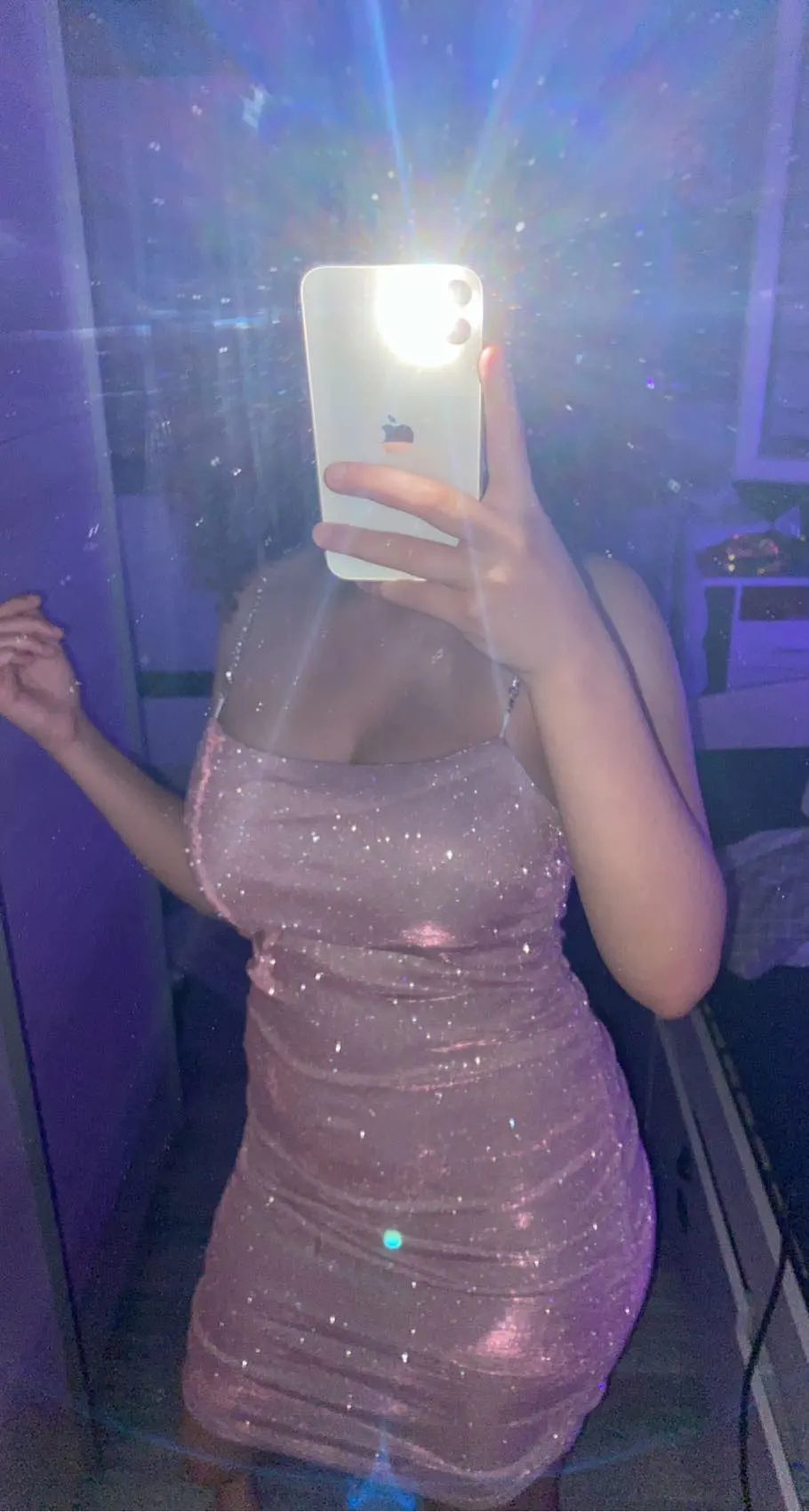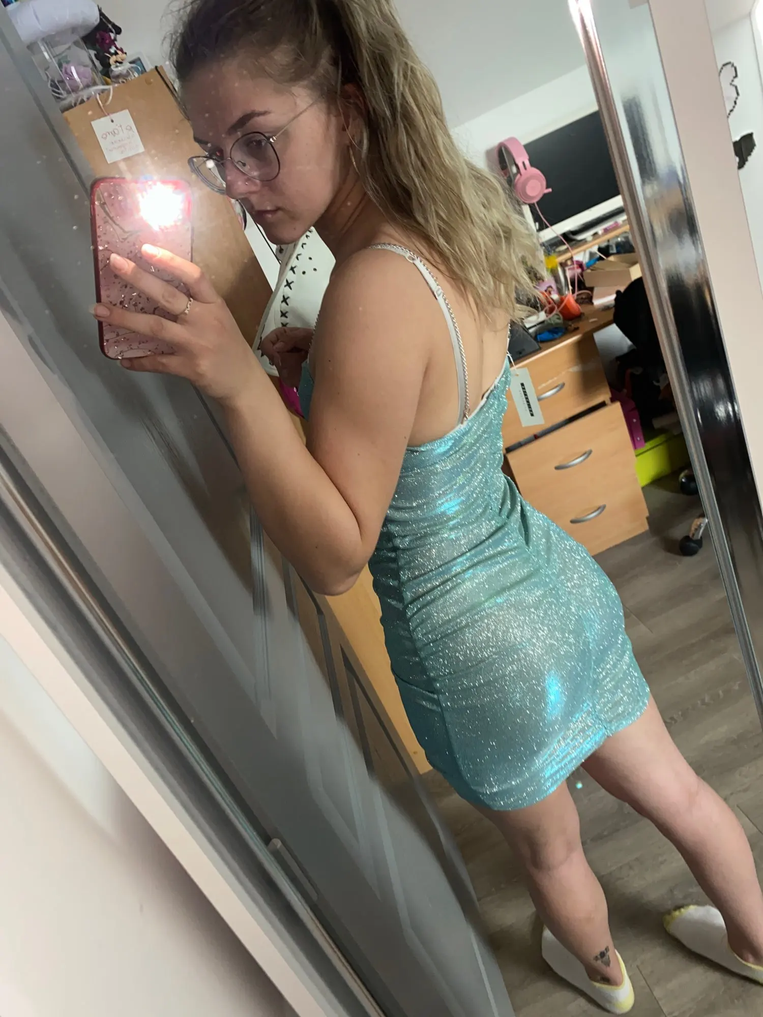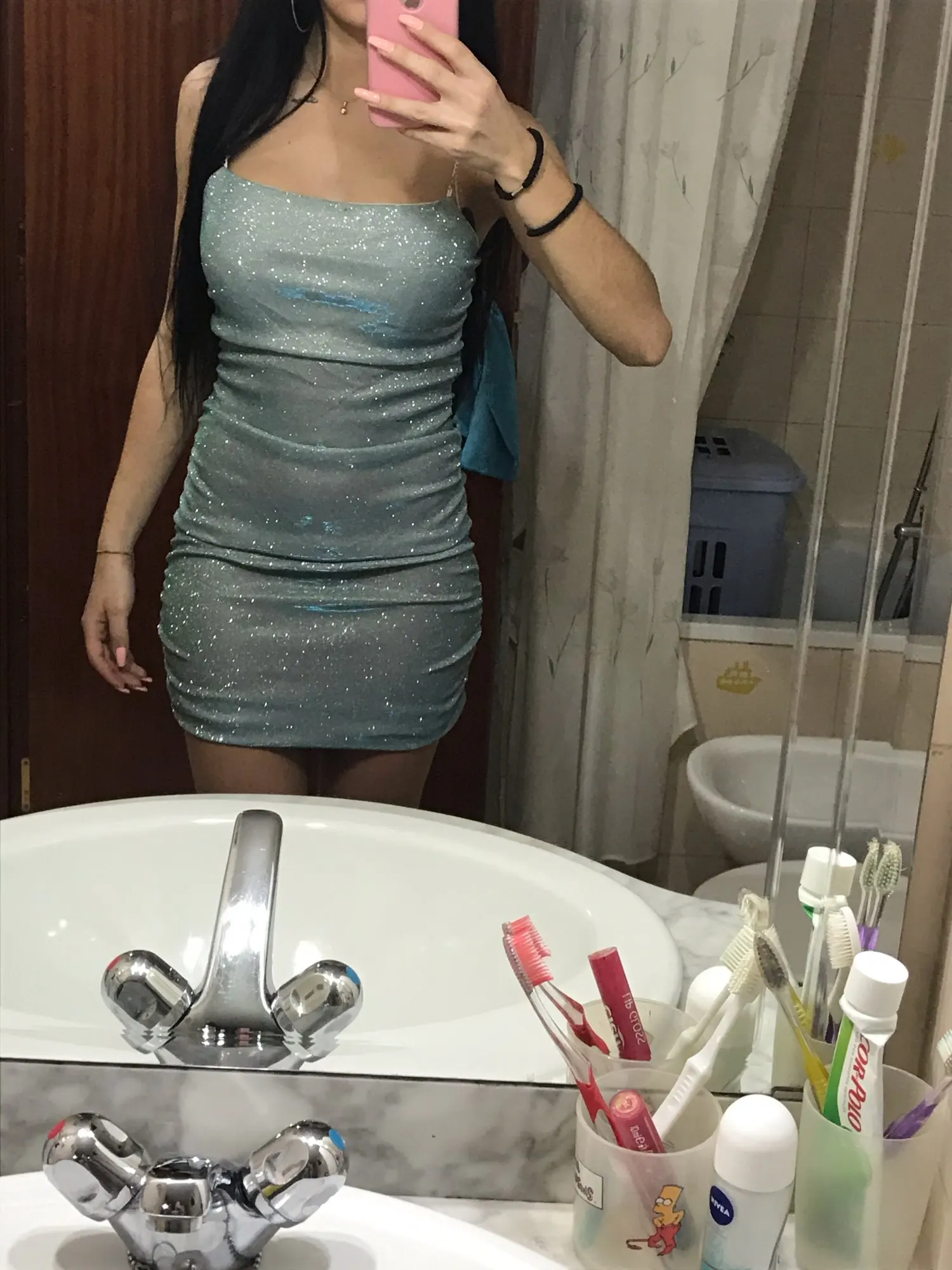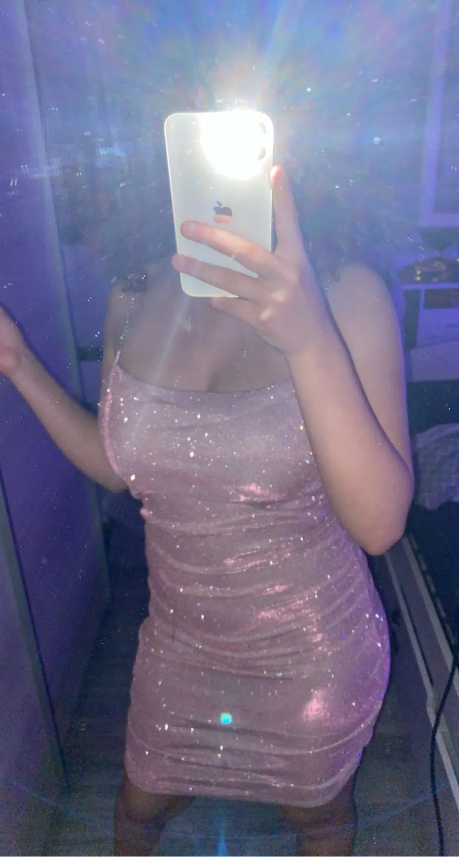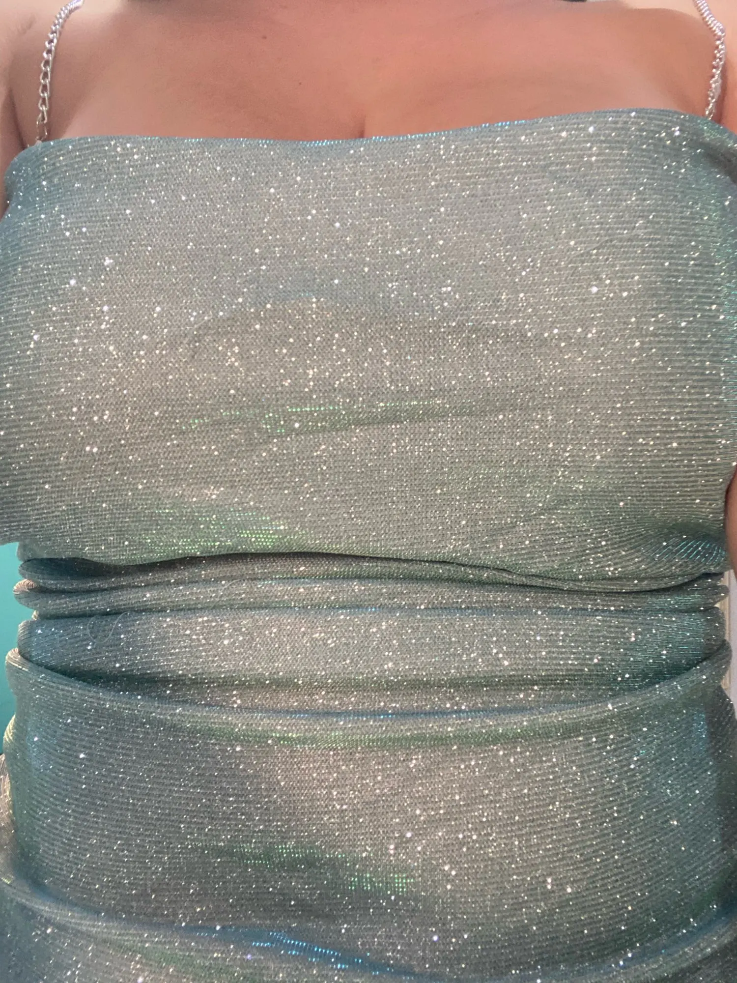 Is super duper cute,so sparkly and cute the sparkles so come off everywhere and is not as short as thought it was in the picture still love it though super cute !!!