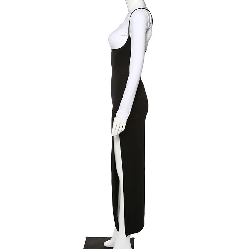 Sexy Black High Waisted A Line Suspender High Split Maxi Skirt