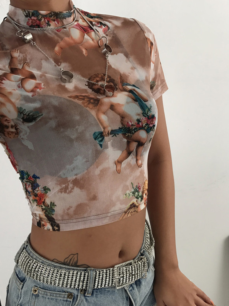 Sexy Mesh Crop Top Shirt Angel Print High Neck Short Sleeve OUT1076