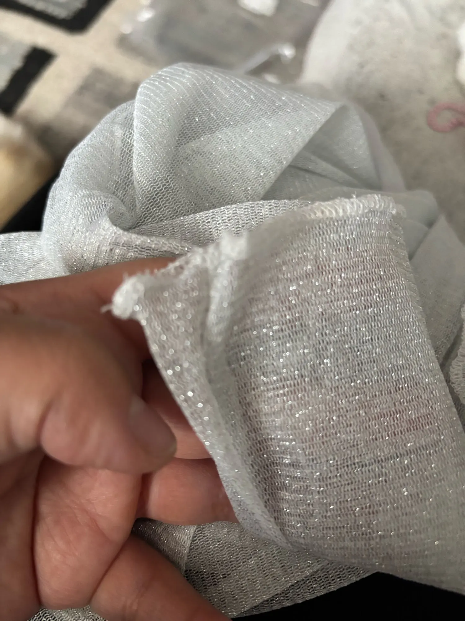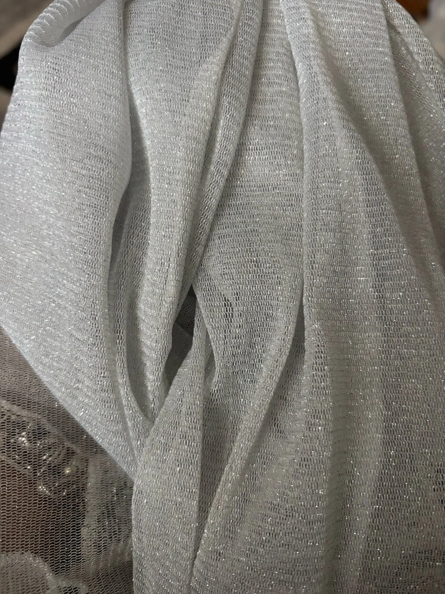 It is white with silver threads. It is good for a cold subton. It is very soft and does not prude. Shines.