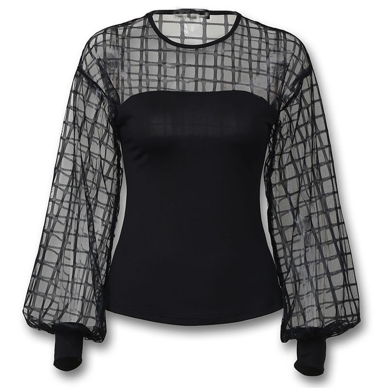 Sheer Grid Mesh Casual Shirt Long Sleeve Tops Blouse Black Plaid